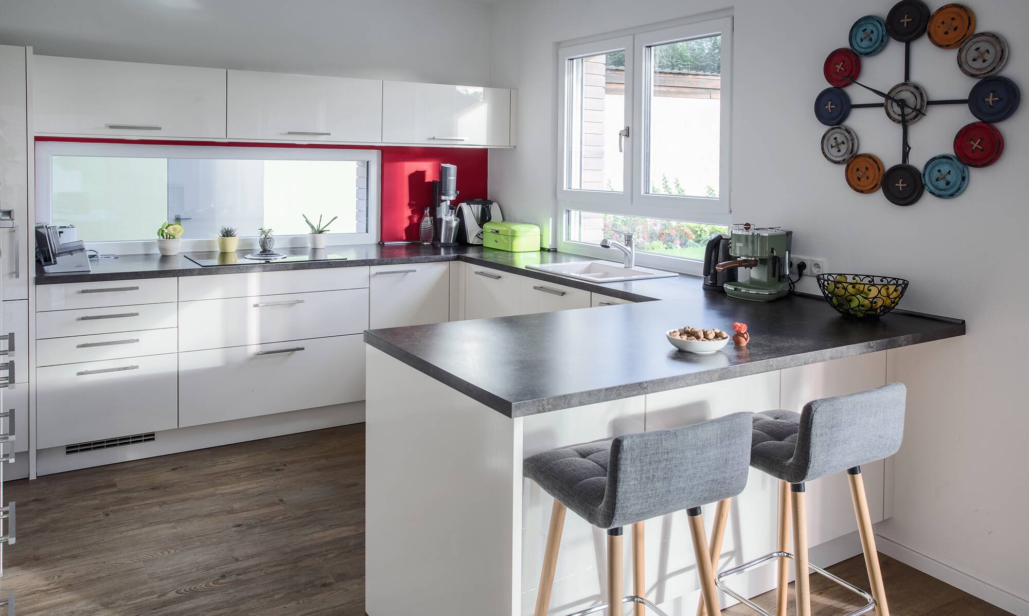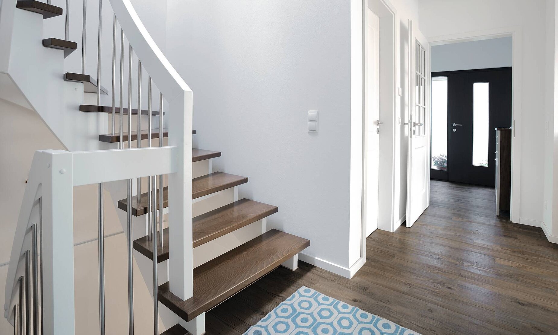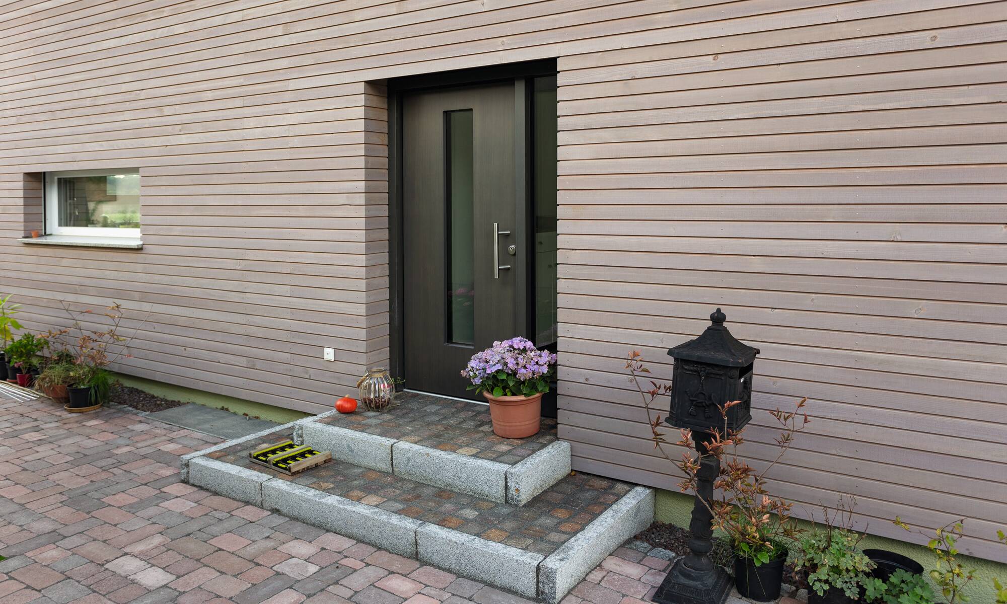 Für ein Haus aus unserer Baureihe generation5.5 hat sich diese Familie entschieden. Das Fertighaus verfügt über anderthalb Geschosse und ist außen komplett mit Holz verschalt. In Kombination mit den sichtbaren Pfetten und dem Dachüberstand in Weiß verleiht die helle Holzverschalung dem Einfamilienhaus ein freundliches Erscheinungsbild. Das Satteldach mit drittem Giebel ist mit Betondachsteinen eingedeckt. Haussockel und Doppelgarage wurden in einem zarten Grünton gestrichen.