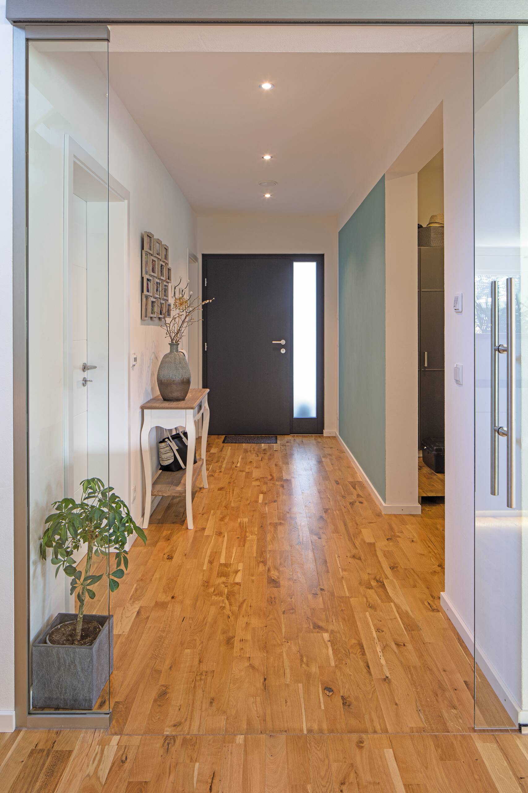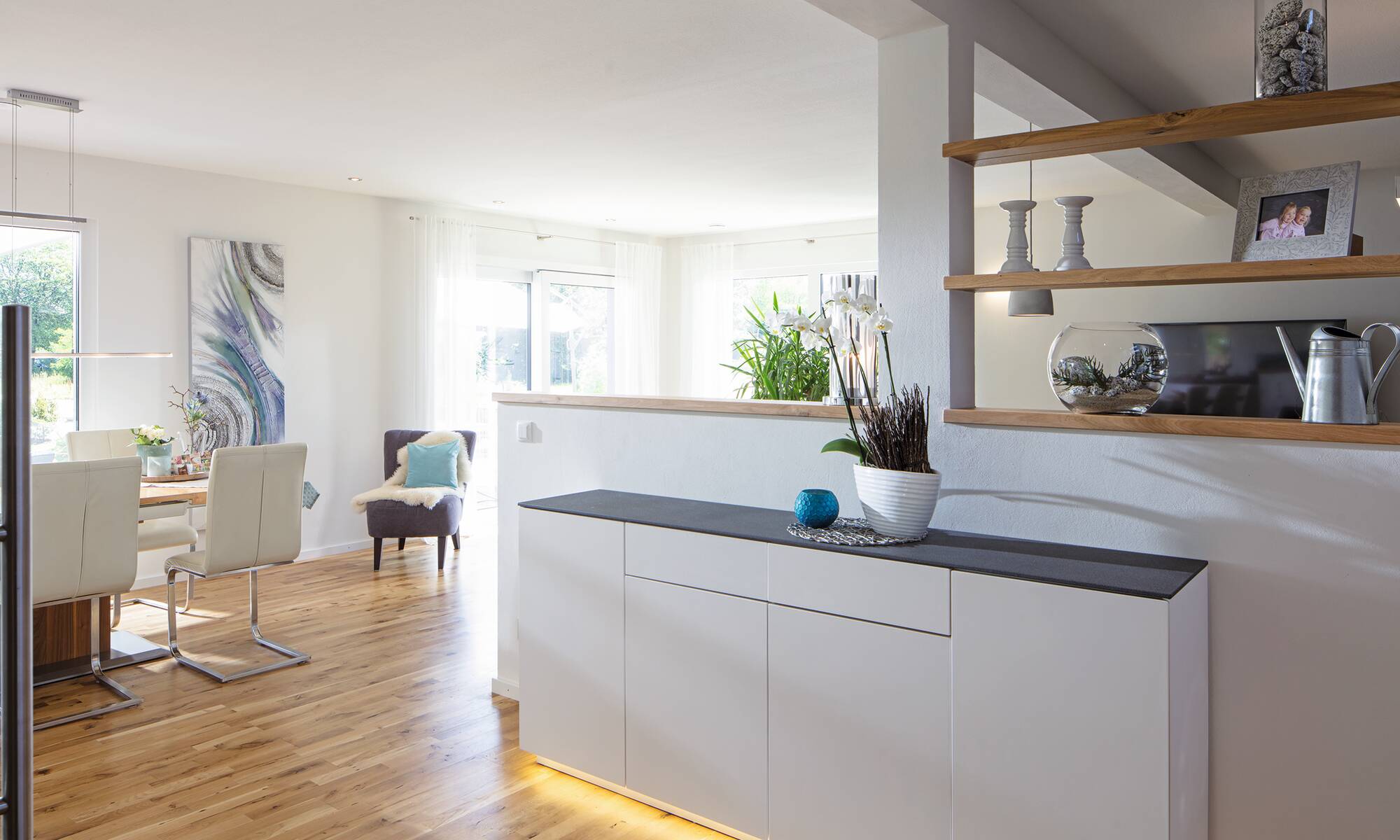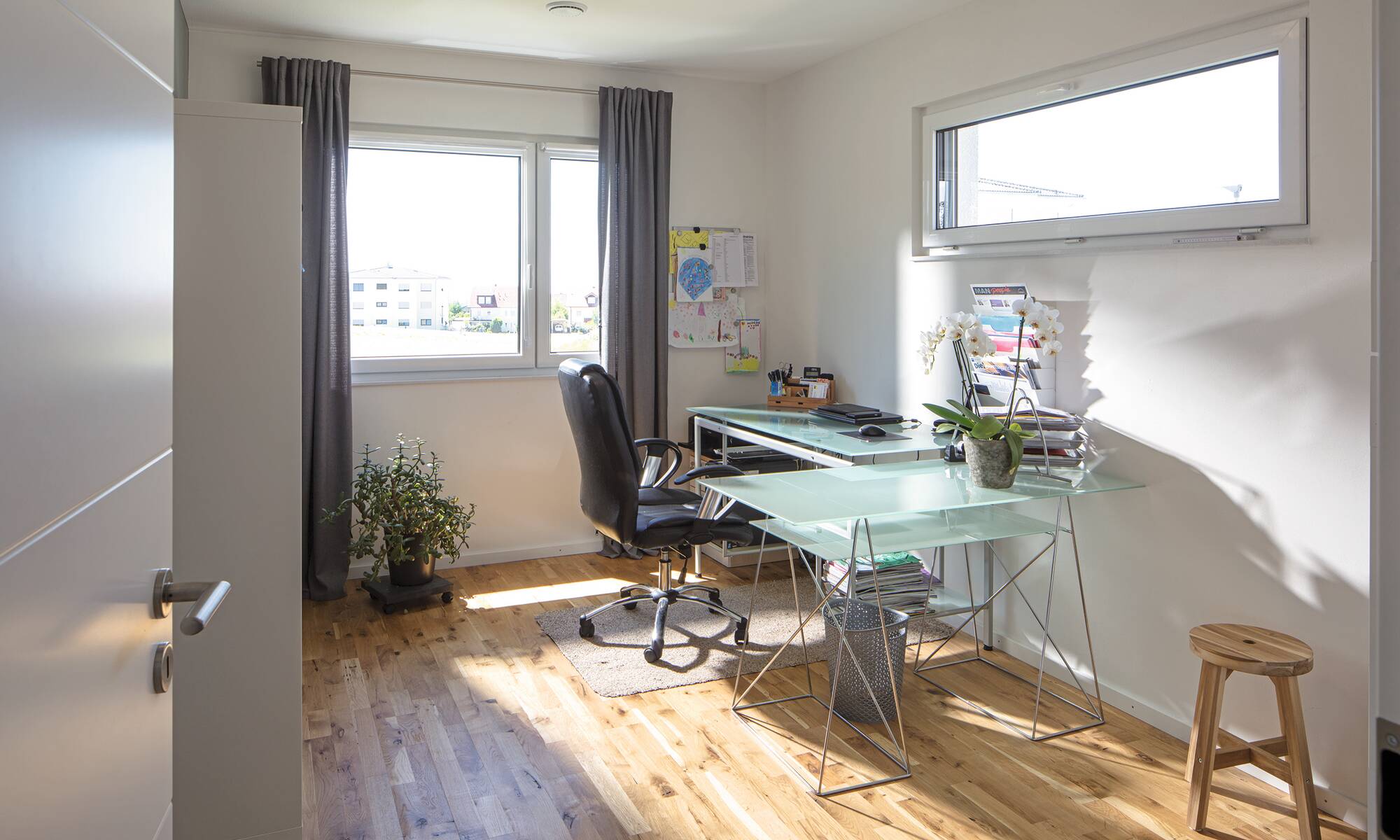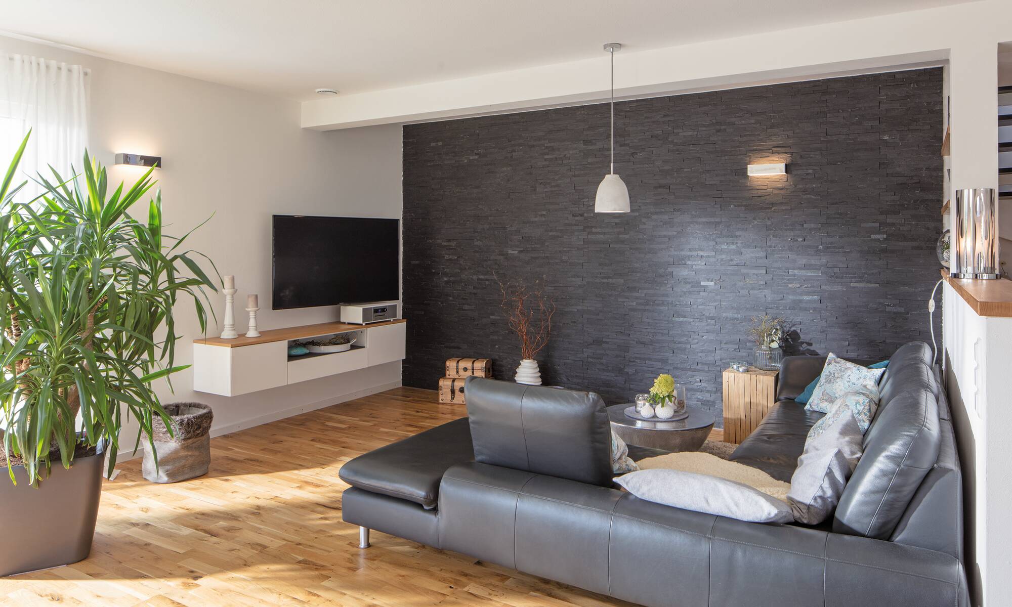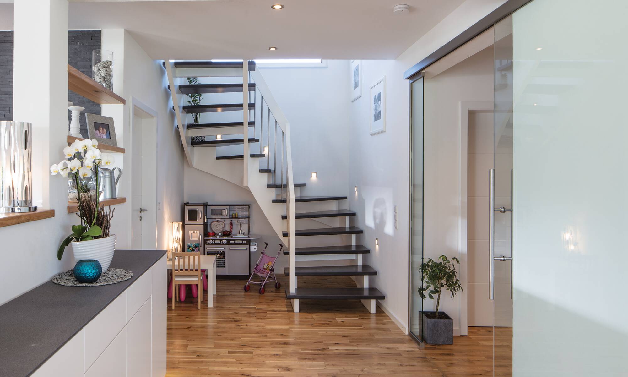Den großen Wunsch nach mehr Platz konnte sich die vierköpfige Familie mit ihrem Traumhaus aus der Baureihe generation5.5 mit zwei Vollgeschossen erfüllen. Die Bauherren setzten bei der Außenfassade auf einen stilvollen, weißen Putz. In Verbindung mit den anthrazitgrauen Fensterrahmen und dem Walmdach wirkt das Einfamilienhaus zeitlos modern.Das Stadthaus bietet mit rund 210 Quadratmetern genügend Wohnfläche. Mit der Photovoltaik-Anlage auf dem Dach erzeugen die Hausbesitzer ihren eigenen Strom.