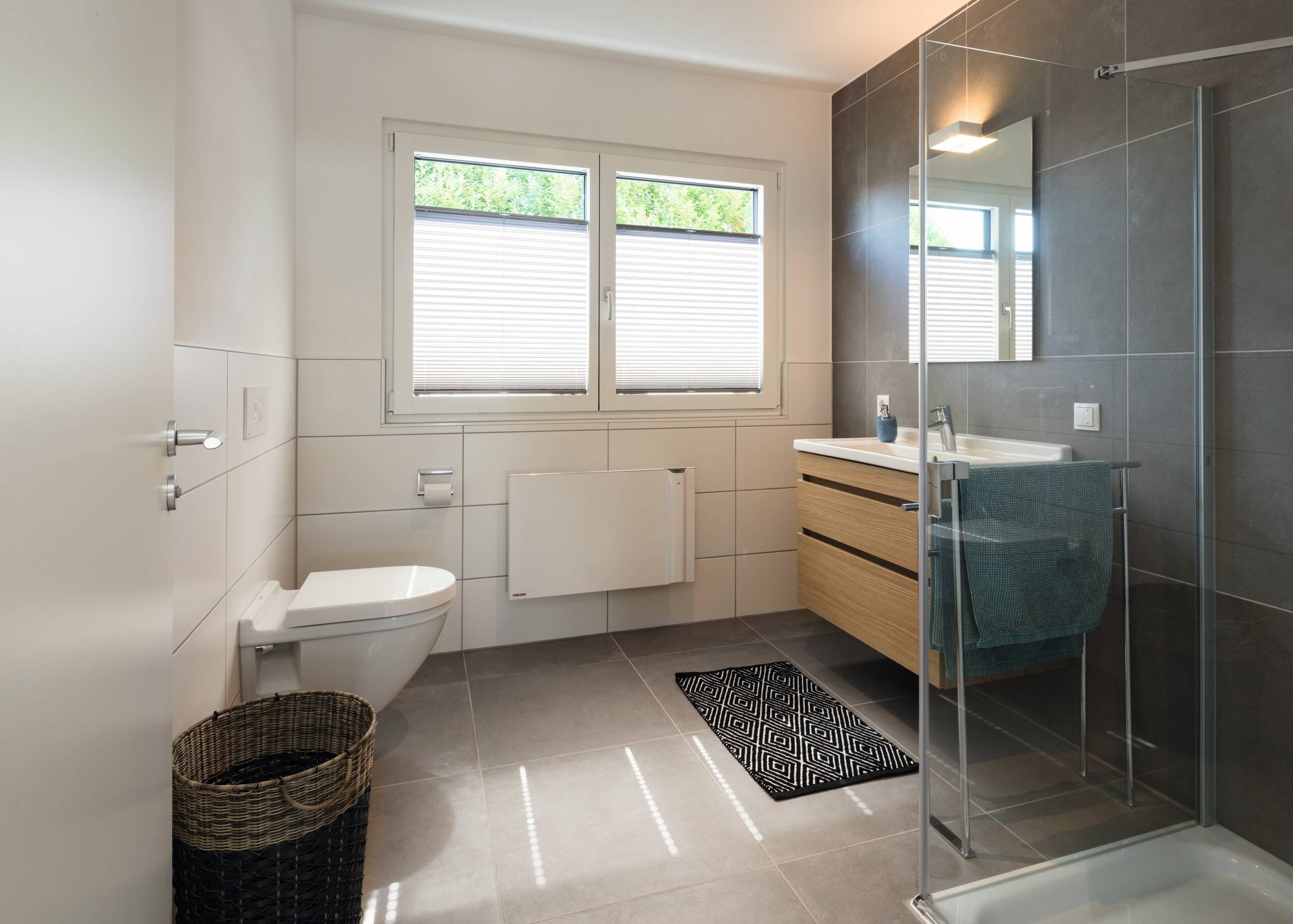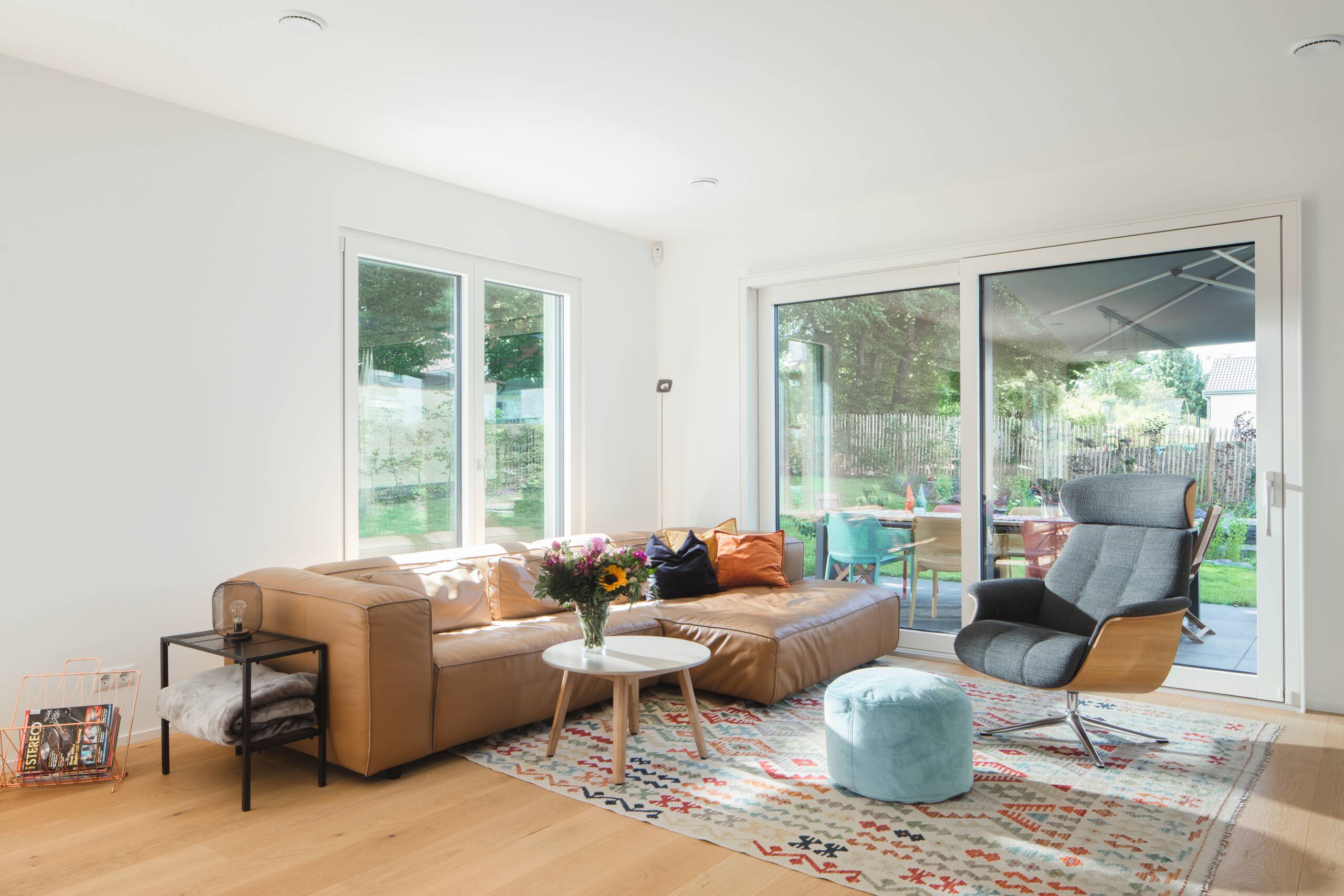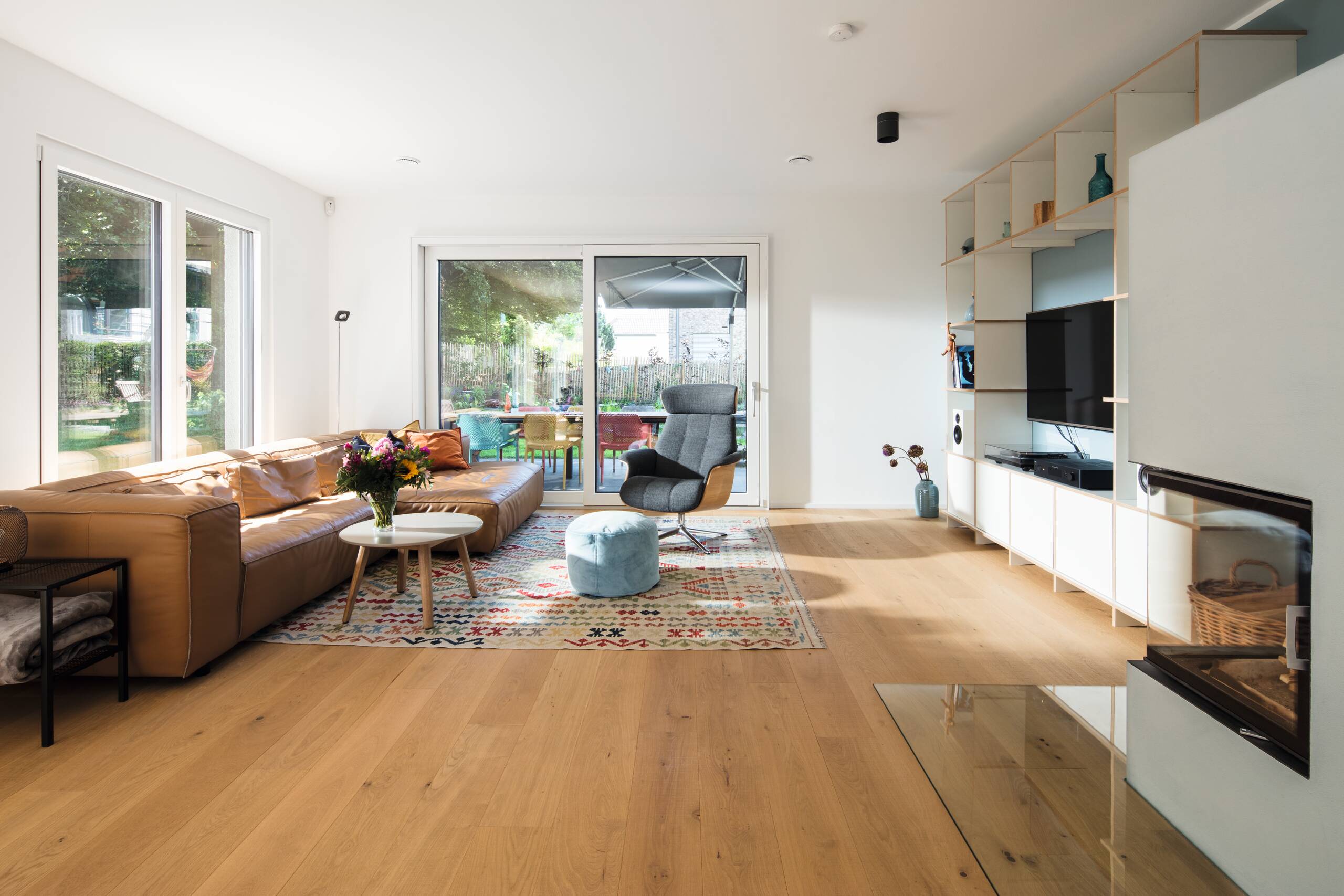 Grundlage für dieses Einfamilienhaus ist die Baureihe generation5.5. Die Bauherren wünschten sich ein Haus mit klaren Linien und rechten Winkeln, weshalb sie sich logischerweise für ein Flachdach entschieden. Bei der Fassadengestaltung haben sich die Bauherren für einen Greigeton, eine Mischung aus Beige und Grau, entschieden. So fügt sich das zweigeschossige Haus gut in die natürliche Umgebung ein. Aufgelockert wird die Fassade durch eine Holzverschalung.