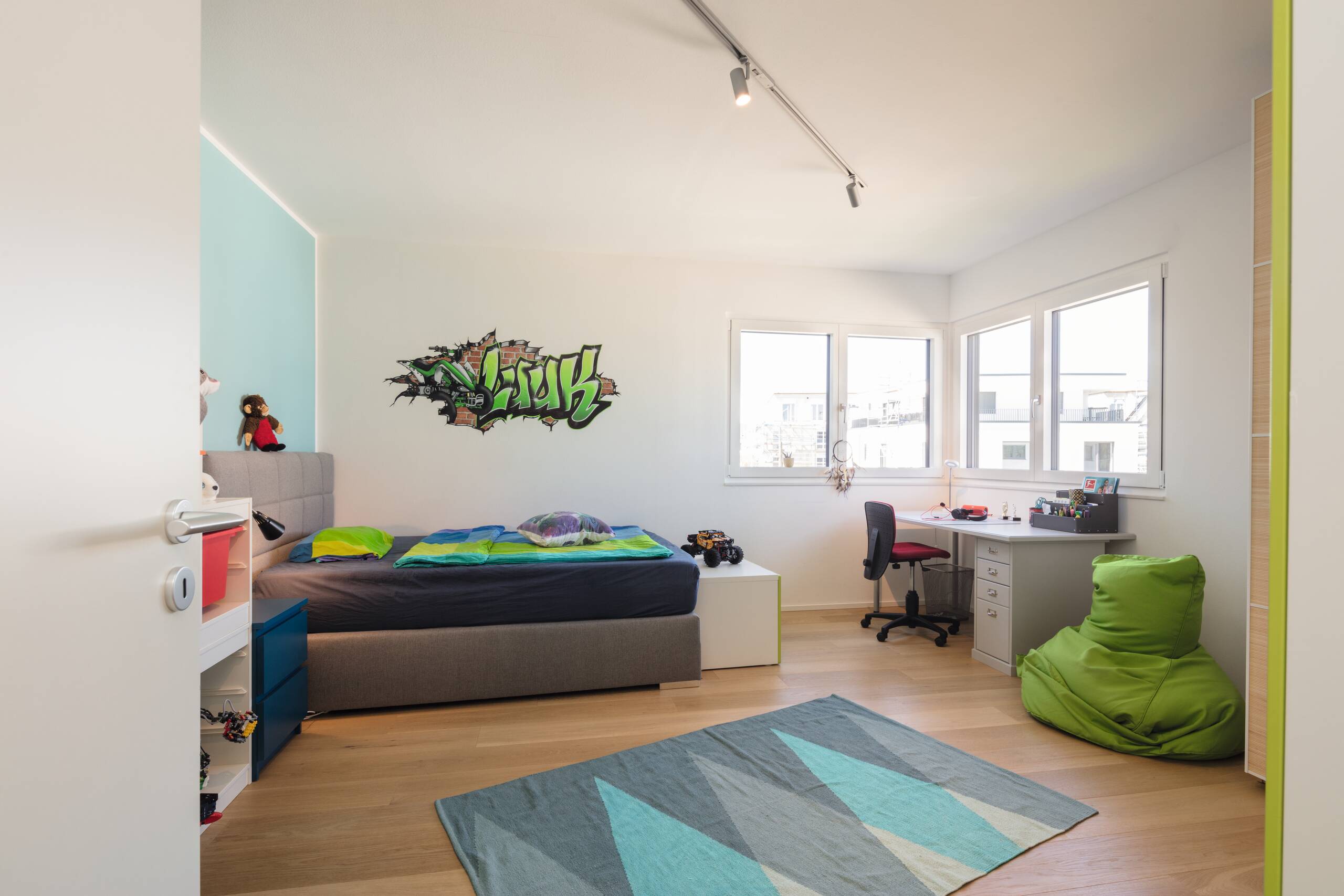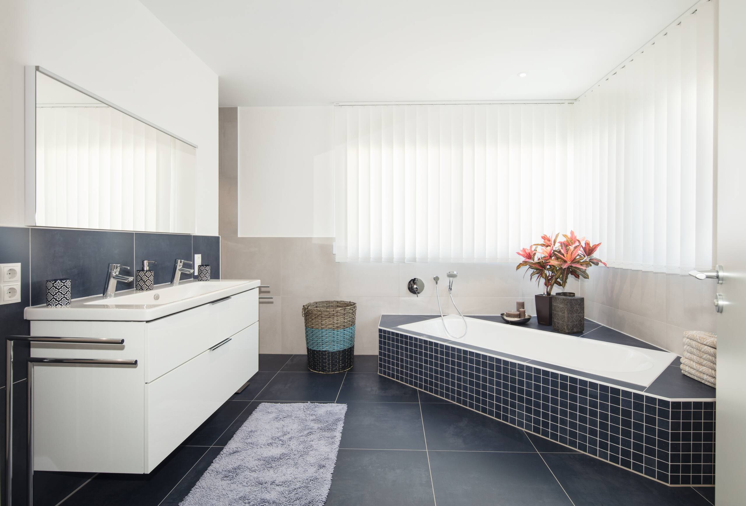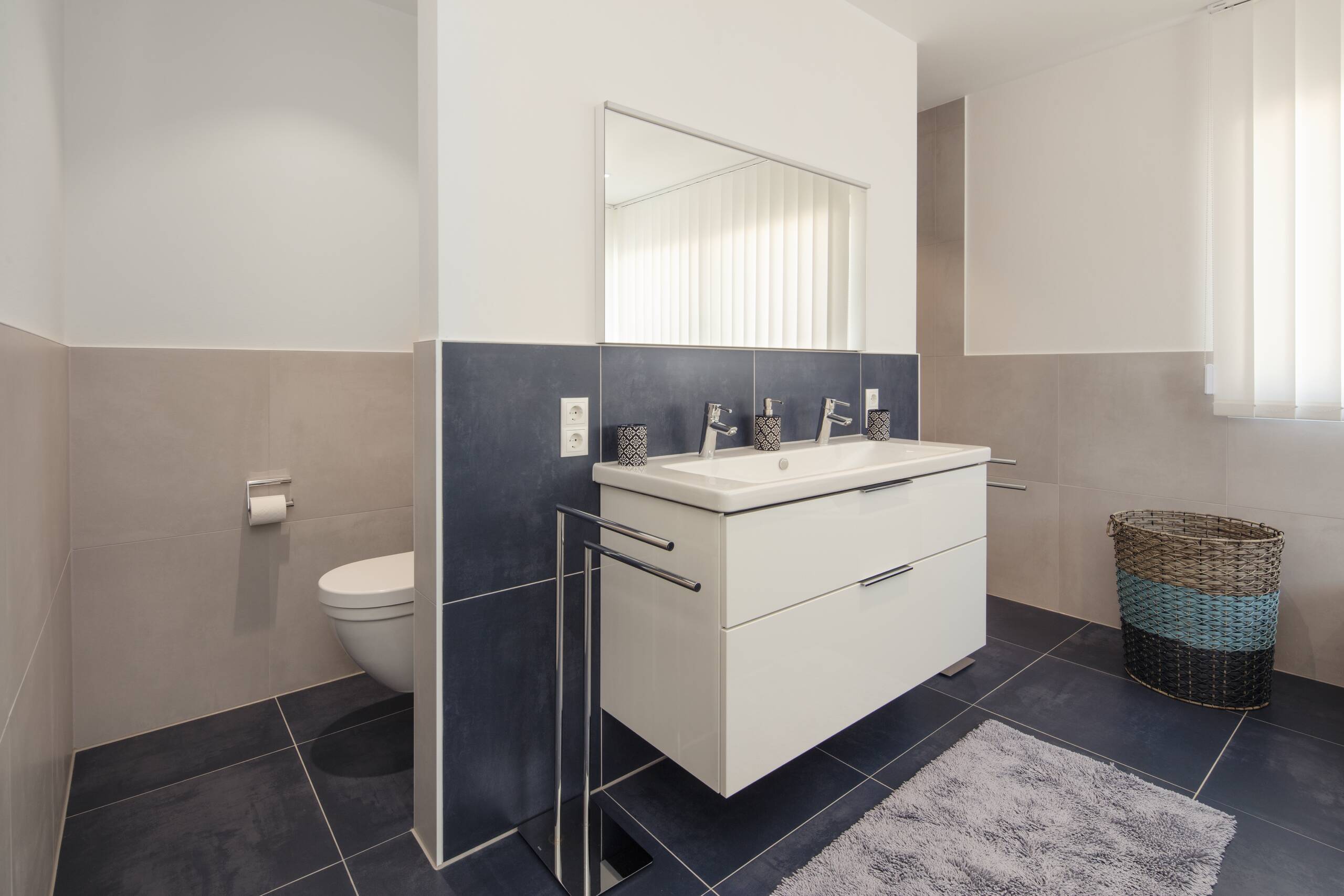Grundlage für dieses Einfamilienhaus ist die Baureihe generation5.5. Die Bauherren wünschten sich ein Haus mit klaren Linien und rechten Winkeln, weshalb sie sich logischerweise für ein Flachdach entschieden. Bei der Fassadengestaltung haben sich die Bauherren für einen Greigeton, eine Mischung aus Beige und Grau, entschieden. So fügt sich das zweigeschossige Haus gut in die natürliche Umgebung ein. Aufgelockert wird die Fassade durch eine Holzverschalung.