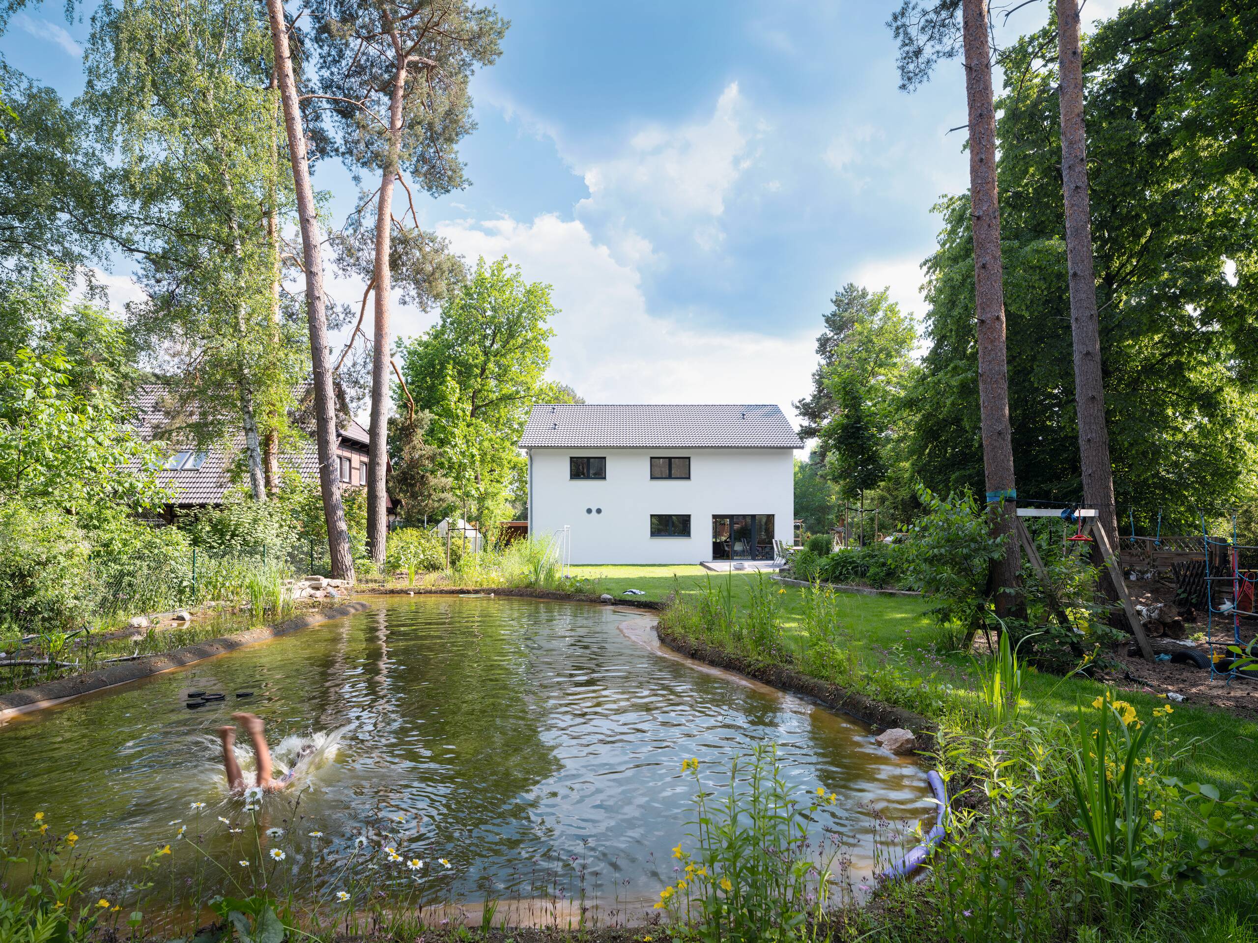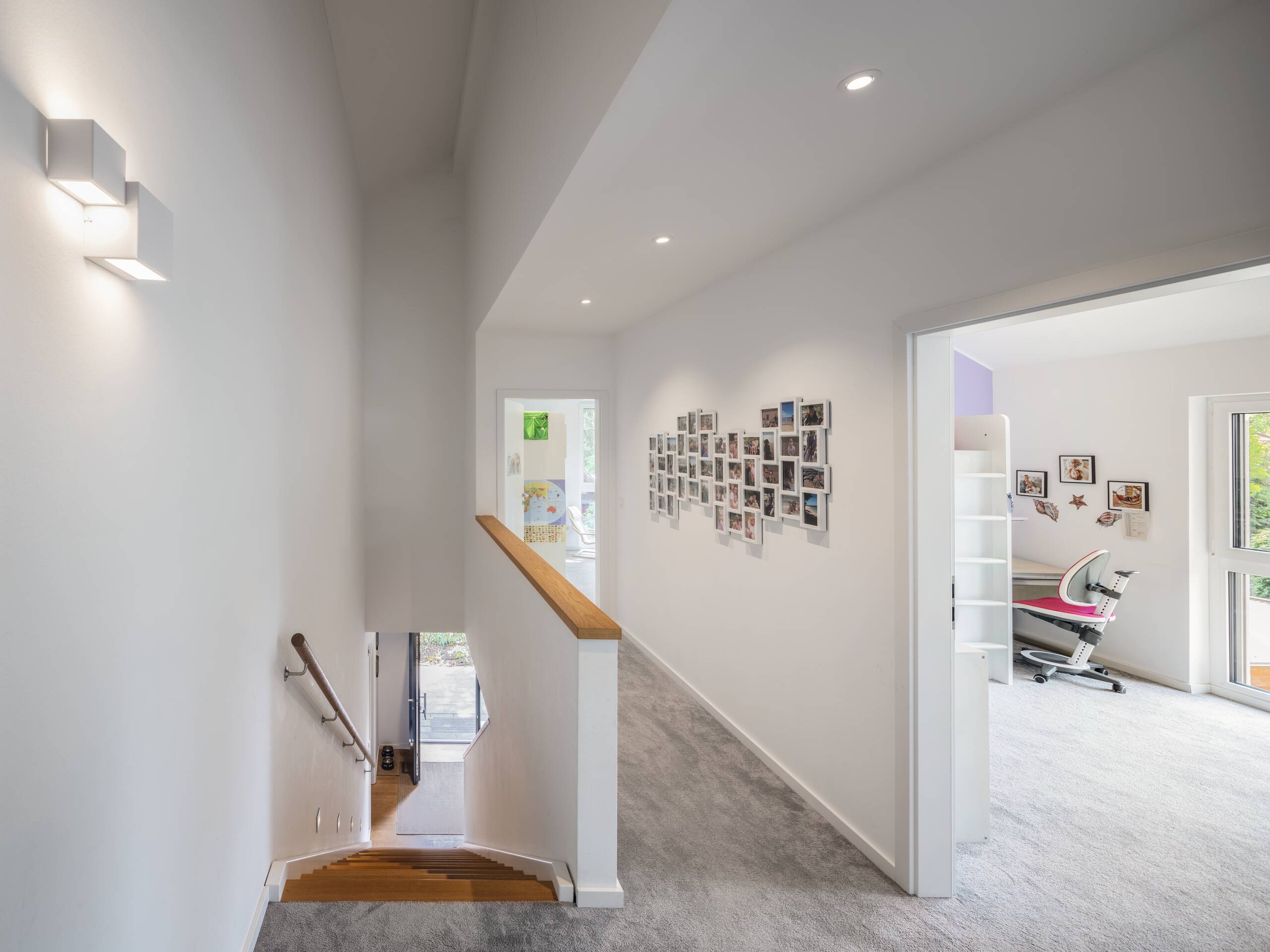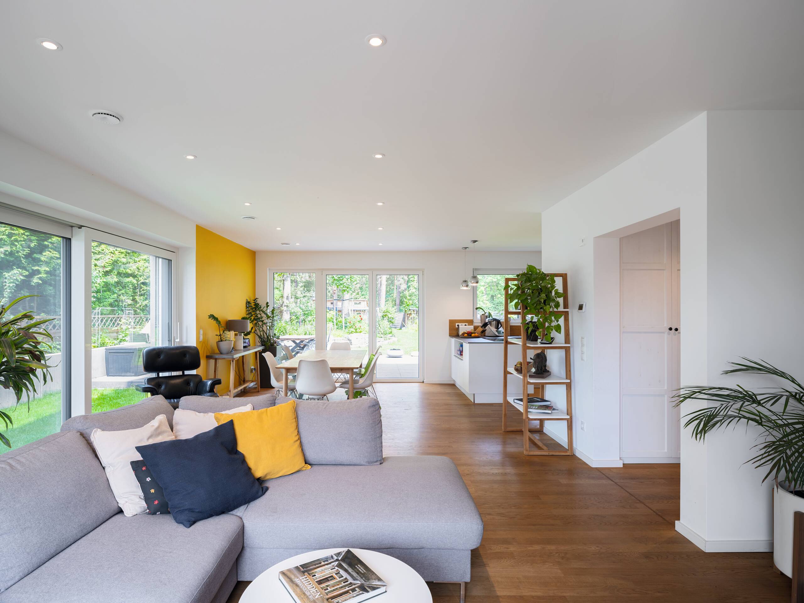 Dieses Einfamilienhaus bietet Platz für eine fünfköpfige Familie. Als Basis diente ein Haus aus der Baureihe generation5.5 mit etwa 180 Quadratmetern Wohnfläche. Die schlichte, weiß verputzte Fassade in Kombination mit den grauen Fensterrahmen sowie Dachziegeln verleiht dem Eigenheim einen zeitlosen Charakter.