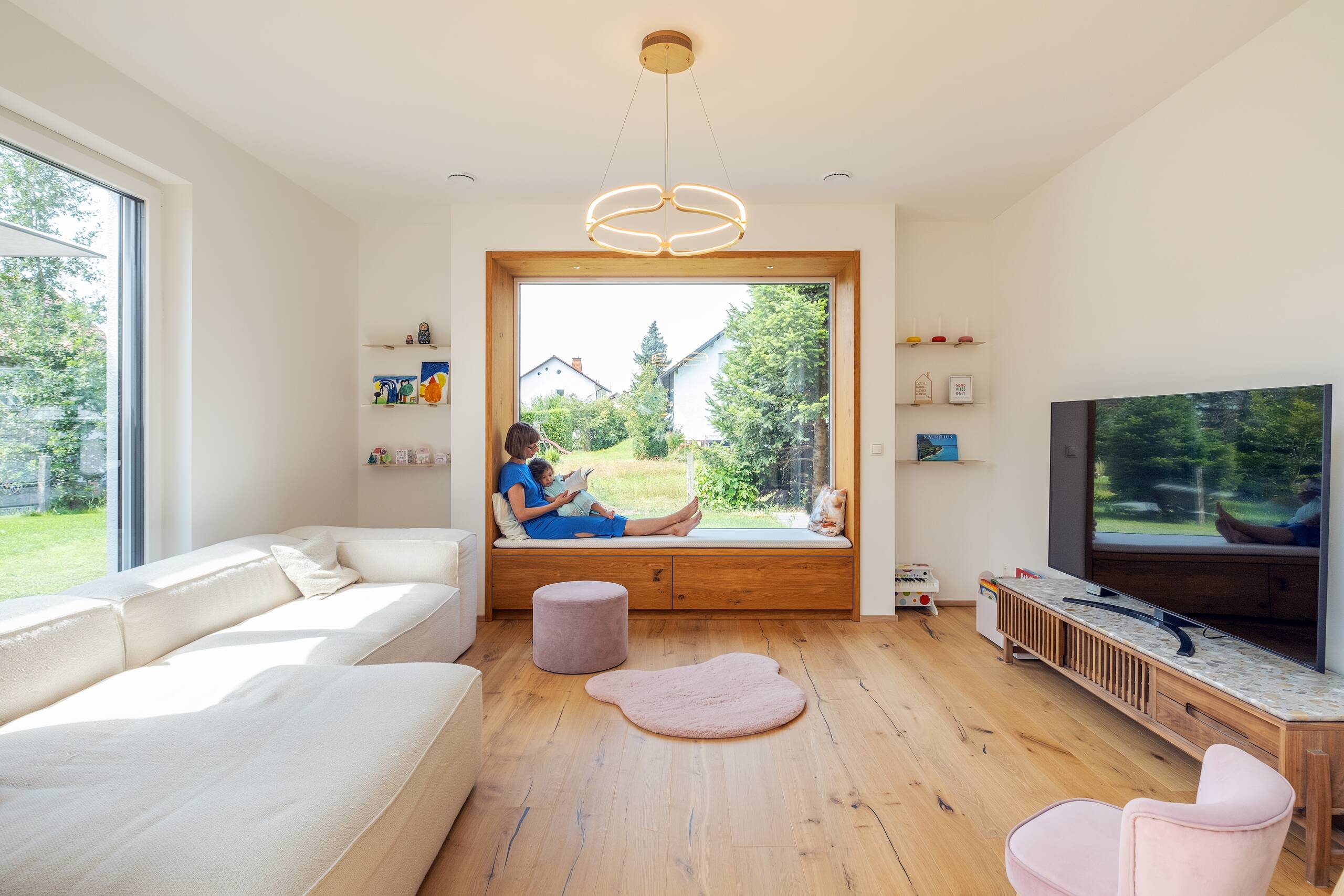 Mit dem flach geneigten Satteldach und der strahlend weißen Putzfassade fügt sich dieses Einfamilienhaus harmonisch in seine ländliche Umgebung ein. Für Spannung sorgen der grau angesetzte Übereck-Erker, der sich in eine praktische Eingangsüberdachung verlängert, sowie die Fenster in verschiedenen Formaten.