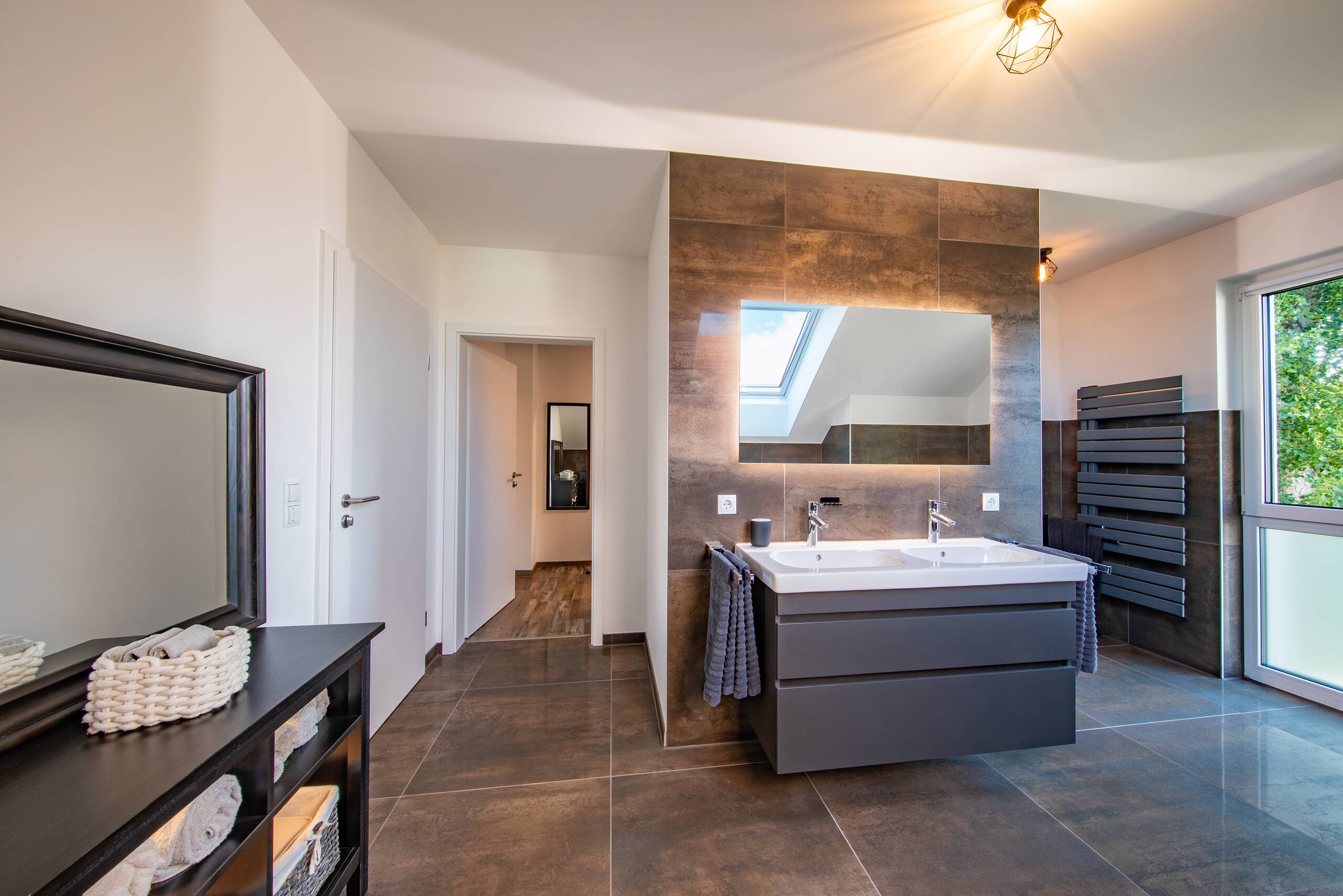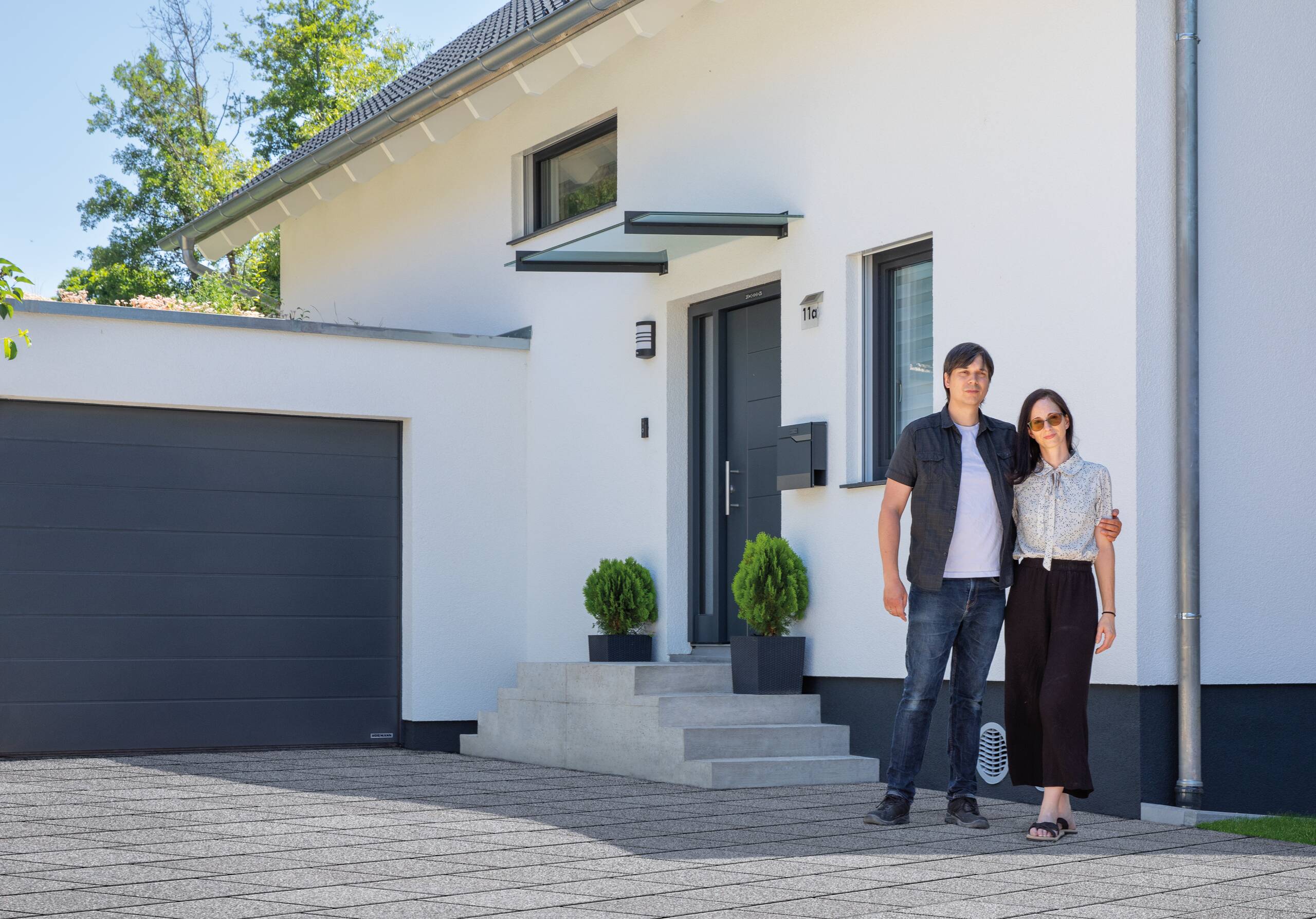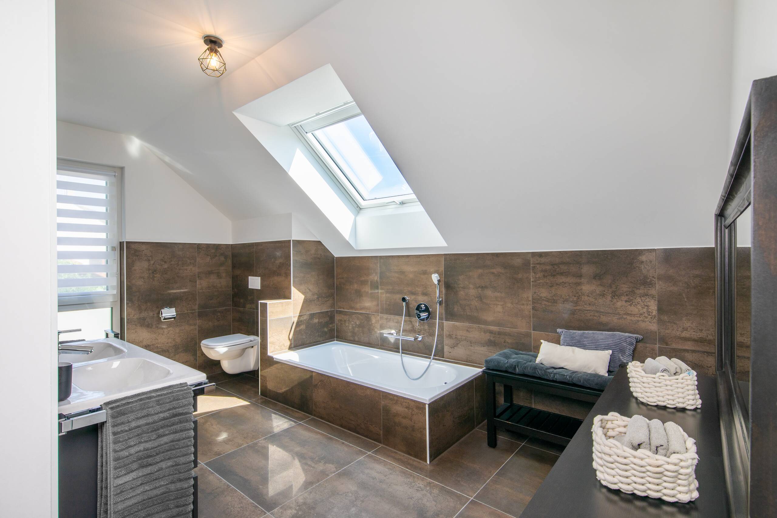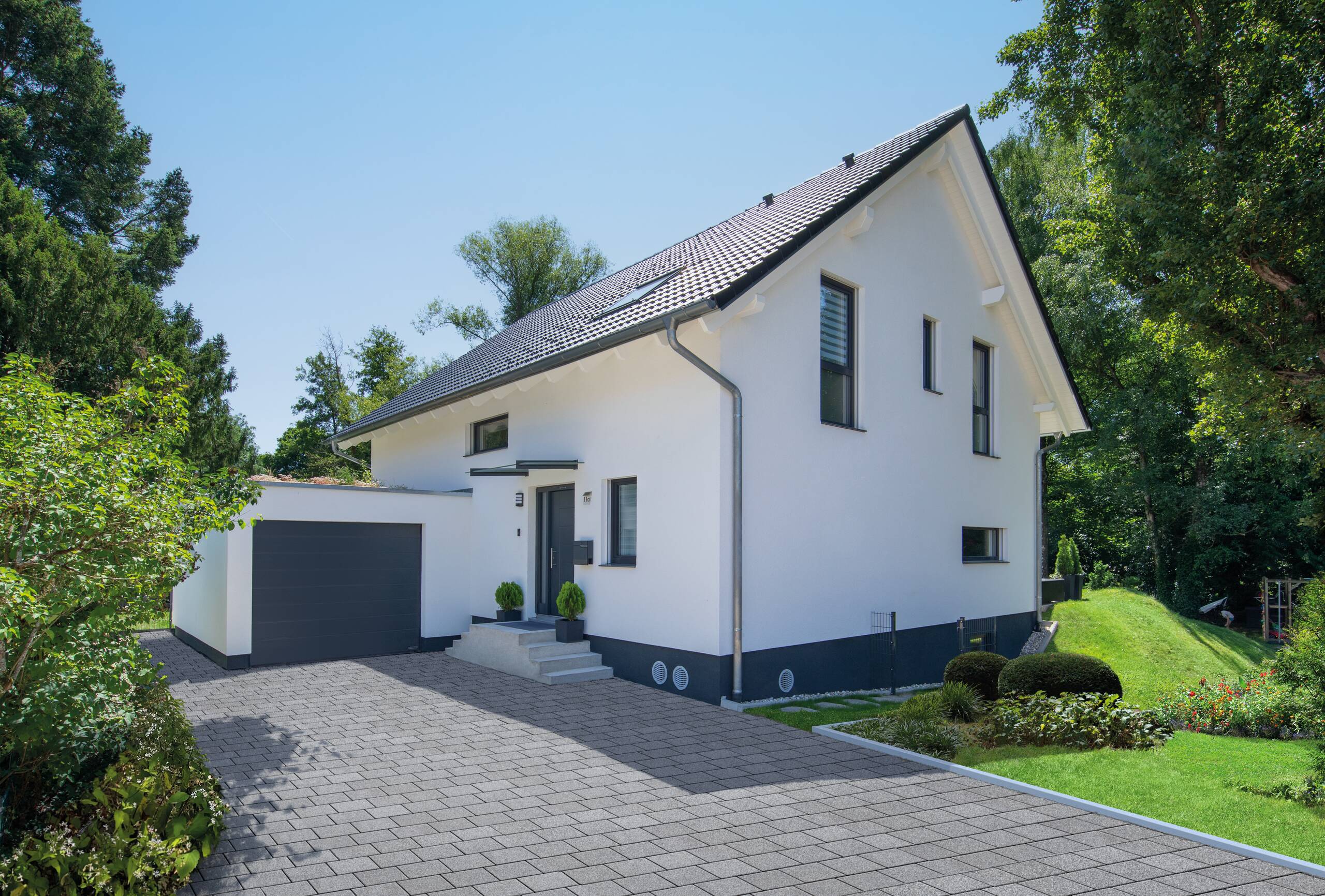 Stilvoll, schick und modern – so präsentiert sich dieses anderthalbgeschossige Satteldachhaus seinen Betrachtern. Blickfang ist der Erker auf der Gartenseite, der sich in einen dritten Giebel mit interessantem Dreiecksfenster erweitert. Die strahlend weiße Putzfassade wird kontrastiert von den anthrazitfarbenen Fensterrahmen und dem Sockel, der ebenfalls in Anthrazit gehalten ist.