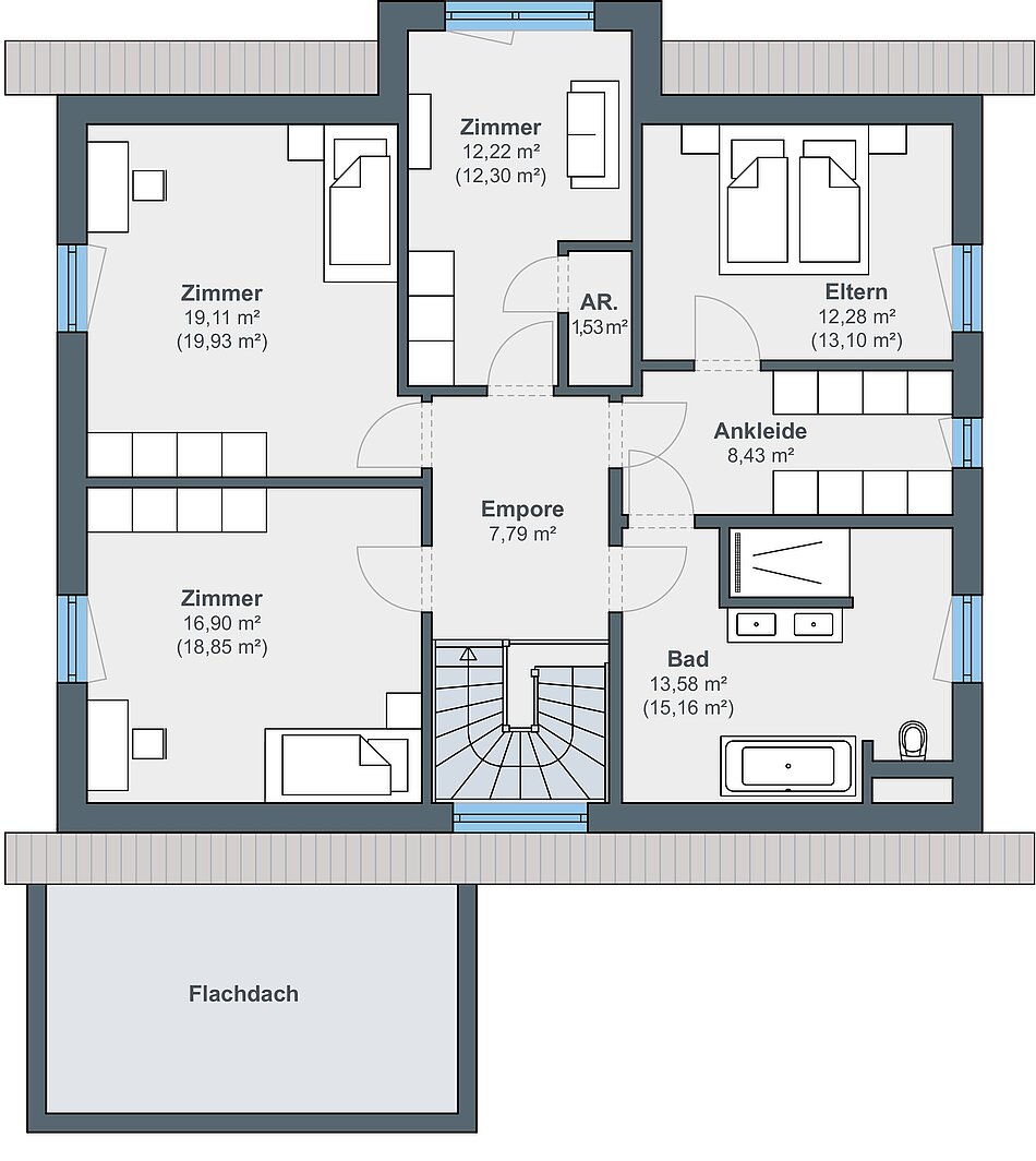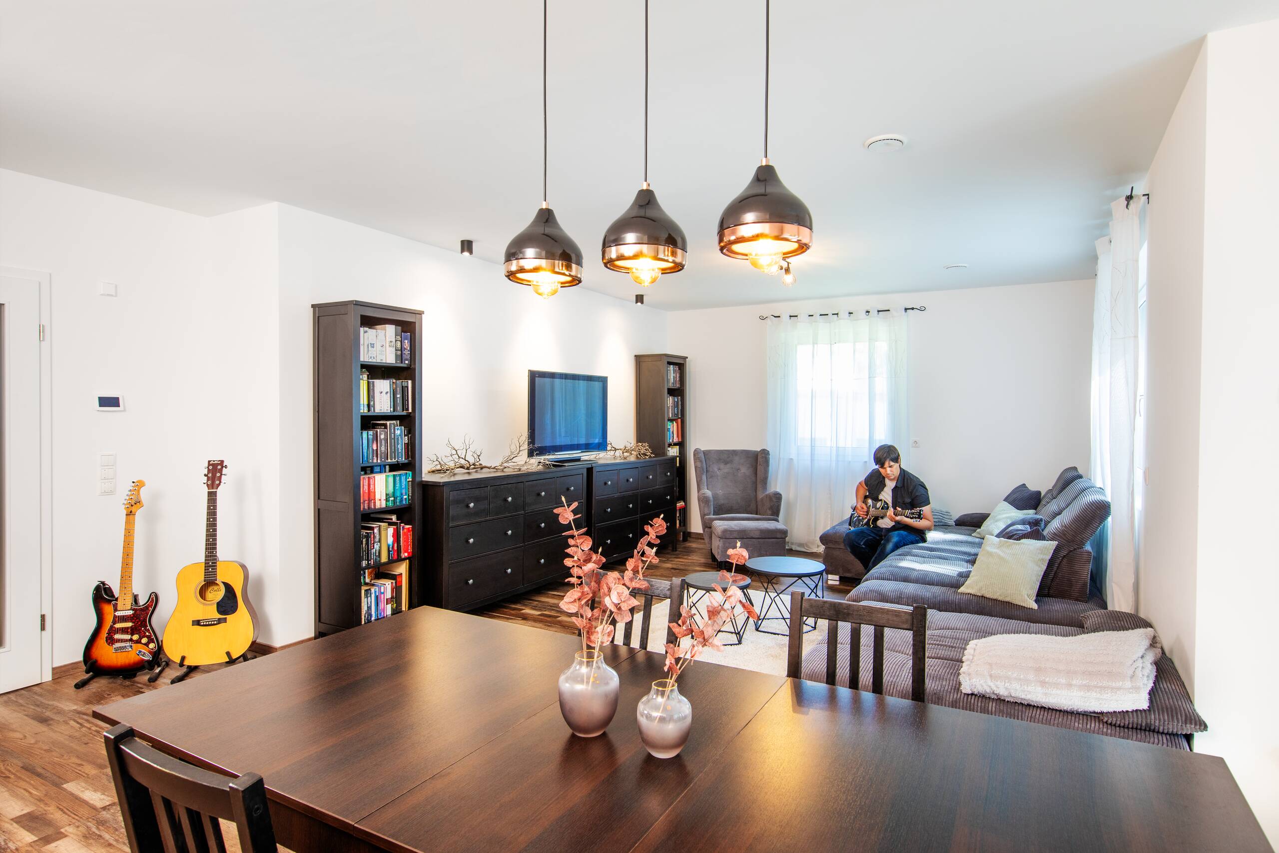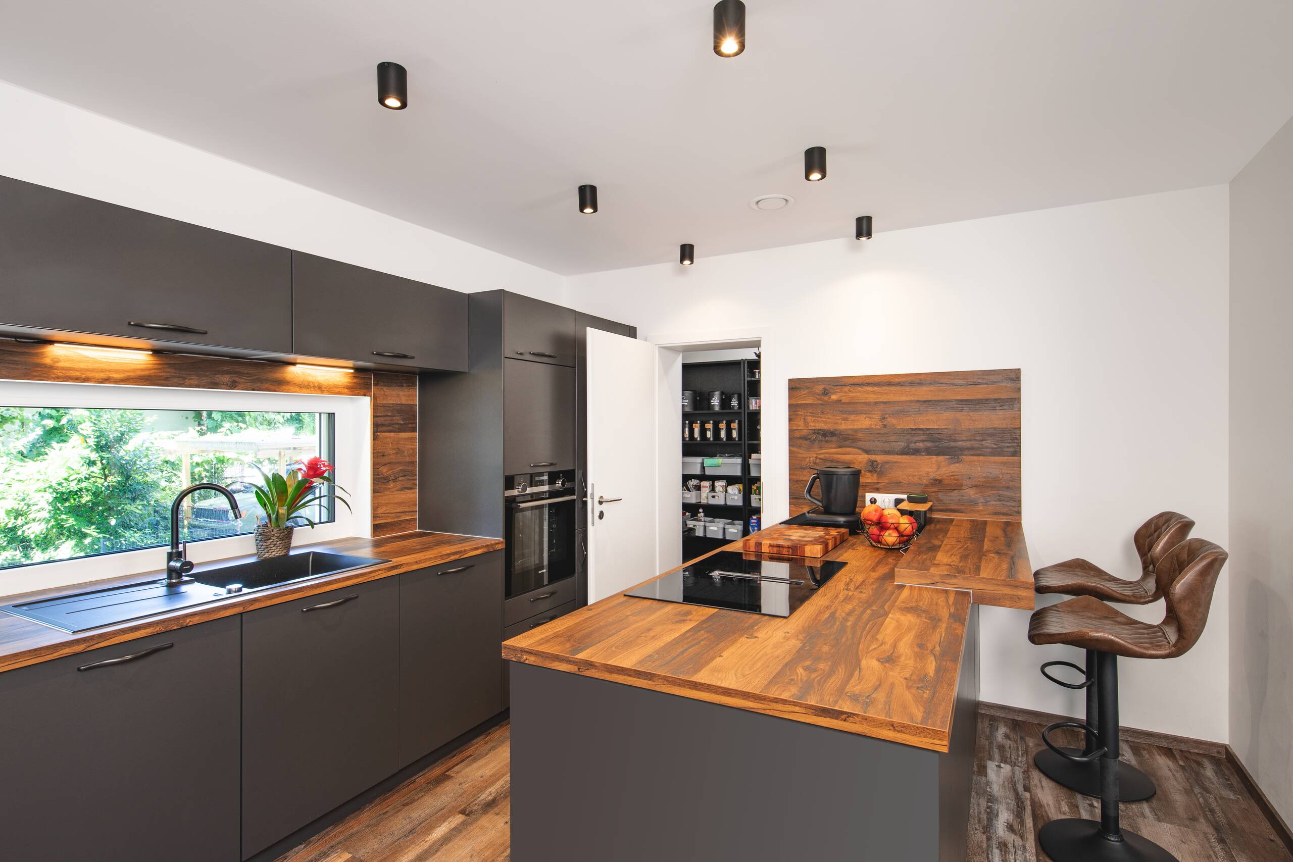Stilvoll, schick und modern – so präsentiert sich dieses anderthalbgeschossige Satteldachhaus seinen Betrachtern. Blickfang ist der Erker auf der Gartenseite, der sich in einen dritten Giebel mit interessantem Dreiecksfenster erweitert. Die strahlend weiße Putzfassade wird kontrastiert von den anthrazitfarbenen Fensterrahmen und dem Sockel, der ebenfalls in Anthrazit gehalten ist.