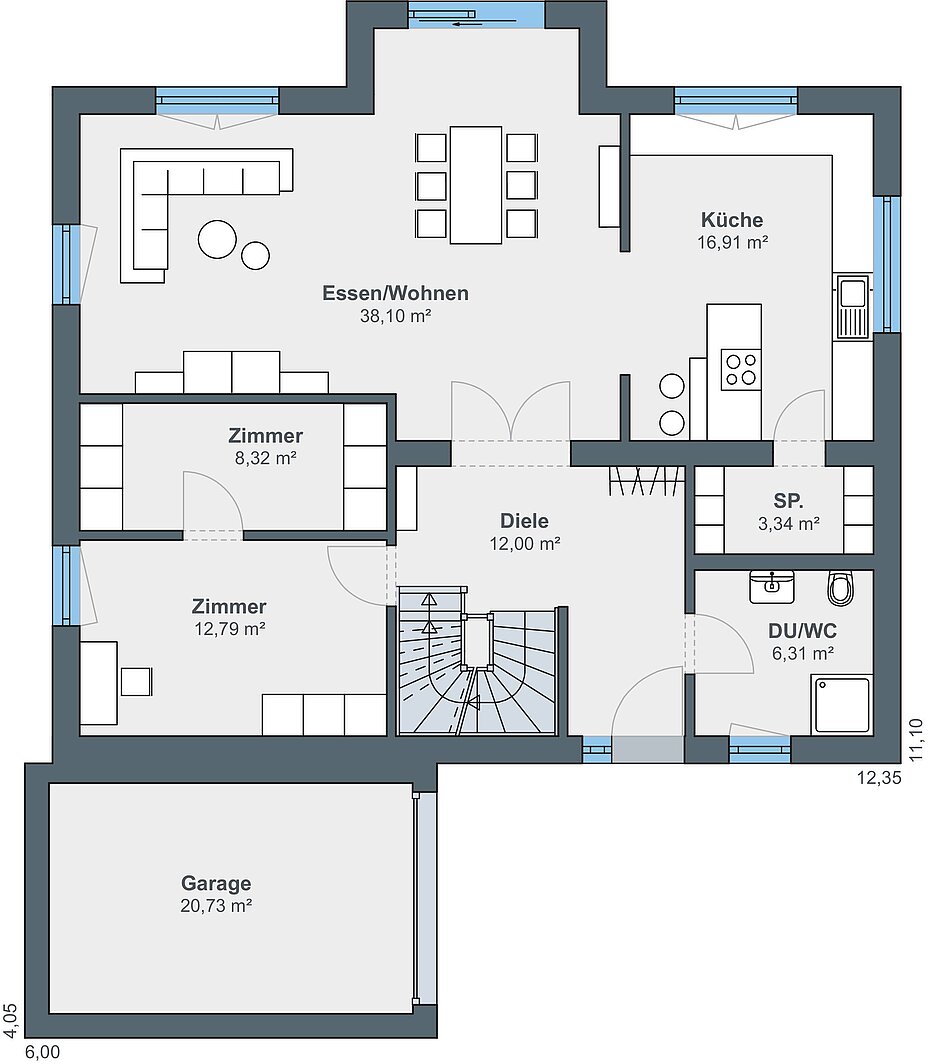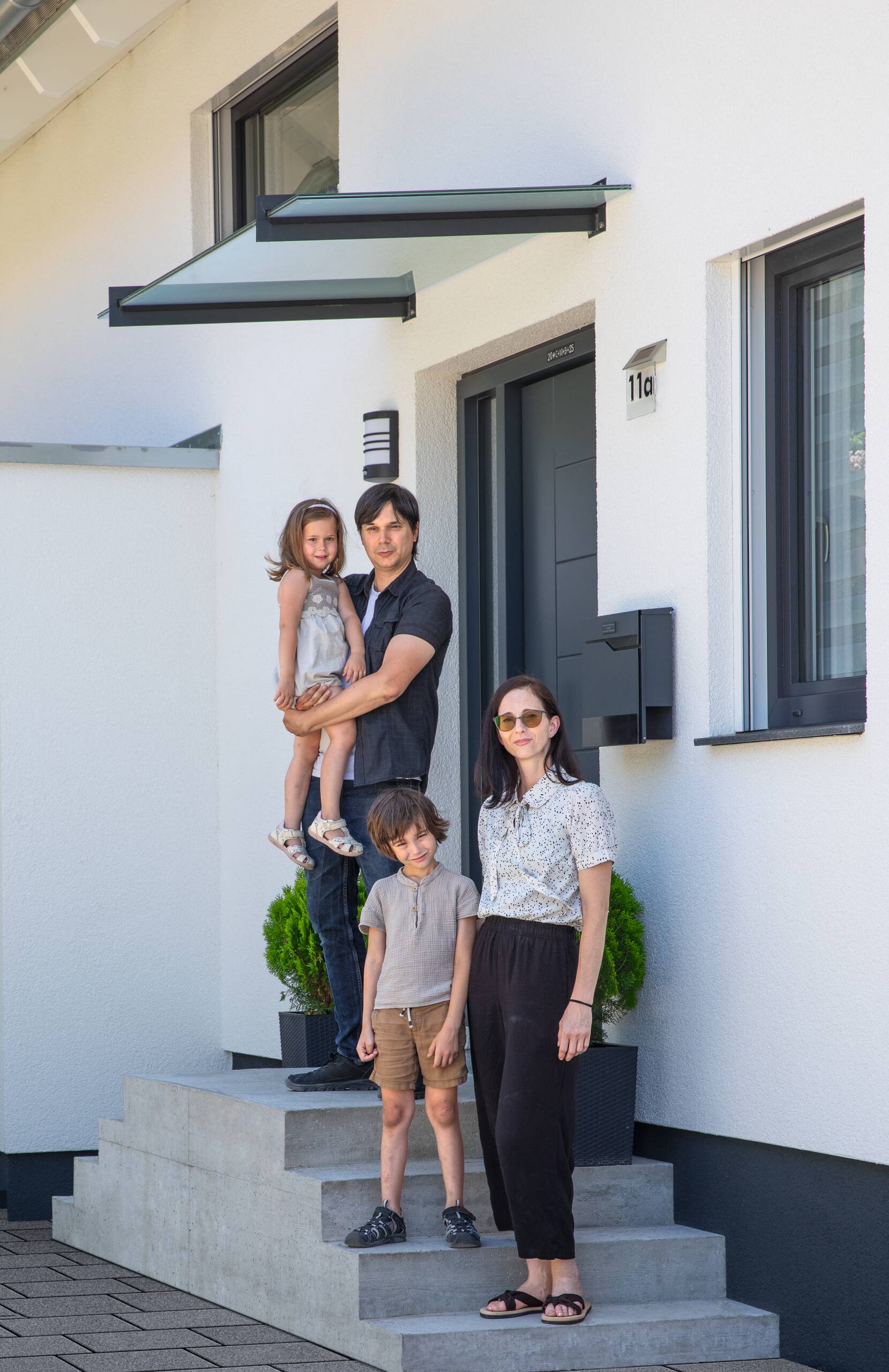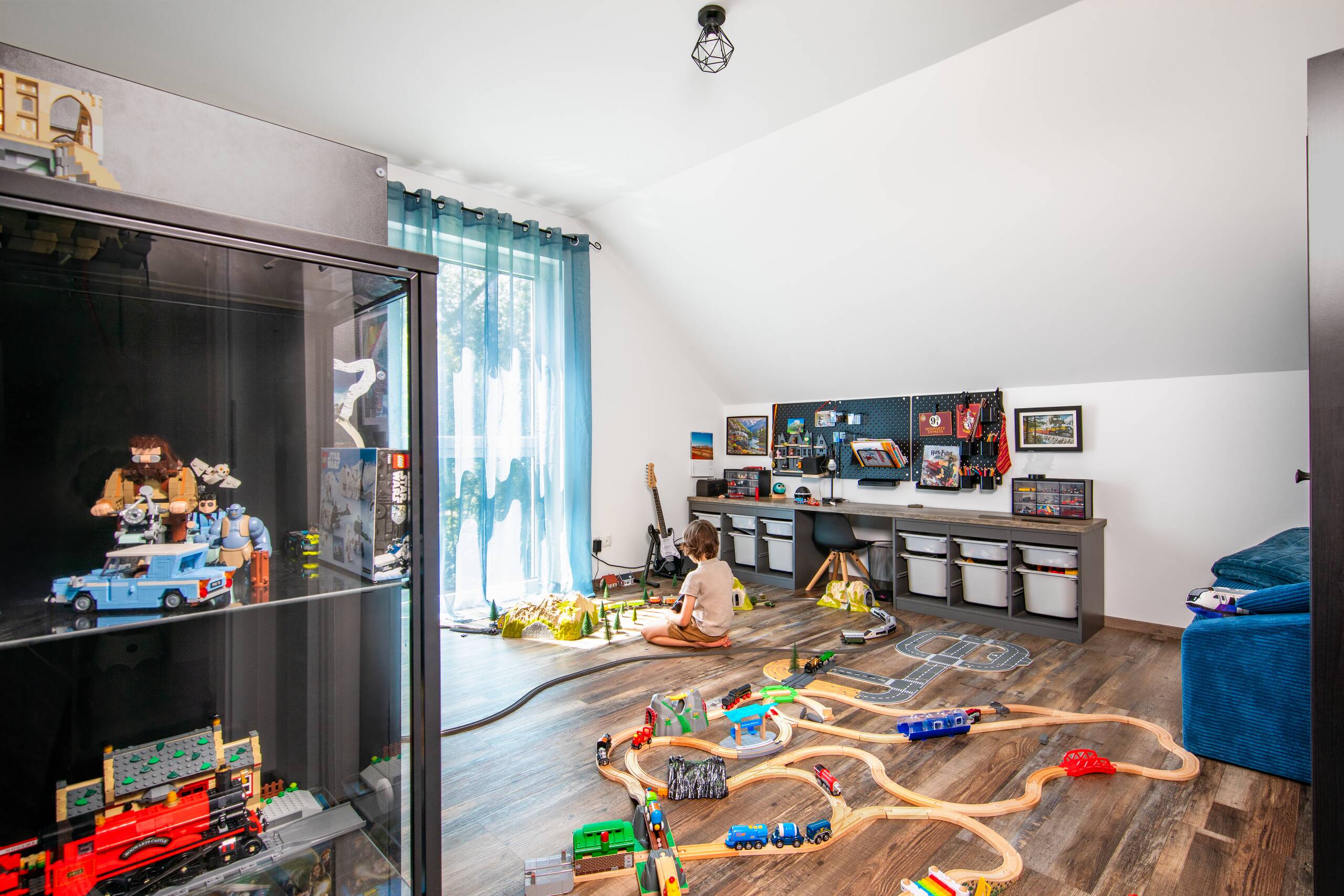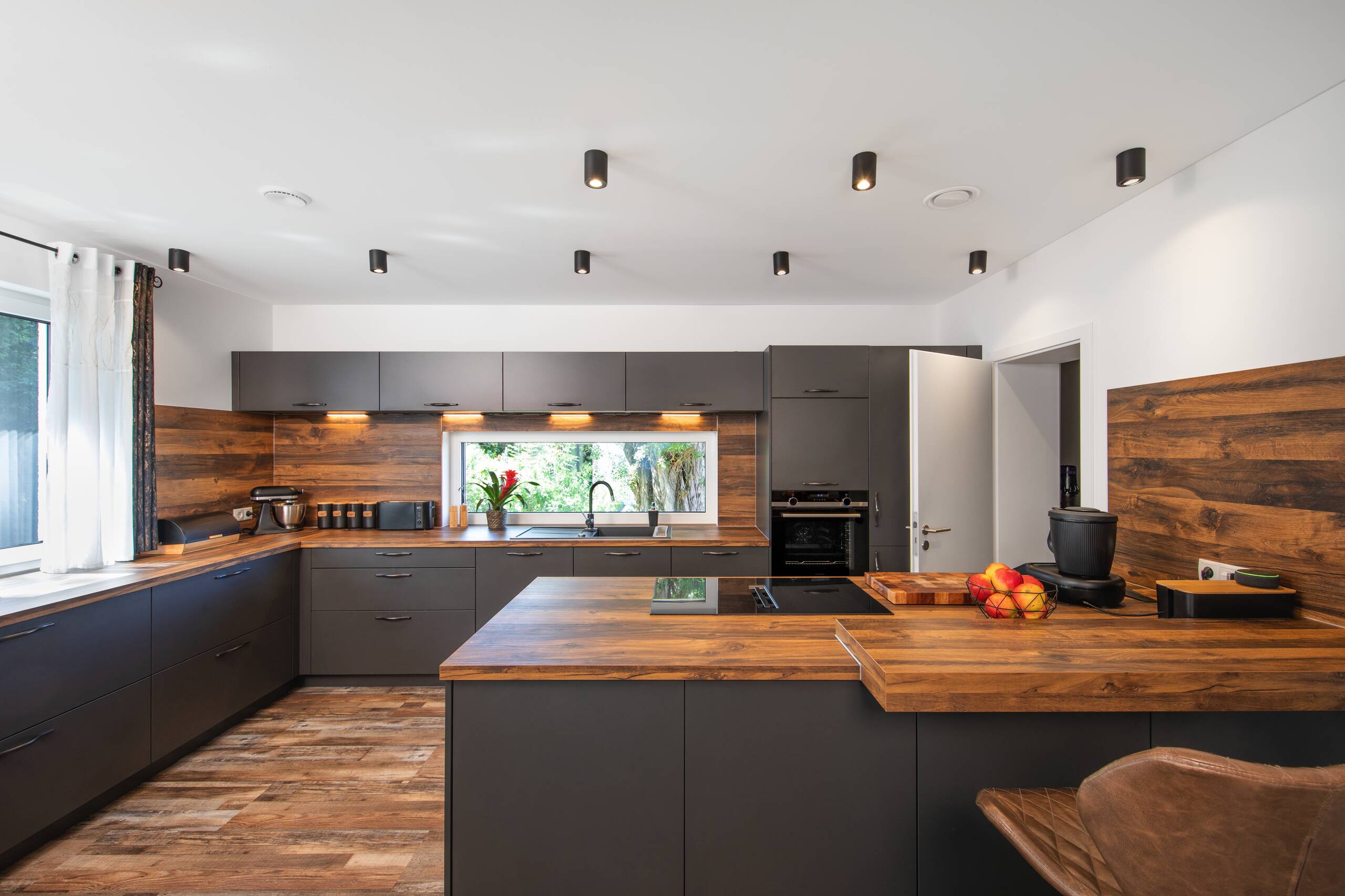 Stilvoll, schick und modern – so präsentiert sich dieses anderthalbgeschossige Satteldachhaus seinen Betrachtern. Blickfang ist der Erker auf der Gartenseite, der sich in einen dritten Giebel mit interessantem Dreiecksfenster erweitert. Die strahlend weiße Putzfassade wird kontrastiert von den anthrazitfarbenen Fensterrahmen und dem Sockel, der ebenfalls in Anthrazit gehalten ist.