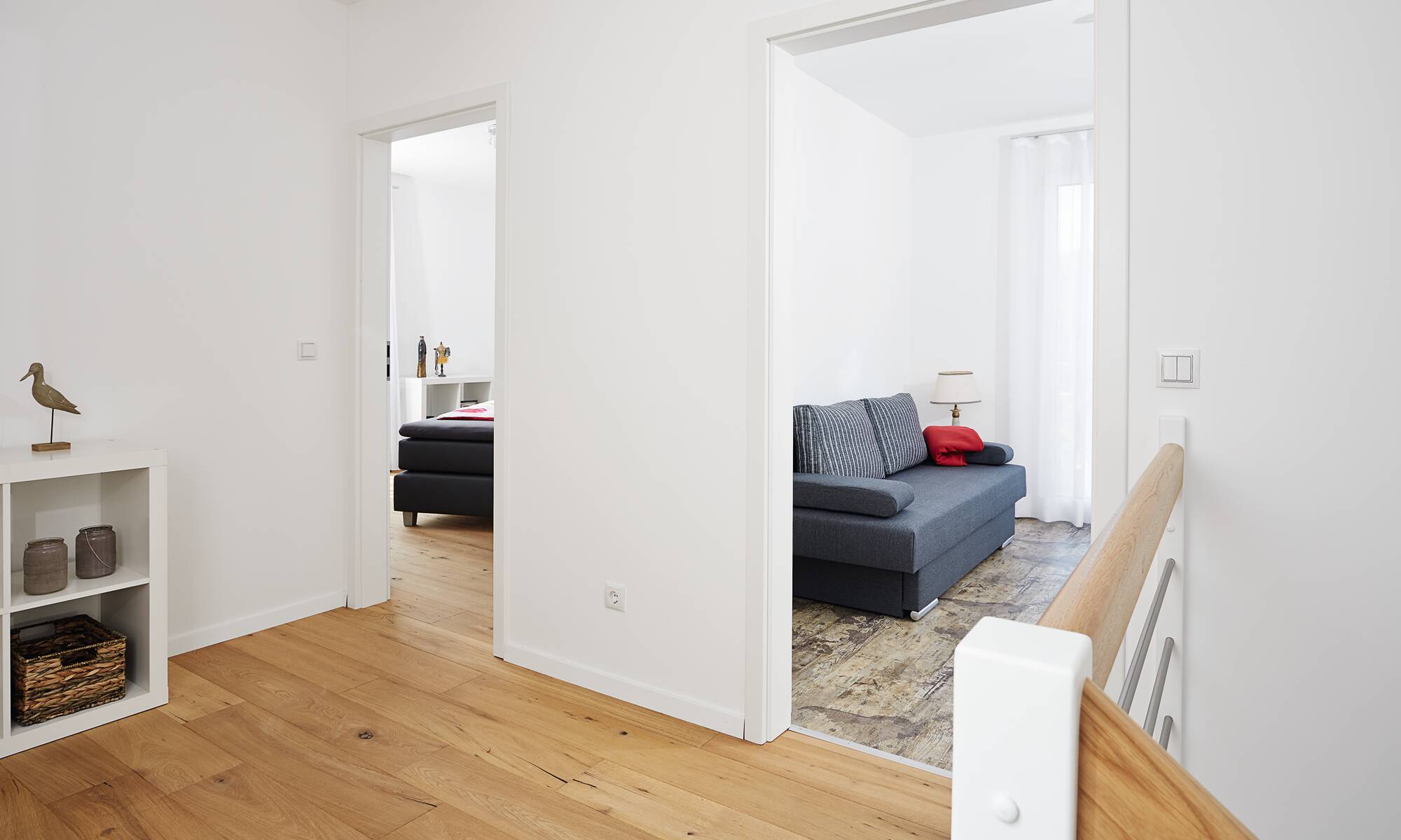 Geradlinig und modern ist der Entwurf dieses Hauses mit Flachdach. Die Innengestaltung greift die äußere Linienführung auf – klar, puristisch und hell sind die Räume, die immer wieder mit roten Akzenten und Elementen aus Naturholz belebt werden. Ob in der Sauna, dem großen Bad oder auf der Terrasse, dieses Heim bietet unzählige Wohlfühlorte.