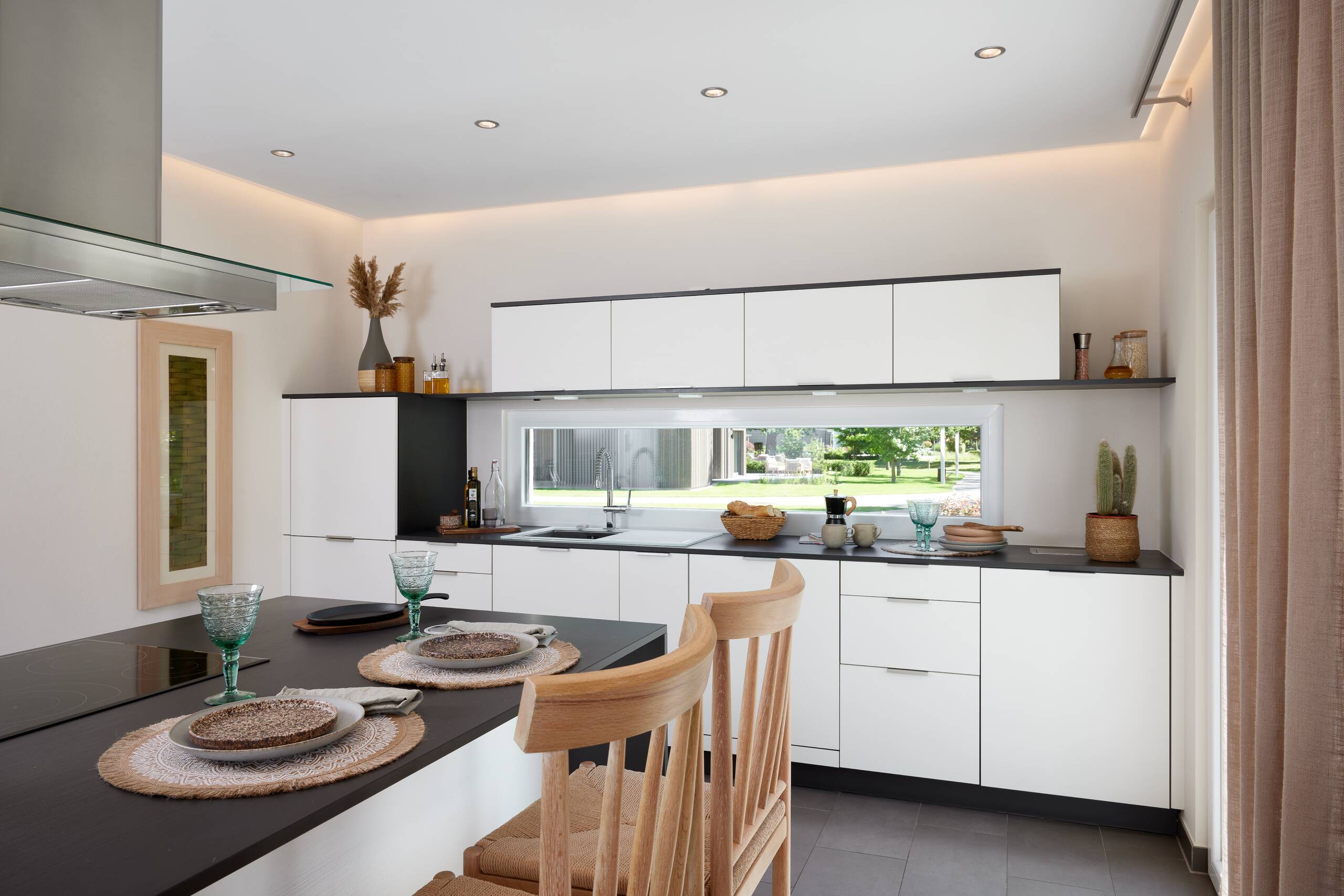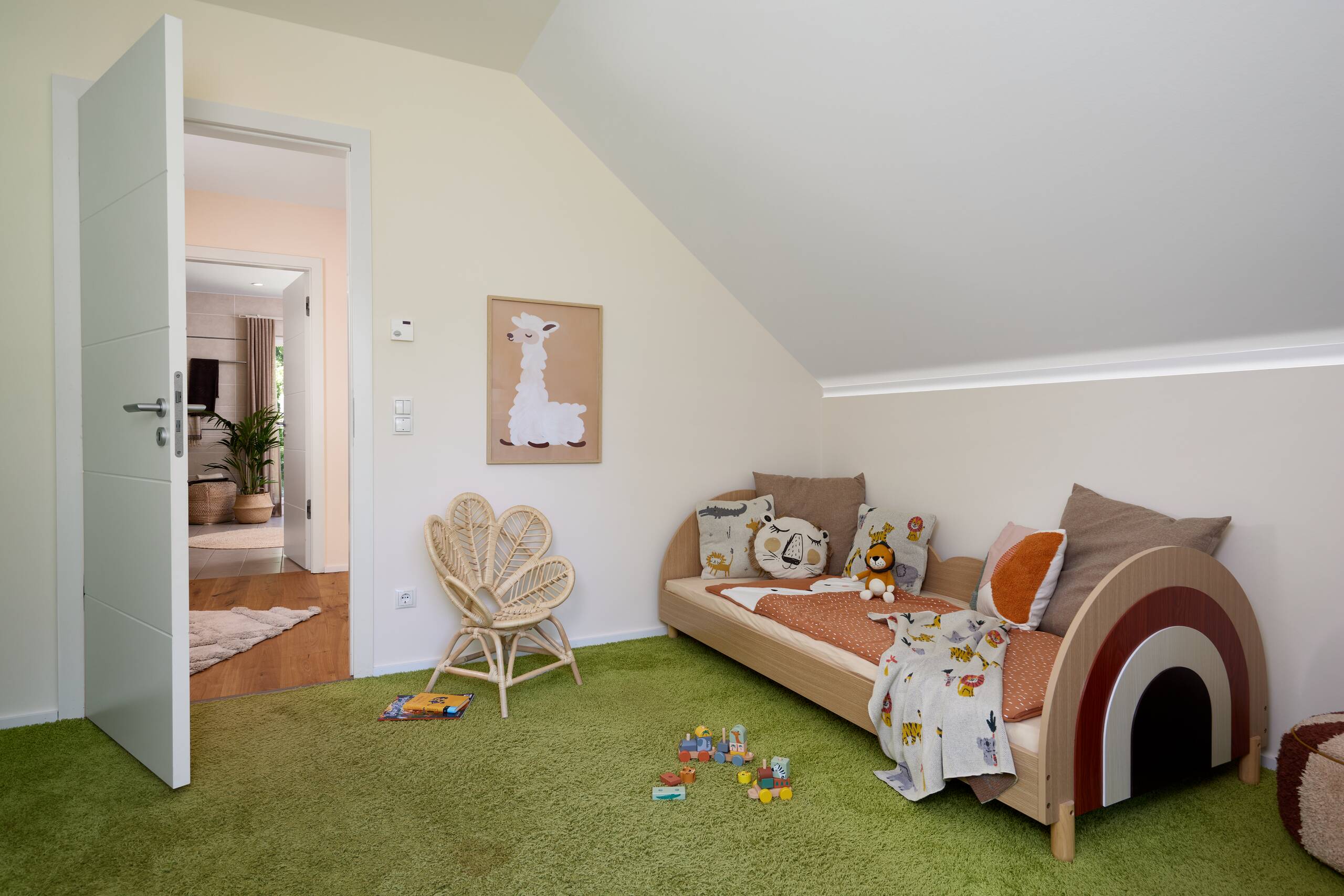 Großzügige Grundrisse, moderne, reduzierte Formen und mit dem leicht versetzten Pultdach beste Voraussetzungen für eine Photovoltaikanlage: So könnte Ihr generation5.5 als PlusEnergie-Haus aussehen. Auf eineinhalb Geschossen ist reichlich Platz für Komfort-Extras wie das flexibeln nutzbare Zimmer im Erdgeschoss oder die große Ankleide neben dem Elternschlafzimmer. Über die Terrasse, auf die man vom Wohn-Essbereich gelangt, bietet sich eine Pergola an. Optionen? Viele. Zum Beispiel eine Garage mit überdachter Verbindung zum Haus und zusätzlichem Abstellraum.
