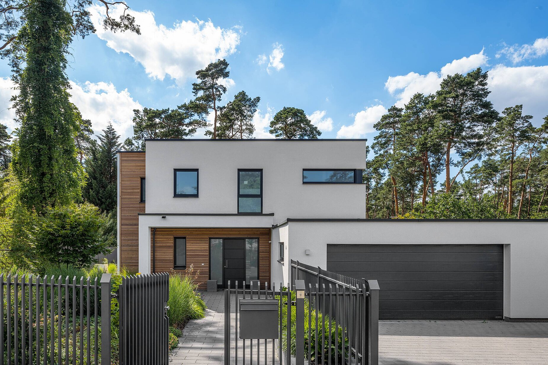 Das Kubushaus entspringt der Tradition des Bauhausstils. Geradlinig und schnörkellos sind diese Häuser. Auch dieses Architektenhaus in Fertigbauweise zeigt sich minimalistisch und modern. Die Basis bildet ein beinahe quadratischer Würfel, der durch Einschnitte und partieller Holzverschalung aufgelockert wird. Die Garage, die mit dem Einfamilienhaus verbunden ist, wurde seitlich vor das Eigenheim platziert. So konnte das schmale, aber lange Grundstück optimal genutzt werden. Zum Garten hin öffnet sich das Wohnhaus dank großen Fensterfronten. Der großzügige Balkon und die überdachte Terrasse laden zum Entspannen ein.
