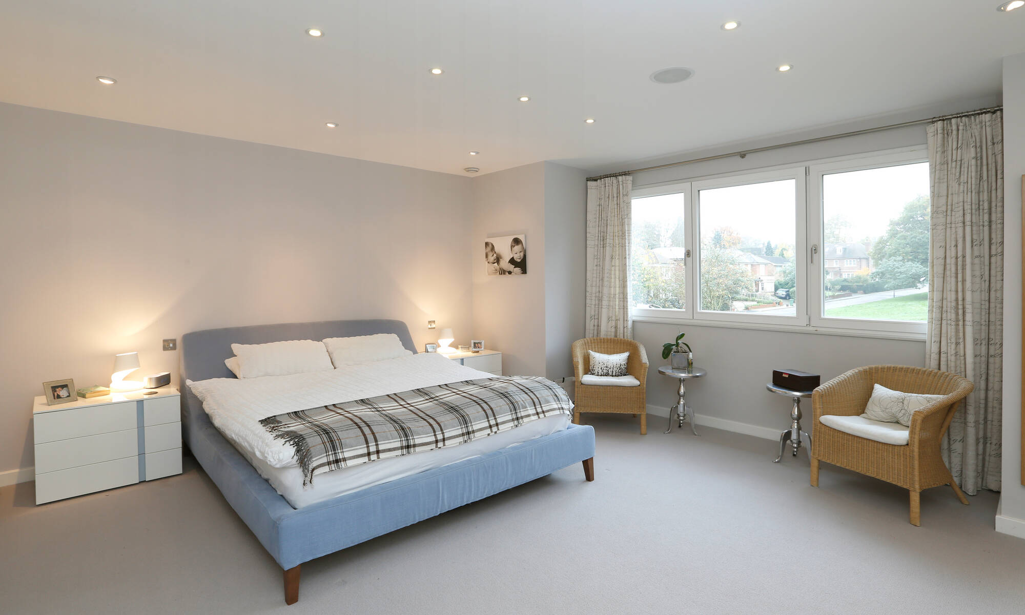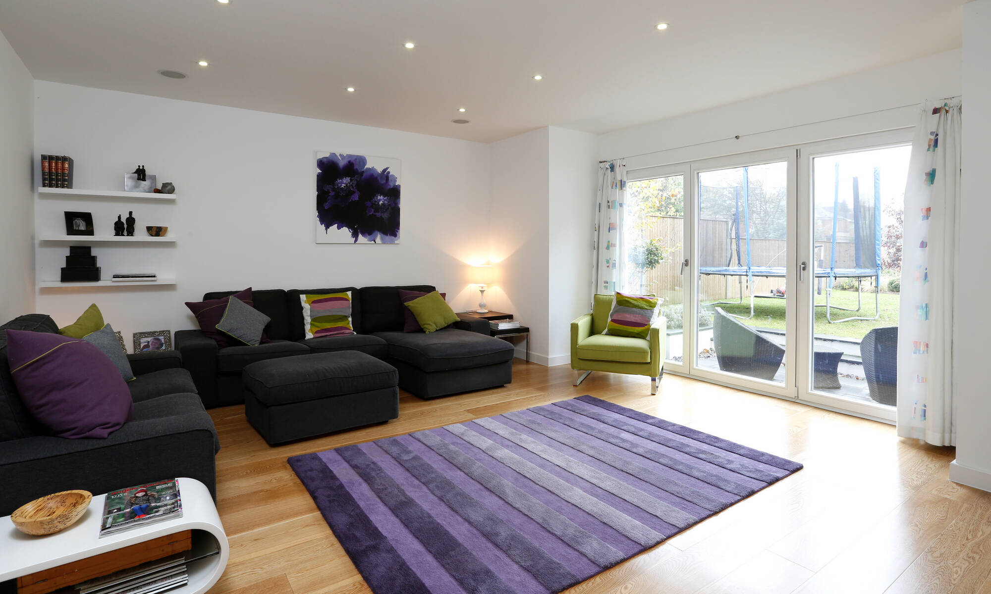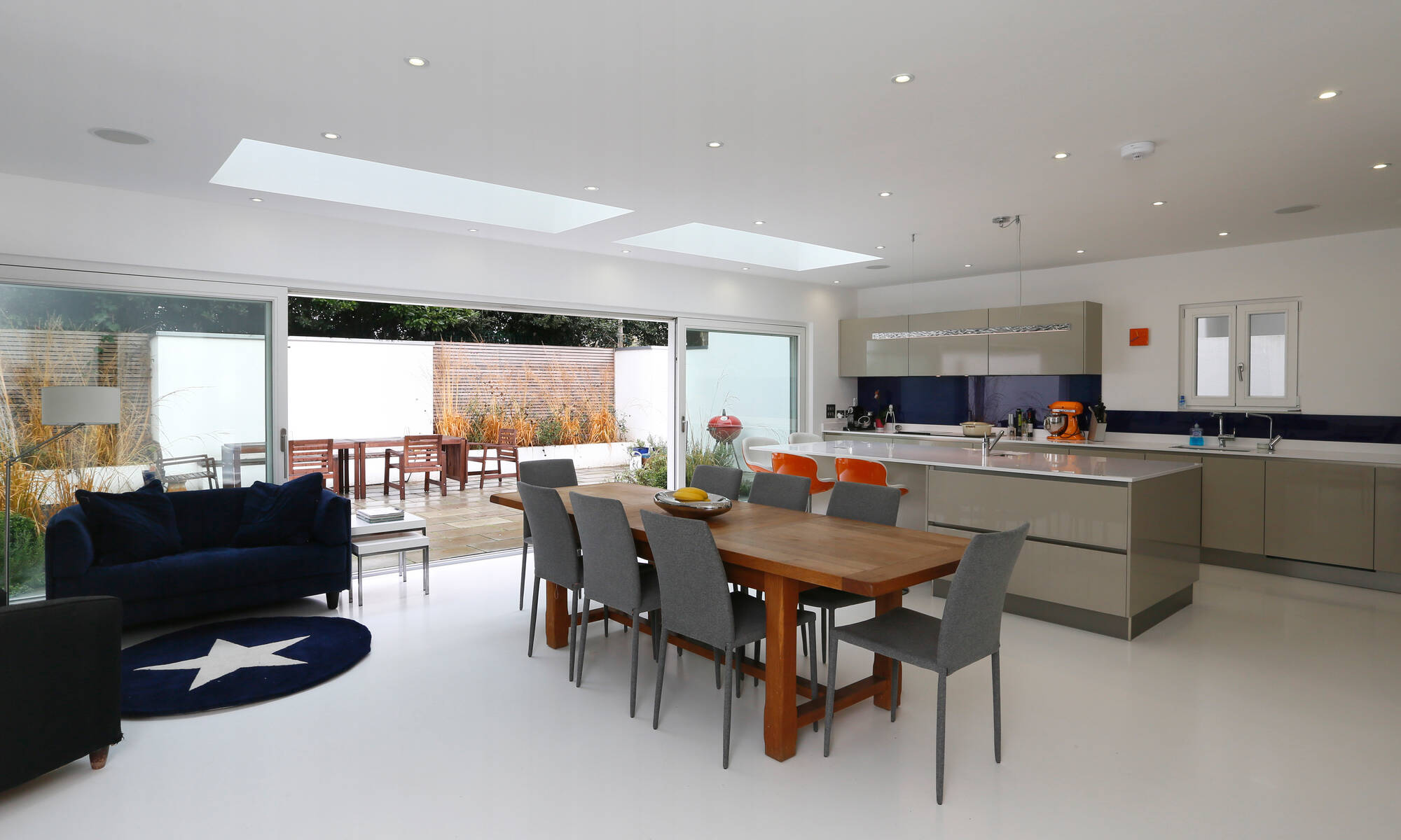 Auf einem engen, schmalen Grundstück errichtet, schafft dieses frei geplante Architektenhaus auf drei Stockwerken trotzdem sehr viel Platz für die freie Entfaltung. Fünf Zimmer und vier Bäder in einem hellen, freundlichen Stil. Die offene Küche vereint Ess-, Wohn- und Familienbereich zu einem Raum, der sich zeitgleich nach draußen auf die Terrasse erstreckt – bequem durch große Glasschiebetüren zu betreten.