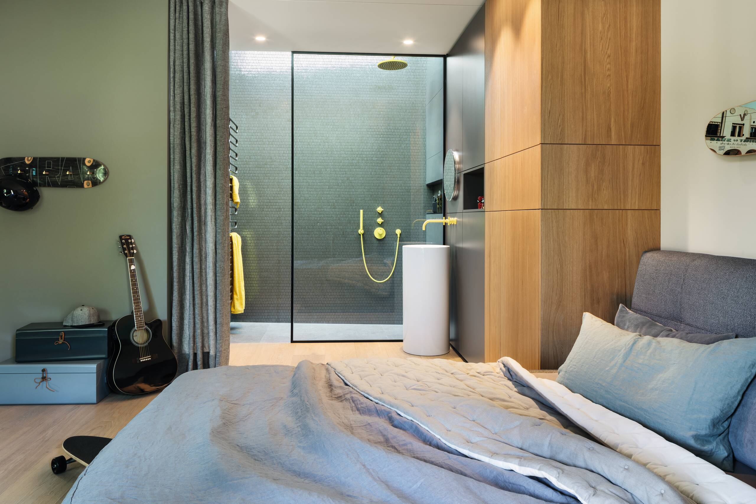Das luxuriöse Musterhaus überzeugt mit seinen klaren Linien und der modernen Architektur, die unverkennbar der Tradition des Bauhauses entstammt. Entworfen hat das eindrucksvolle Fertighaus der Londoner Architekt Nick Blunt. Der Baukörper misst eine Länge von 25 Metern, während die Haustiefe neun Meter beträgt. Große, bodentiefe Glaselemente öffnen das Einfamilienhaus zur Gartenseite und lassen viel Tageslicht ins Hausinnere. Betritt man das rund 335 Quadratmeter große Haus, lassen sich bereits auf den ersten Blick die großzügigen Raumverhältnisse erfassen. Das Eingangsgeschoss ist unterteilt in ein Wohnzimmer, das über eine geschosshohe, in die Wand integrierte Tür dezent verborgen werden kann. Der zweite Bereich besteht aus einem offenen Koch-Essbereich. Nebenräume wie ein Abstellraum, ein WC, der Aufzug und ein Secret Room als Bar sind wie ein raumhohes Möbel ins Erdgeschoss eingestellt. Im Obergeschoss liegt der Elterntrakt mit Schlafzimmer, Wellness-Bad und großzügiger Ankleide. Zwei Kinderzimmer jeweils mit eigenem Bad sowie ein Büro komplettieren das Raumangebot im Obergeschoss. Als eigenständiges Gebäude stehen eine Doppelgarage sowie ein Wellnessbereich mit Sauna, WC und Aquamoon-Dusche neben dem Haupthaus. Die hochwertige Detaillierung und die handwerkliche Qualität fallen besonders auf. Nichts in dieser Villa ist Standard.