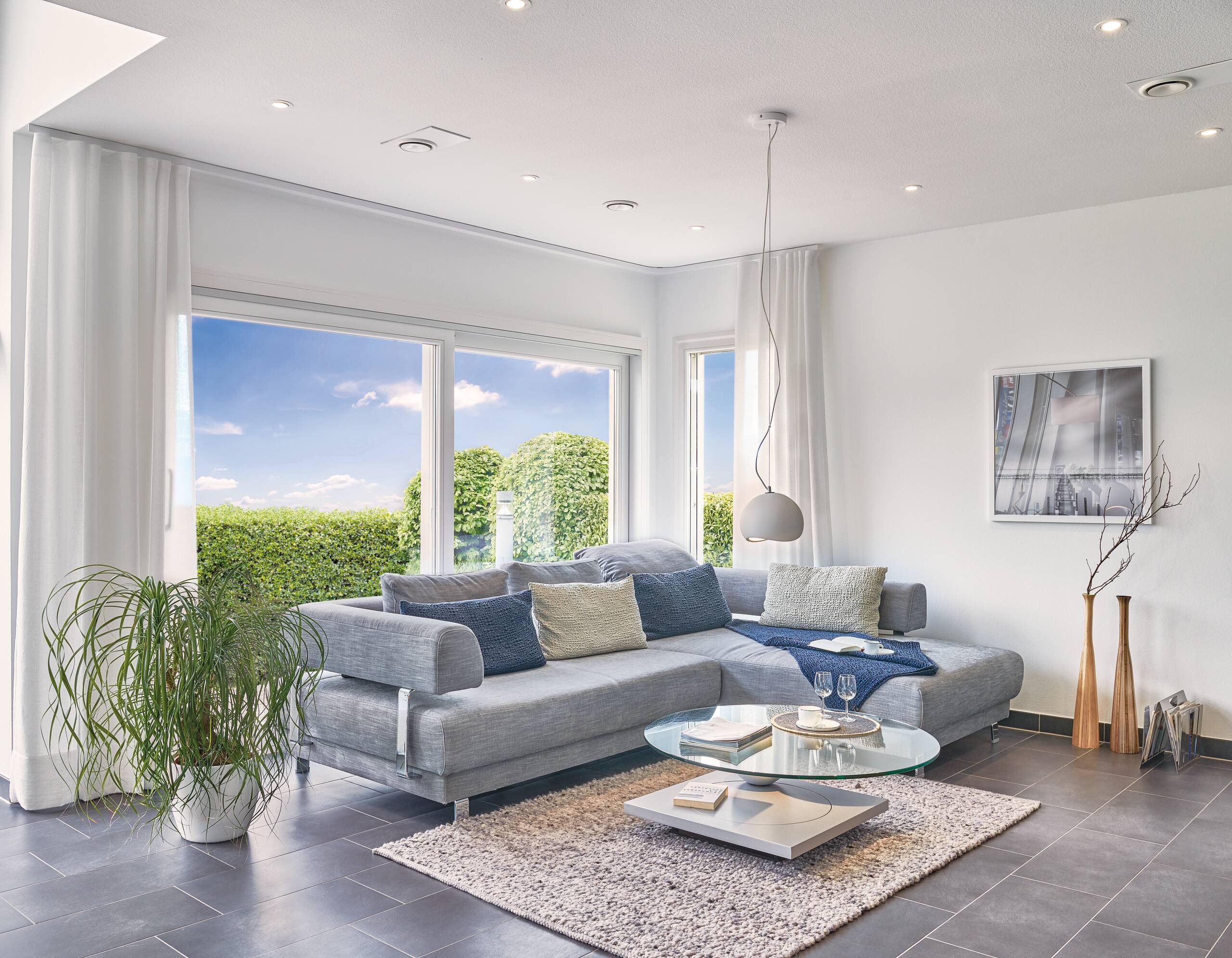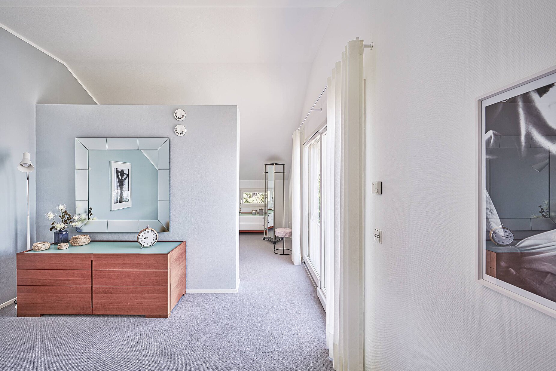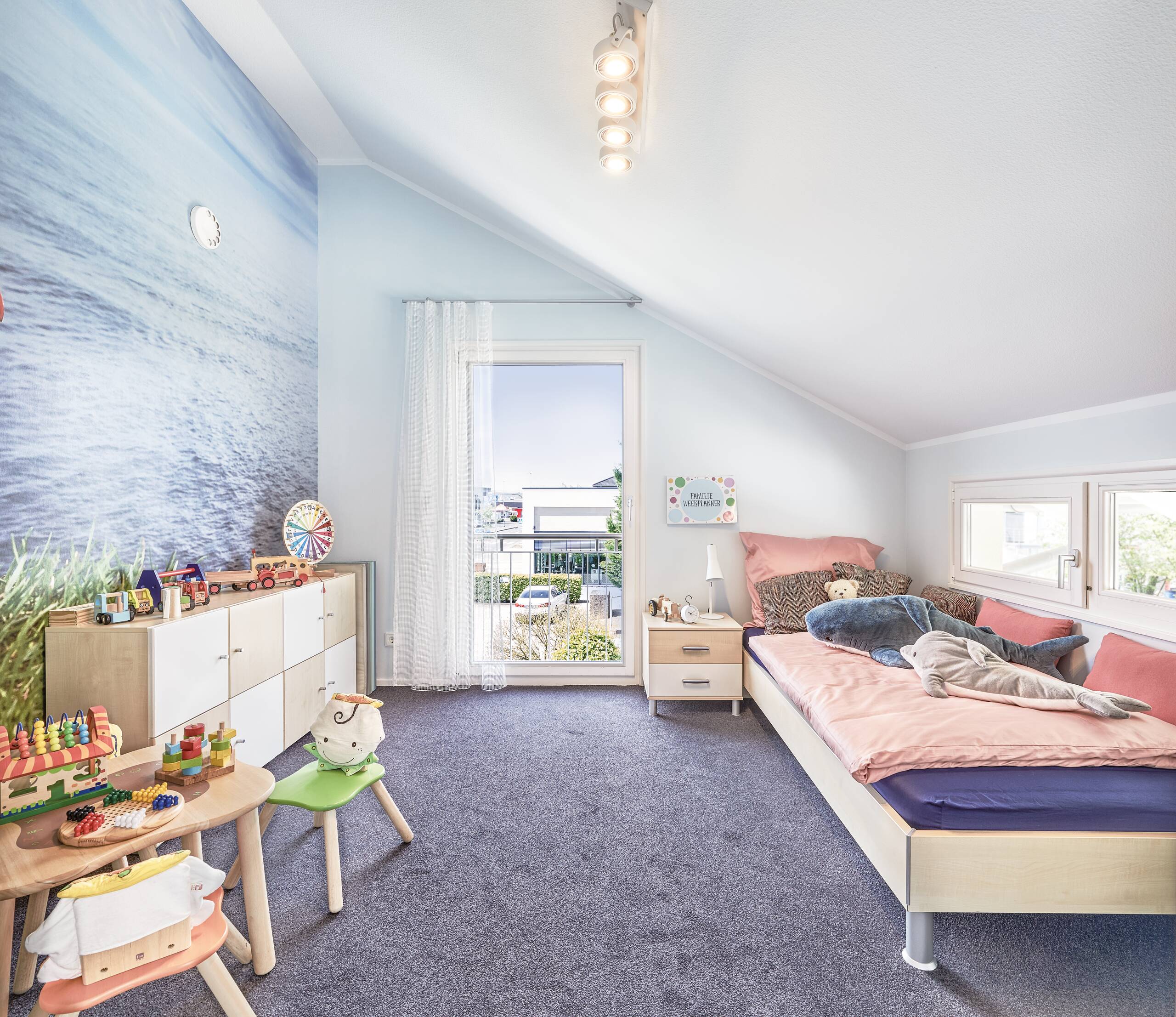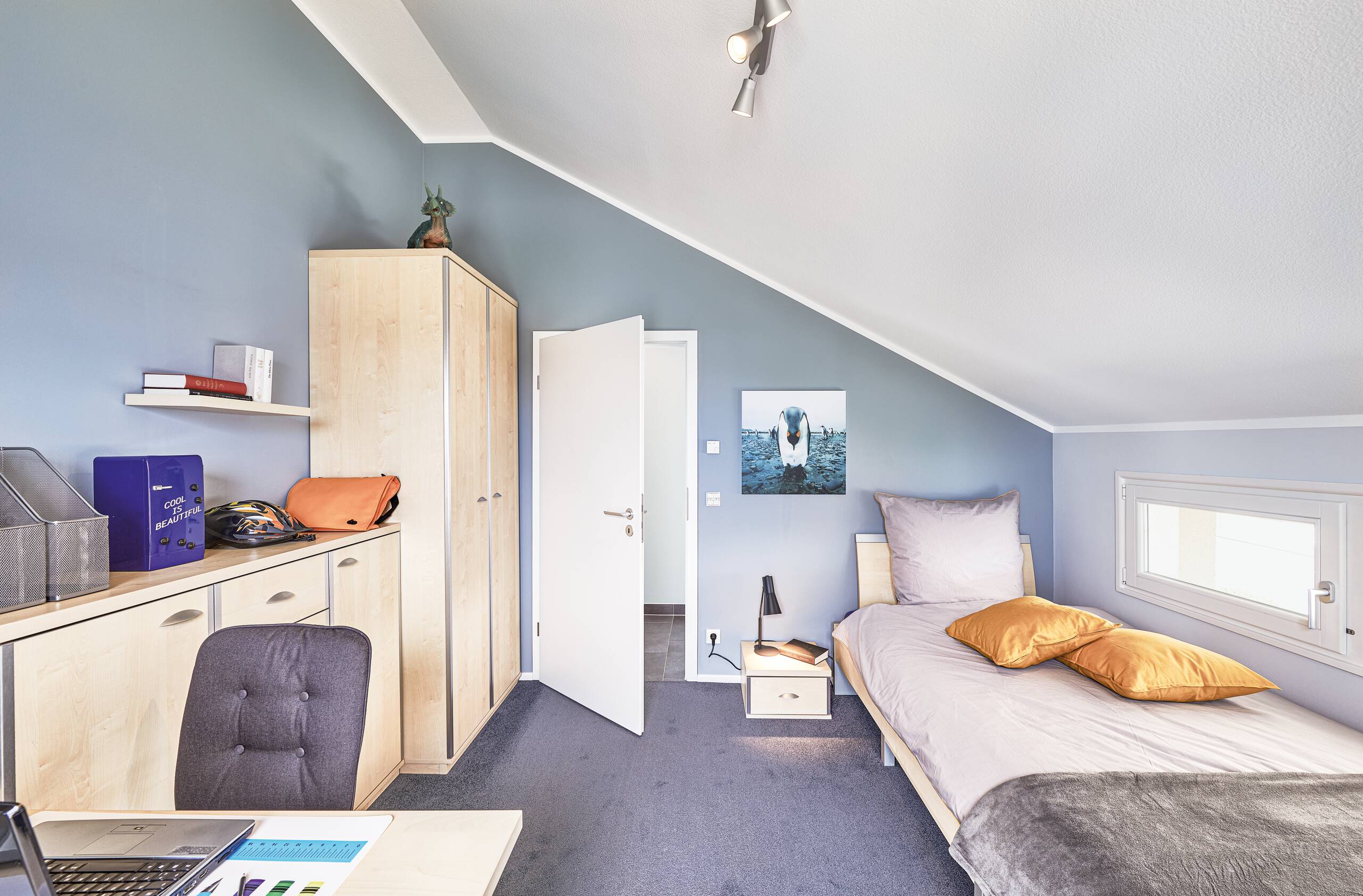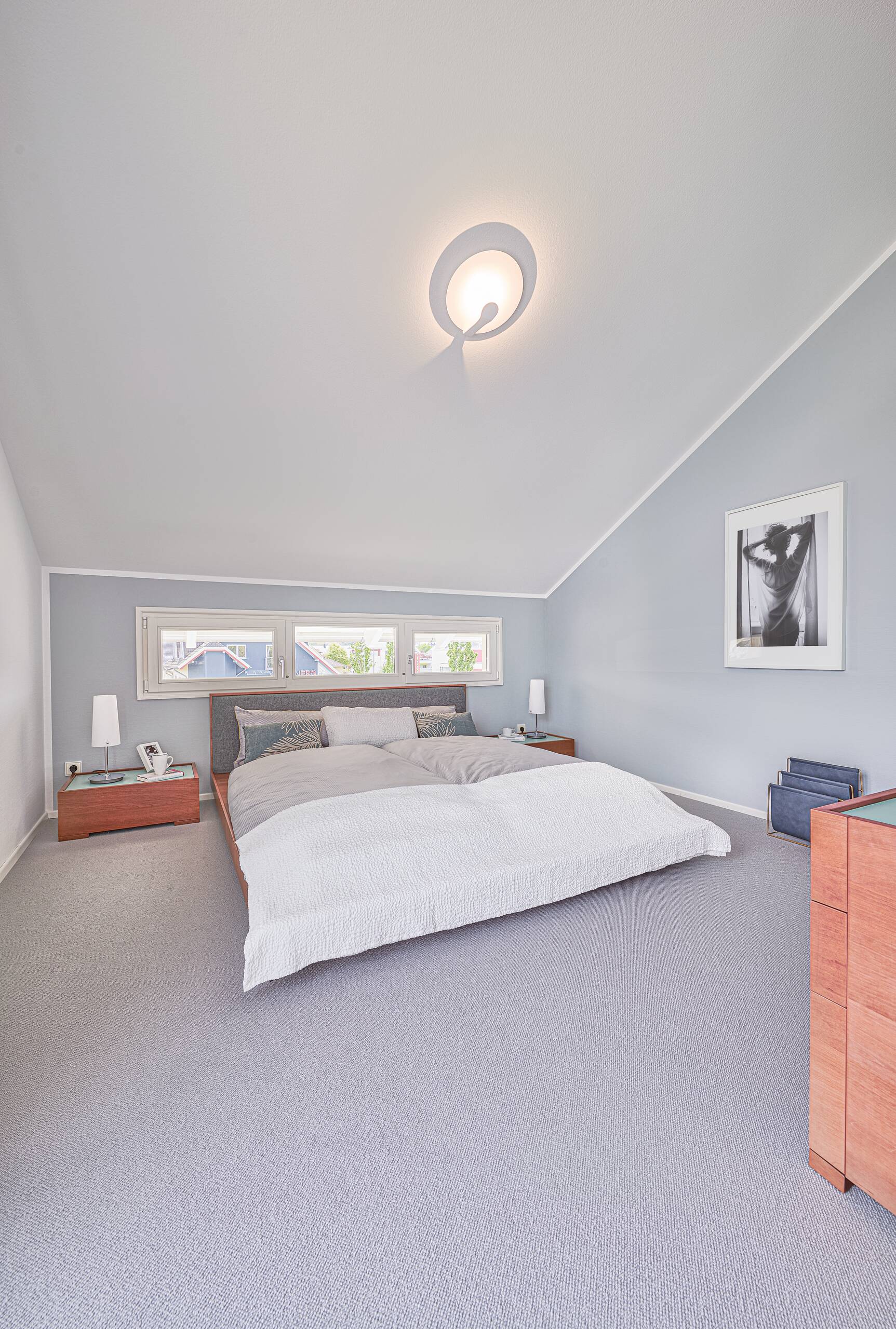 Aufregend ist das Innere dieses rechteckigen Einfamilienhauses, wo sich an einen großen Wohn-Essbereich eine offene Küche anschließt. Der Wohnbereich ist nach oben hin geöffnet, sodass der Glaserker seine volle Lichtwirkung im ganzen Haus verteilen kann. Oberhalb des Essbereichs schwebt dann gewissermaßen das Bad, das durch ein Fenster auch den Blick durch den Glaserker ins Freie erlaubt. Eine unkonventionelle Anordnung, die immer wieder für Begeisterung bei Ihren Gästen sorgen wird. Das Haus ist großzügig bemessen für eine Familie mit zwei bis drei Kindern.