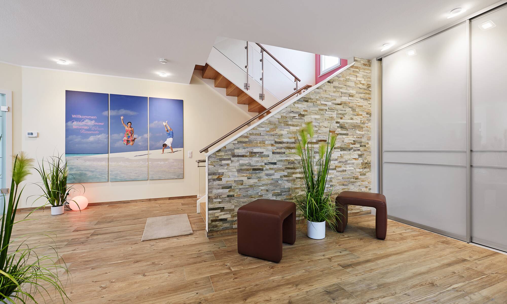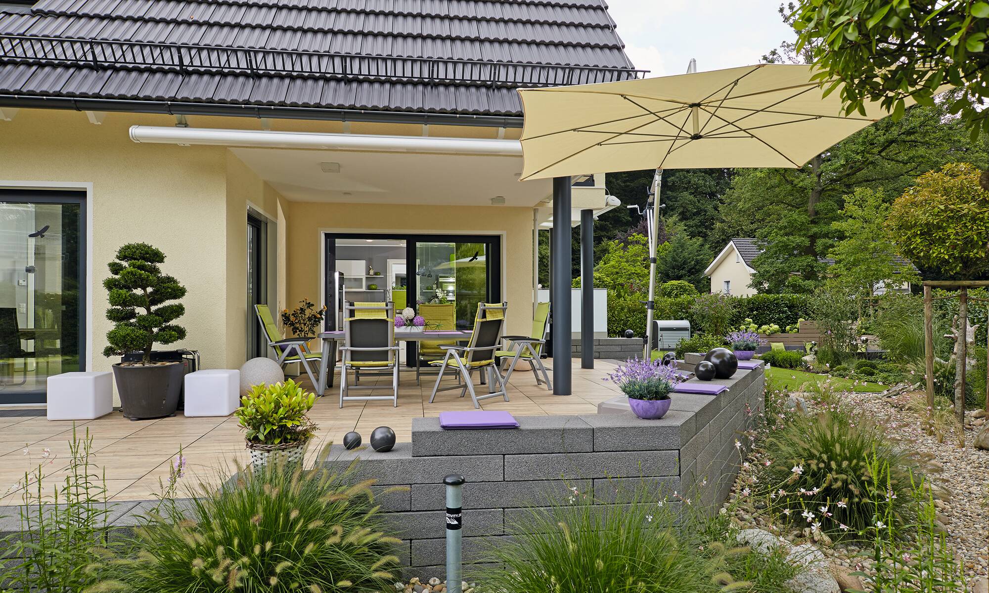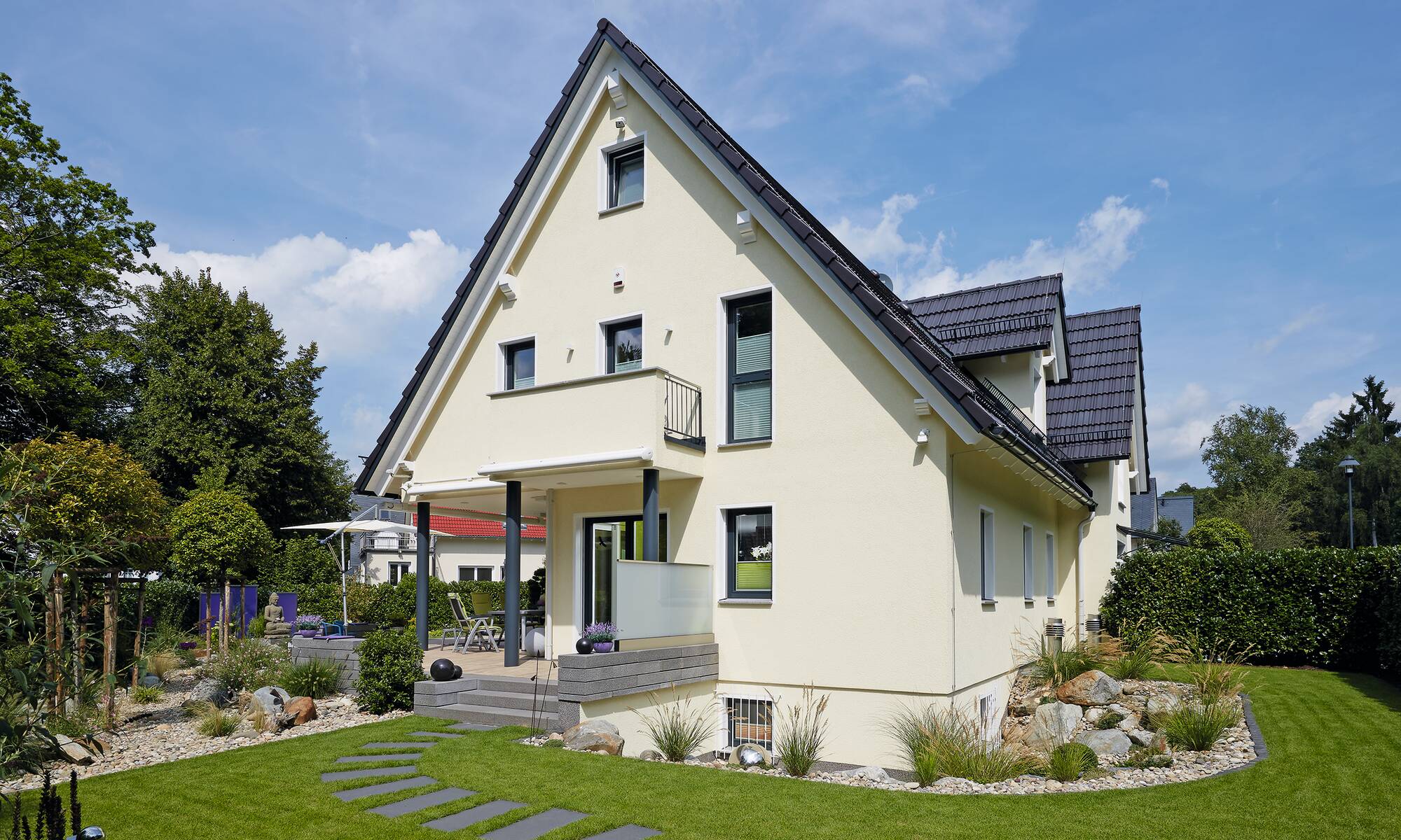 Mit diesem frei geplanten Architektenhaus hat sich das Bauherrenpaar seine Wohlfühloase erschaffen. Es verfügt über drei Giebel, zwei Balkone, eine Garage sowie einen Wohnkeller. Das steile Satteldach in Kombination mit dem hellgelben Putz und den anthrazitgrauen Fensterahmen sowie Dachziegeln mit integrierten Photovoltaik-Modulen verleiht dem Eigenheim ein besonderes Aussehen.