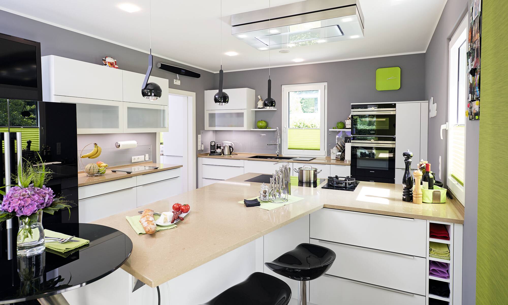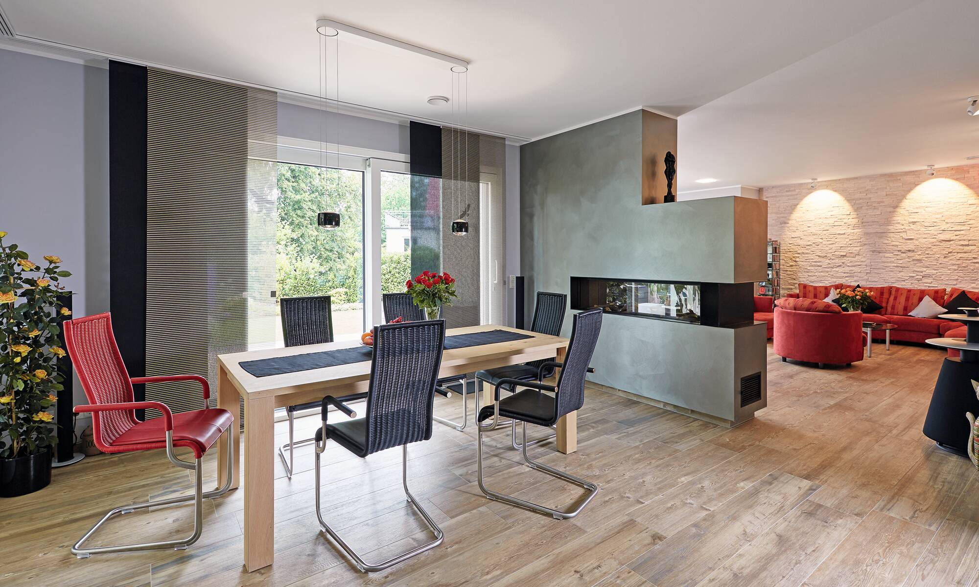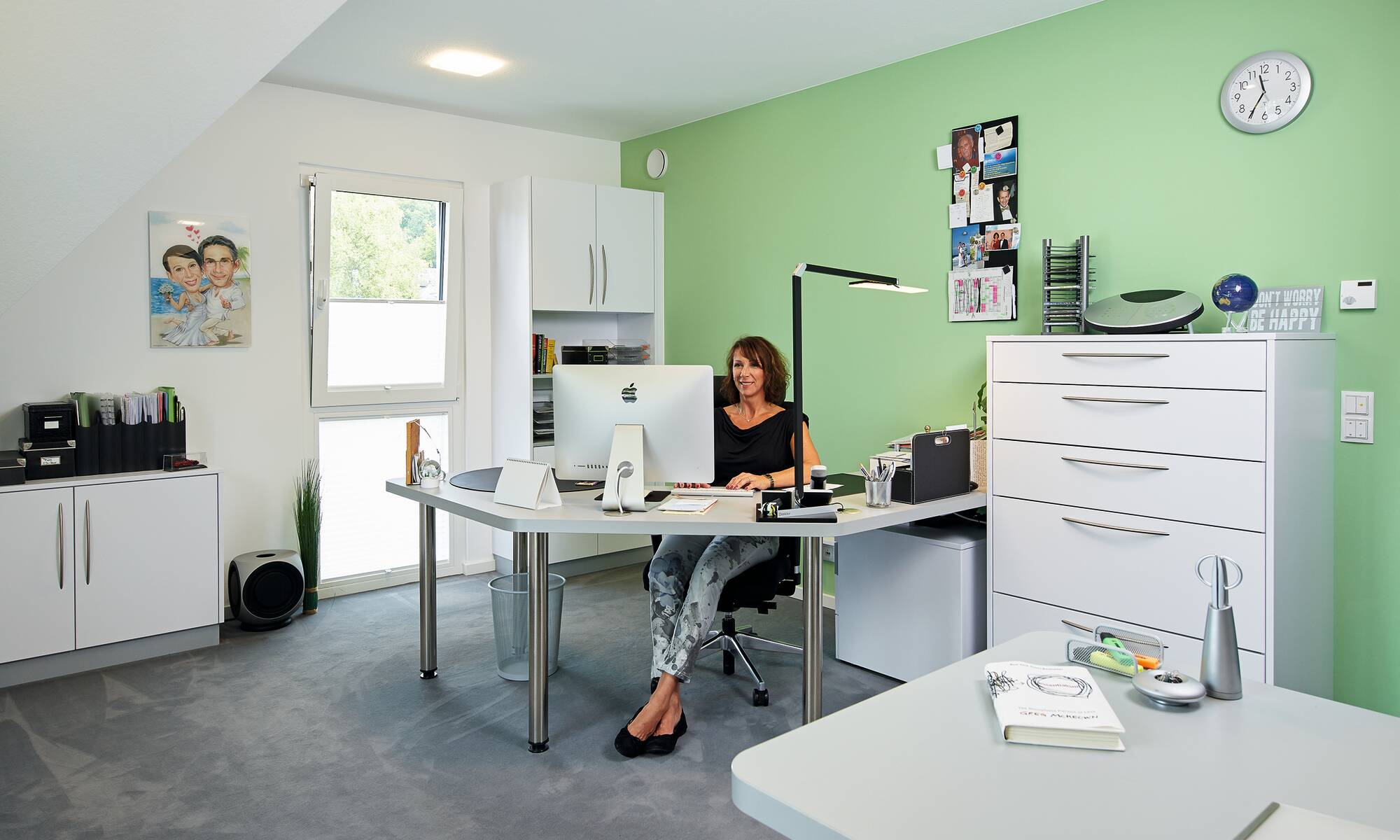 Mit diesem frei geplanten Architektenhaus hat sich das Bauherrenpaar seine Wohlfühloase erschaffen. Es verfügt über drei Giebel, zwei Balkone, eine Garage sowie einen Wohnkeller. Das steile Satteldach in Kombination mit dem hellgelben Putz und den anthrazitgrauen Fensterahmen sowie Dachziegeln mit integrierten Photovoltaik-Modulen verleiht dem Eigenheim ein besonderes Aussehen.