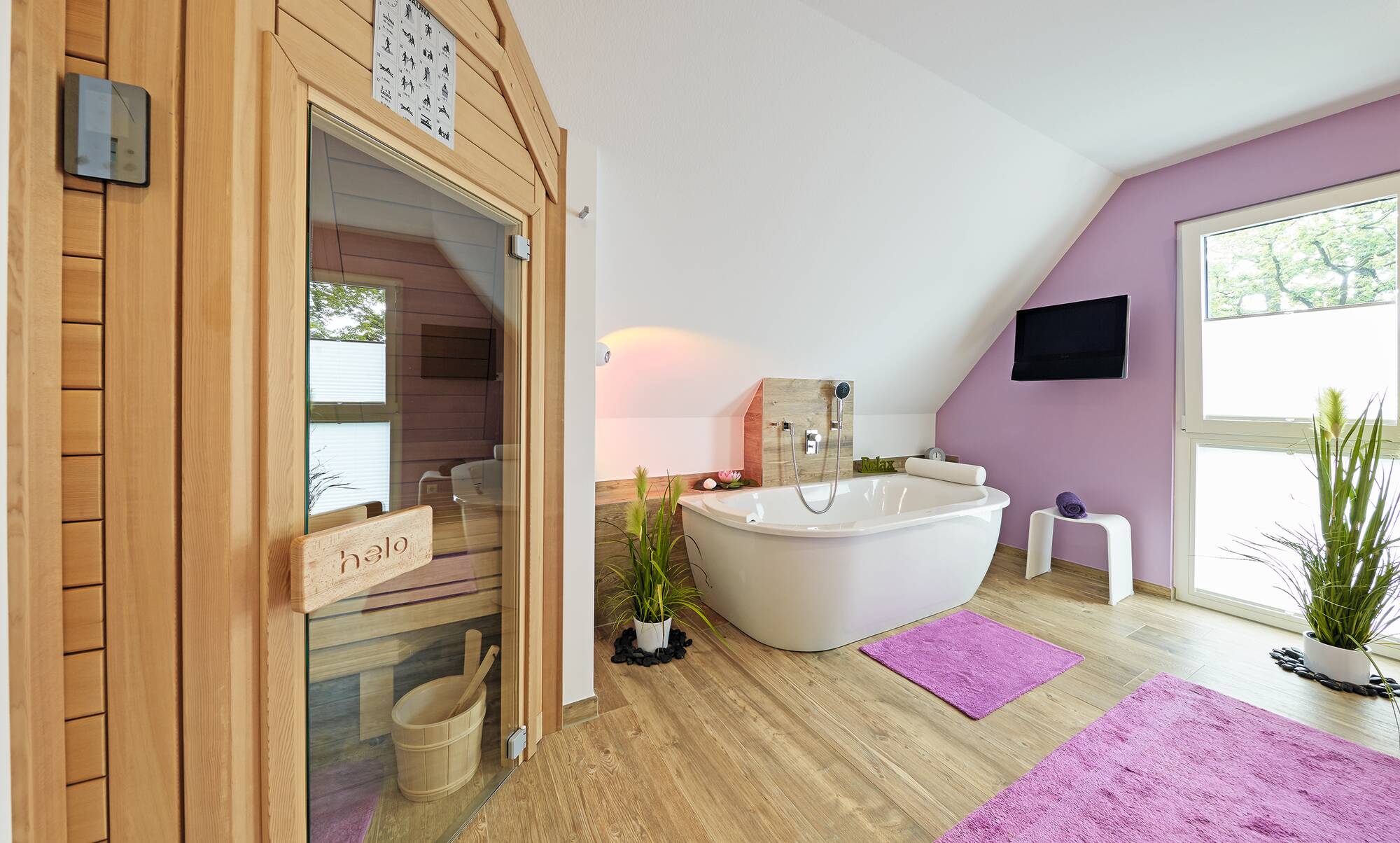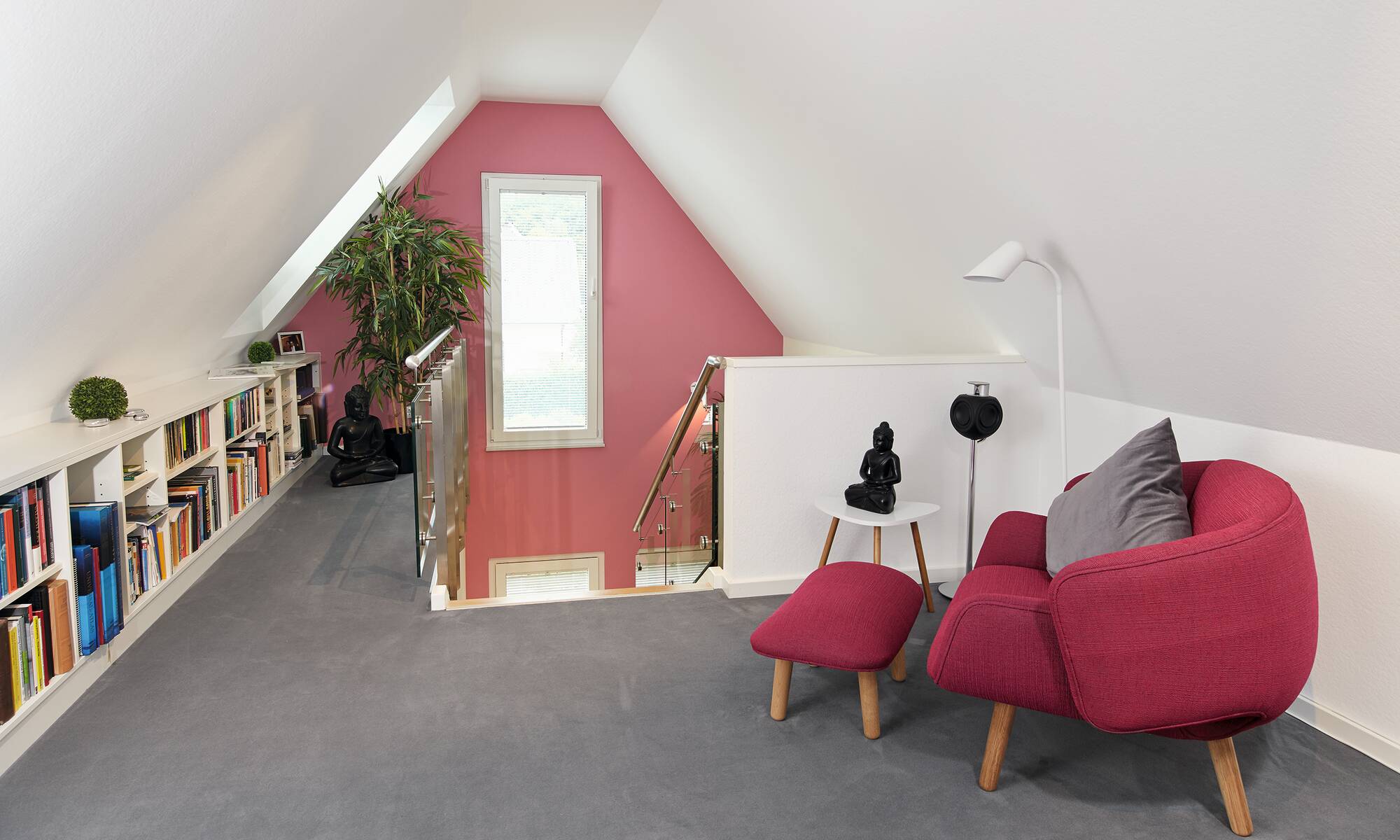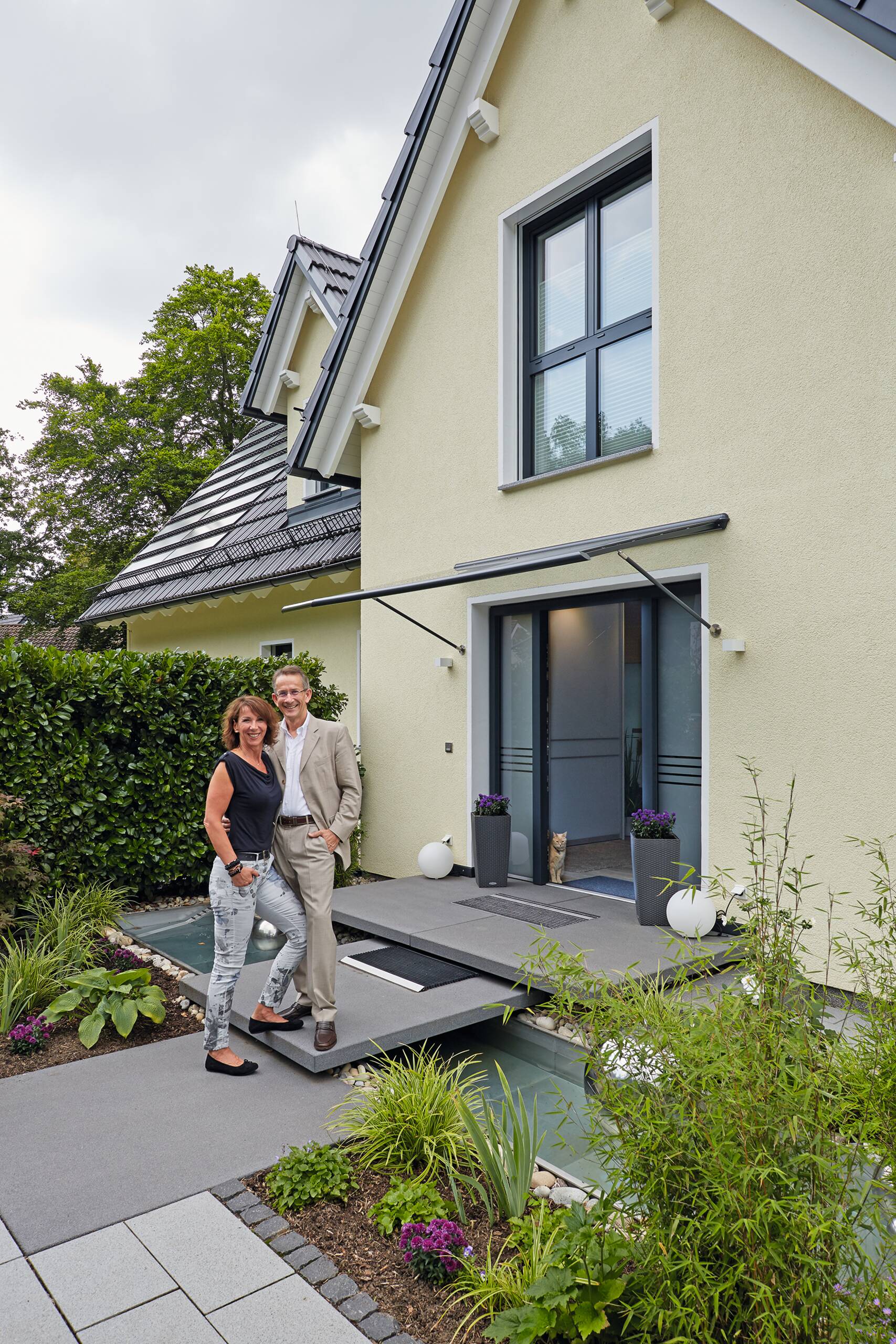 Mit diesem frei geplanten Architektenhaus hat sich das Bauherrenpaar seine Wohlfühloase erschaffen. Es verfügt über drei Giebel, zwei Balkone, eine Garage sowie einen Wohnkeller. Das steile Satteldach in Kombination mit dem hellgelben Putz und den anthrazitgrauen Fensterahmen sowie Dachziegeln mit integrierten Photovoltaik-Modulen verleiht dem Eigenheim ein besonderes Aussehen.