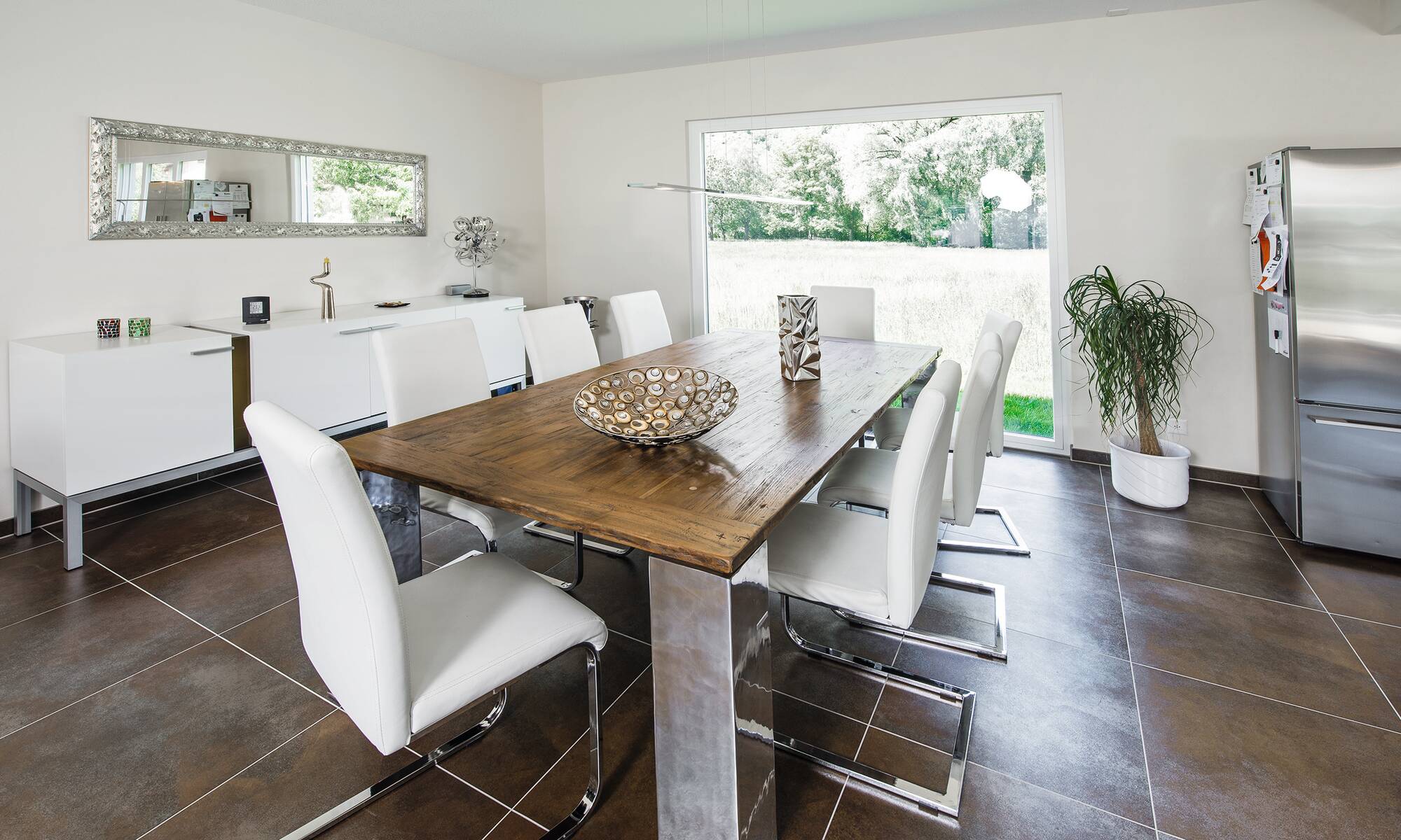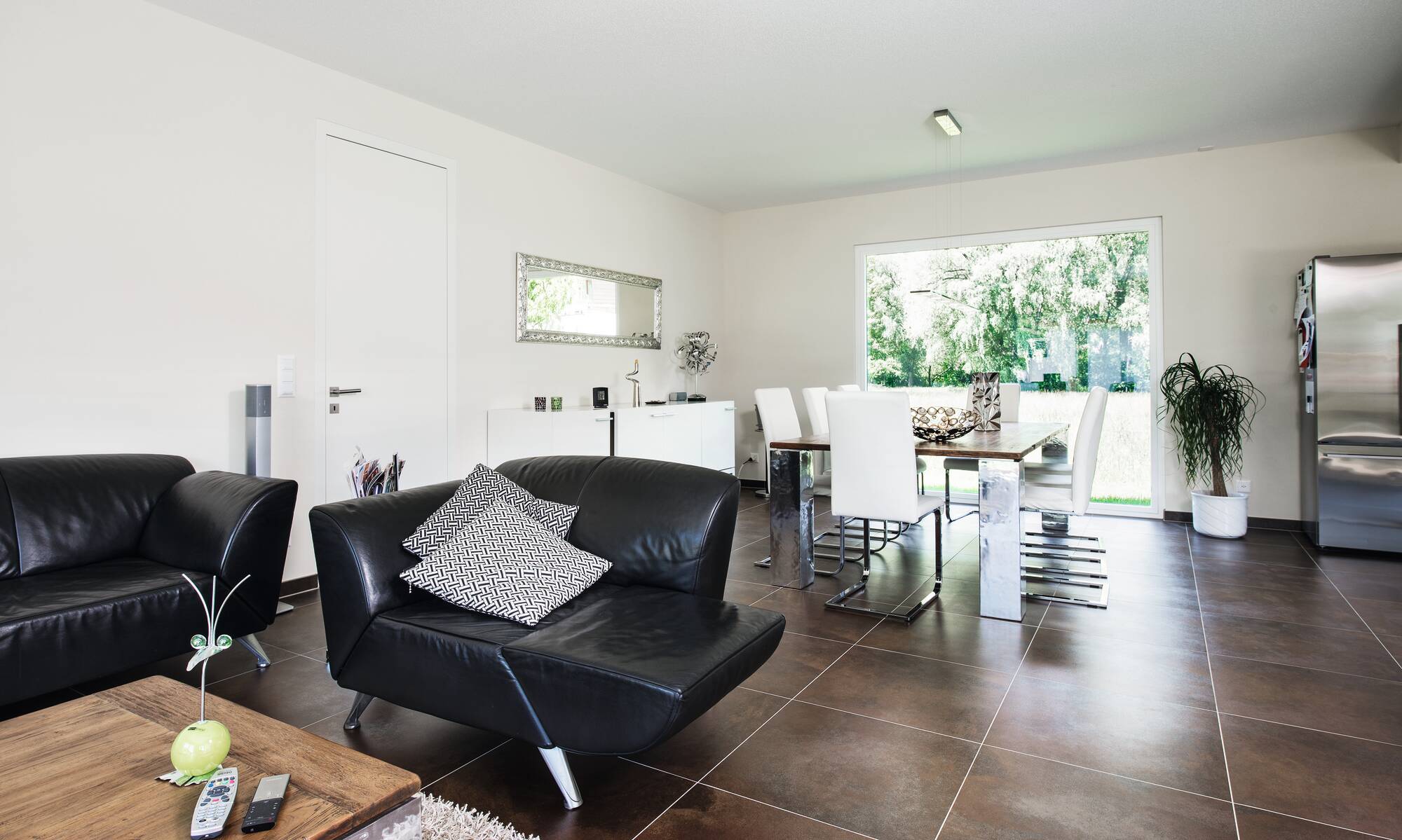 Am Rande eines idyllisch gelegenen Schweizer Örtchens realisierte eine Baufamilie diesen exklusiven Bungalow mit u-förmigem Grundriss und großer Terrasse. Die geschickte Raumeinteilung, die sich durch den schmalen Grundriss ergeben hat, erleichtert den gesamten Tagesablauf der Familie: „Keller, Garage und Hauswirtschaftsraum sind ideal miteinander verbunden. So kann man Einkäufe schnell in den Keller bringen oder die Wäsche machen, bevor es in den Wohnbereich geht“, so der Bauherr. Inspiriert durch italienische Einrichtungshäuser entstand ein mediterranes Raumkonzept, bei dem Braun- und Beigetöne dominieren. Im Bekanntenkreis gilt der Bungalow als „schönstes Haus im Ort“. Der zufriedene Bauherr resümiert: „Im Nachhinein würden wir alles wieder genauso machen.“