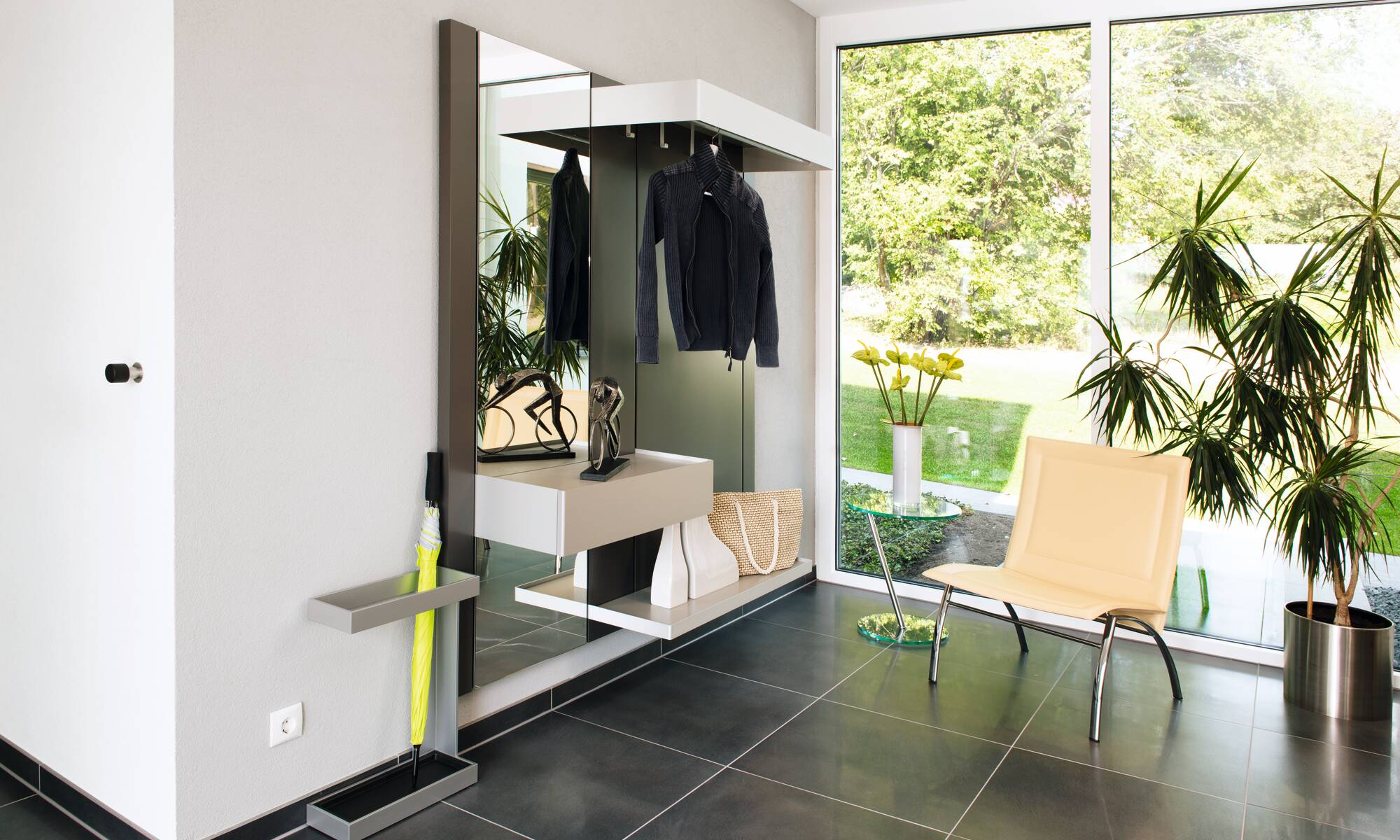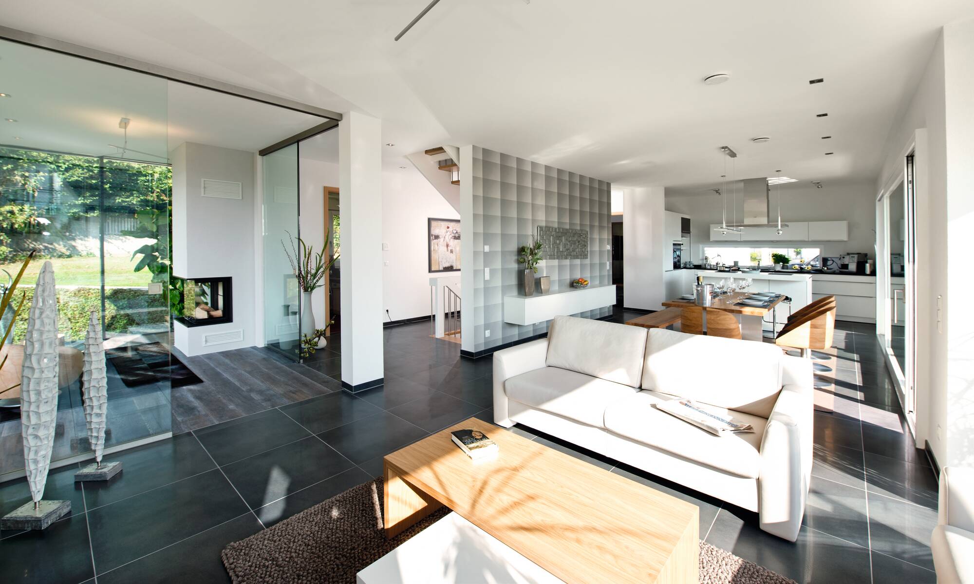 In unserem Musterhaus in Villingen-Schwenningen trifft der Charme eines gemütlichen Einfamilienhauses auf die Eleganz eines repräsentativen Wohnhauses. Die Architektur des frei geplanten Architektenhauses ist durch eine kubische Bauform mit geraden Linien geprägt. Das Haus überzeugt im modernen und zugleich klassischen Bauhausstil. Unter dem Flachdach des zeitlosen Traumhauses verbergen sich zwei Vollgeschosse und damit jede Menge Raum zum Wohlfühlen, Entspannen und Glücklichsein. Anthrazitgraue Fensterrahmen bilden einen harmonischen Kontrast zur weiß verputzten Außenfassade.