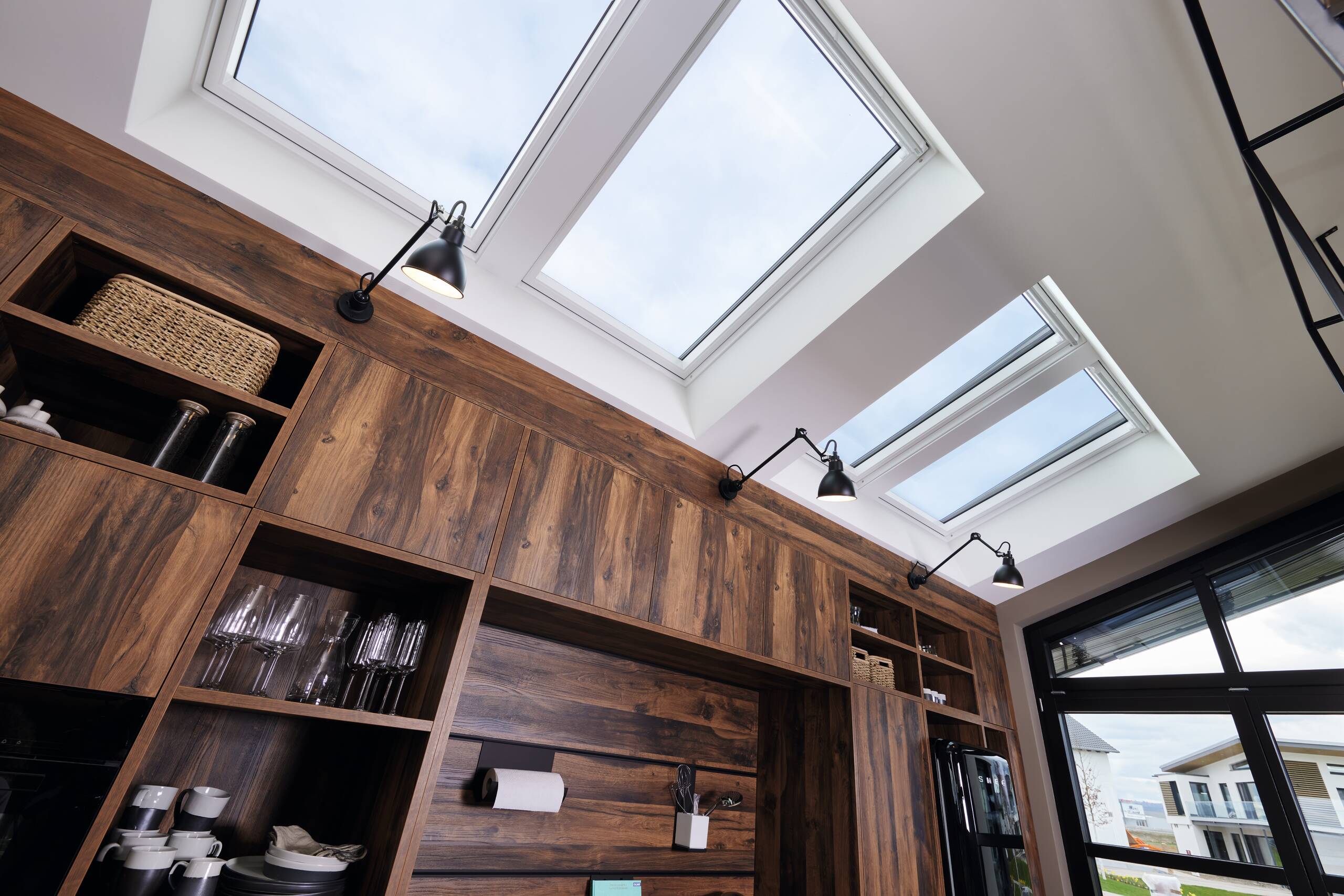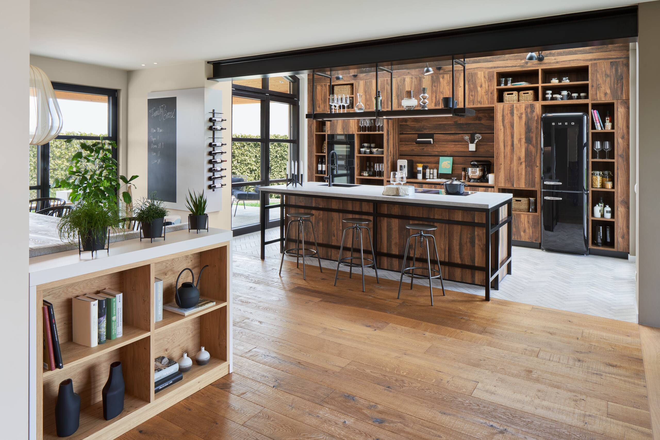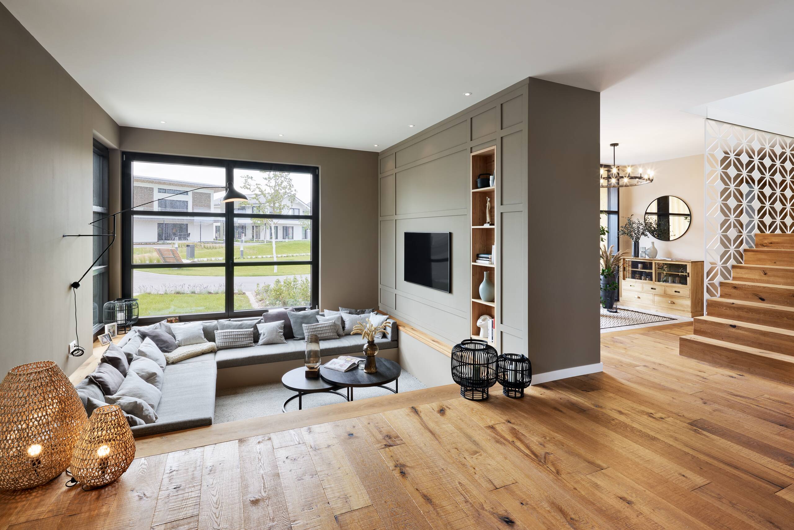 Das frei geplante Architektenhaus zeigt, wie Familien sich einen modernen Wohntraum erfüllen können und punktet dabei mit stilvoller Architektur, Funktionalität, hoher Energieeffizienz, nachhaltiger Bauweise und zahlreichen individuellen Highlights. Das Architektenhaus präsentiert sich als zeitlos stilvolles, zweigeschossiges Landhaus mit einem Walmdach. So wird der quaderförmige Baukörper durch Anbauten erweitert, die das Haus optisch bereichern und gleichzeitig funktional durchdacht sind. Aufgelockert wird die Putzfassade durch eine Holzschalung aus sibirischer Lärche. Die Sprossenfenster sind ein Klassiker, die im Industrie-Look modern interpretiert sind.