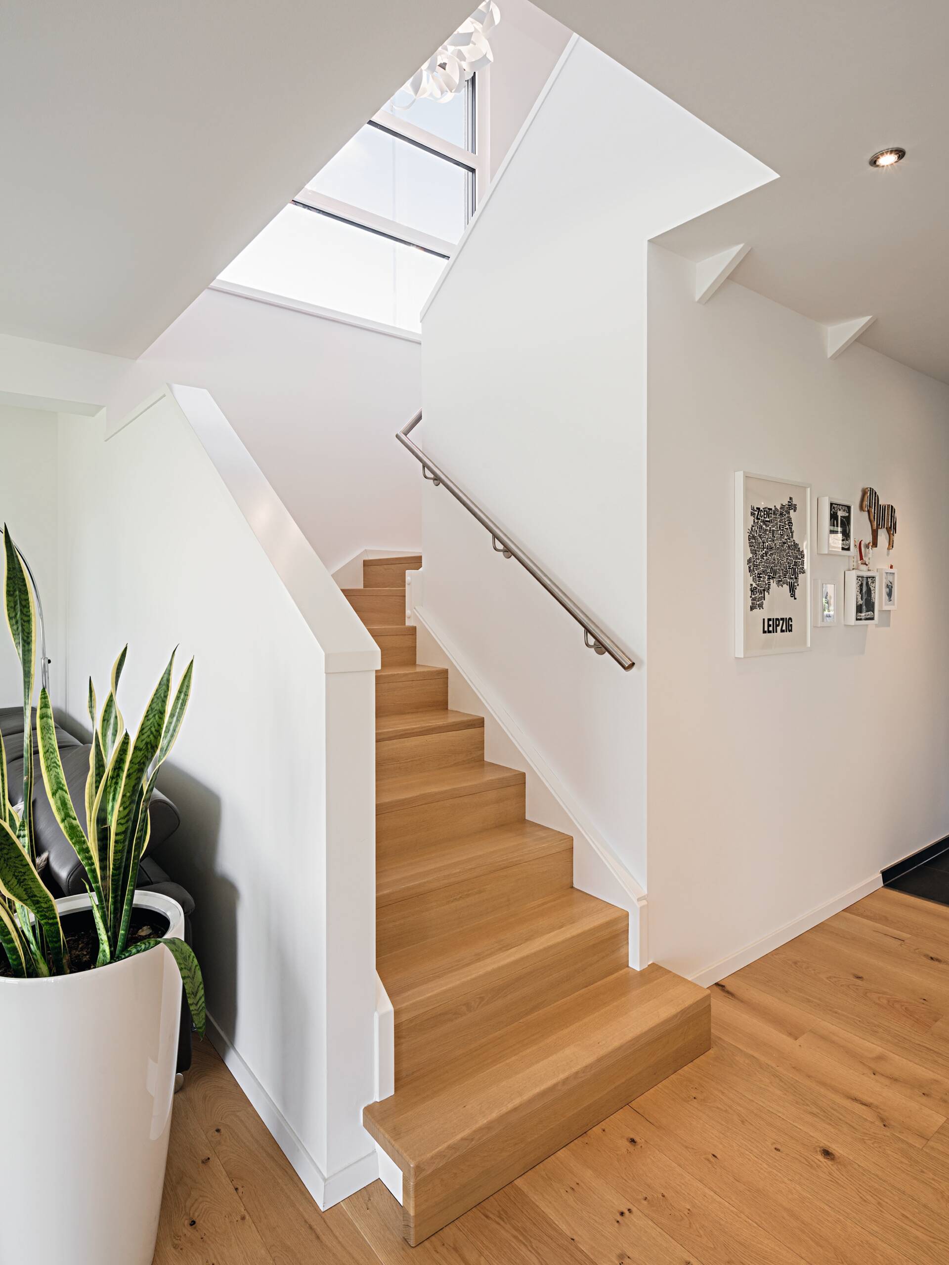 Schick, offen und mit viel Licht – so präsentiert sich dieses frei geplante Architektenhaus, das an einem See im Norden von Leipzig liegt. Den Grundriss haben die Bauherren selbst entworfen. Die holzähnliche Fassade aus Trespa-Meteon-Platte bildet einen Kontrast zum modernen Bauhausstil und bringt Wärme ins Spiel. Über dieses Stilmittel wurde die Garage optisch mit dem Haus verbunden. Als Hingucker dient das große Fenster am Treppenaufgang. Der Kubus wartet mit weiteren besonderen Akzenten wie etwa einer Terrasse aus Douglasienholz auf. Mit einer Wohnfläche von über 180 Quadratmeter bietet das Haus viel Platz.