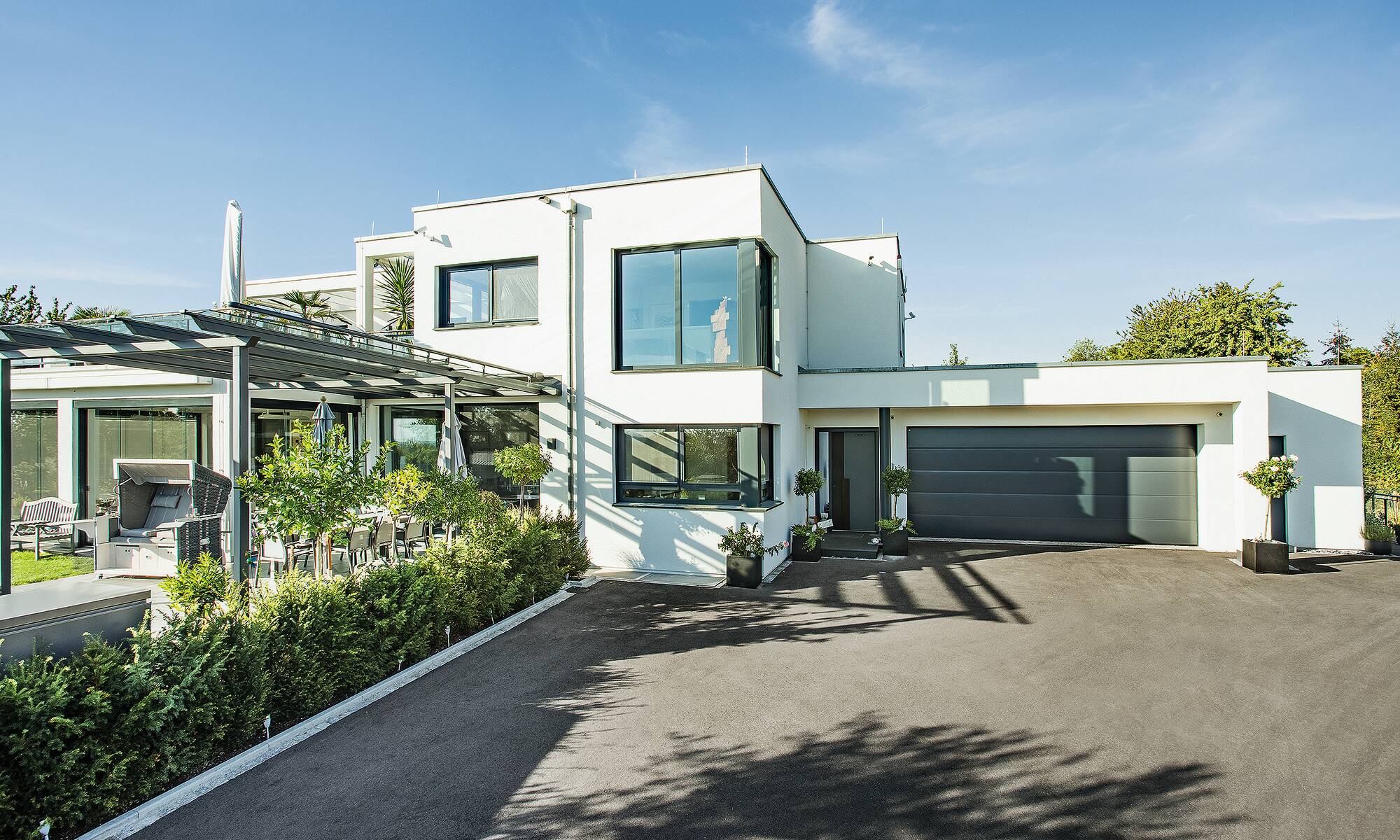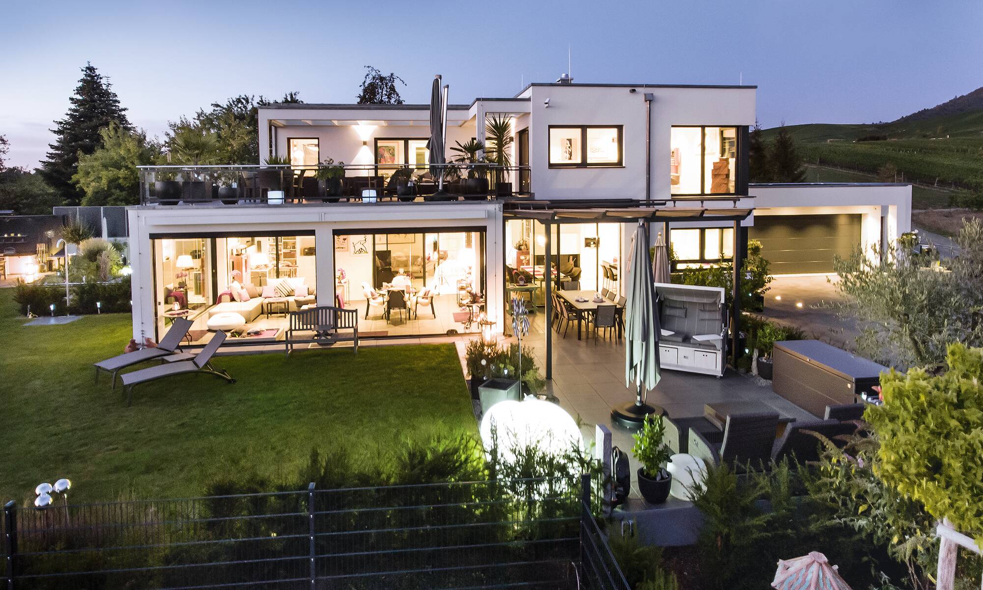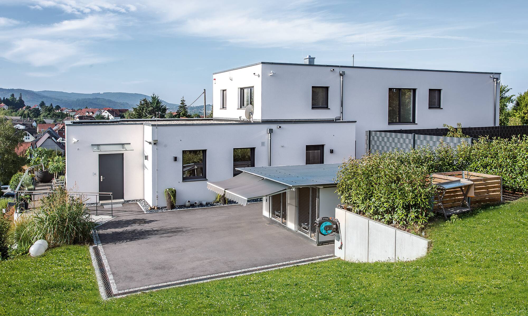 Dieses Fertighaus in ökologischer Holzbauweise steht am Ortseingang eines kleinen Dorfes im Schwarzwald. Die Hausplanung für das frei geplante Architektenhaus verlief zügig, da die Bauherren genaue Vorstellungen hatten, wie ihr zukünftiges Traumhaus aussehen sollte. Entstanden ist ein Luxushaus mit einer Wohnfläche von rund 490 Quadratmeter auf drei Etagen. Das Paar wünschte sich ein modernes Haus mit Flachdach und vielen Fensterfronten – ganz an den Bauhaus-Stil angelehnt. Zudem ist das Eigenheim mit Photovoltaik-Anlage, Batteriespeicher, Wärmepumpe und intelligenter Haussteuerung energetisch optimal aufgestellt.