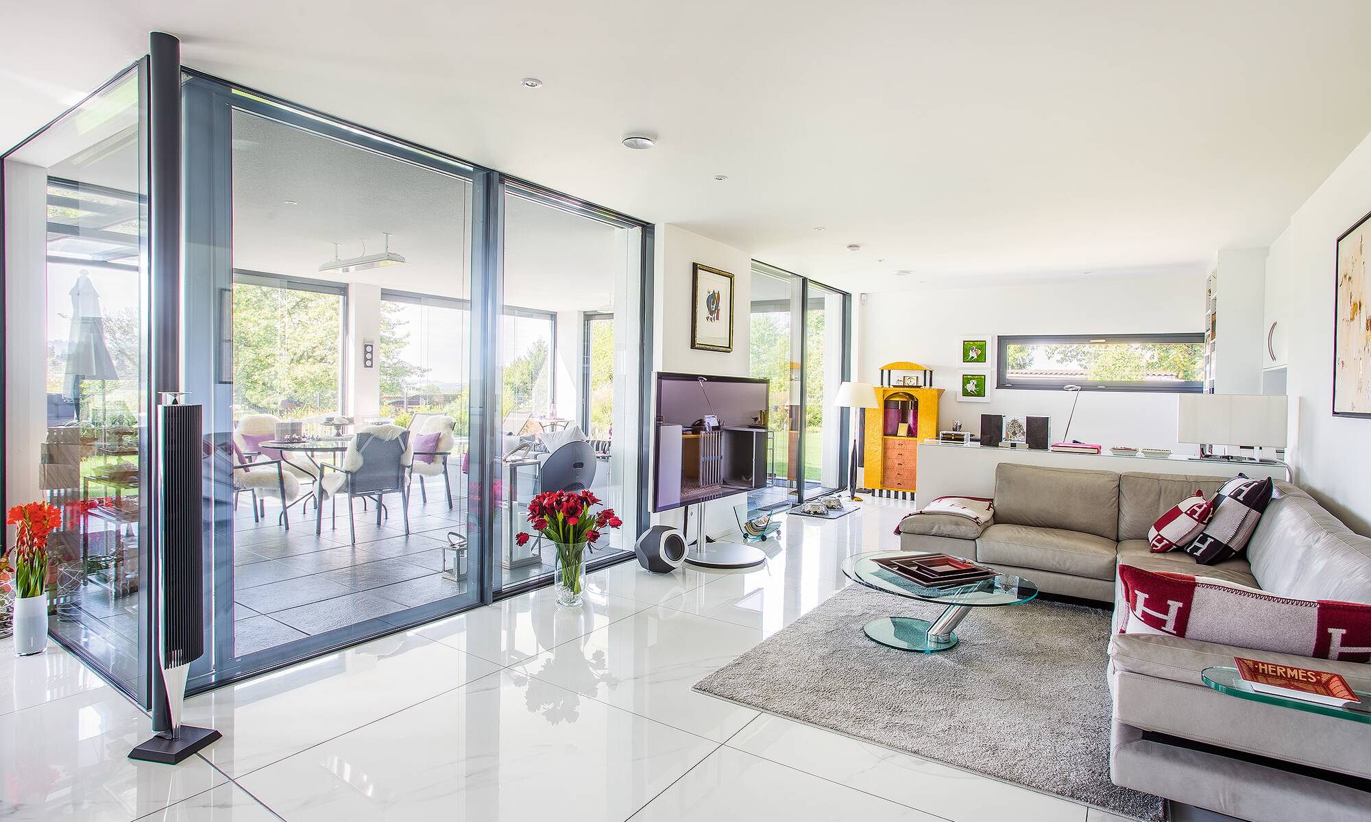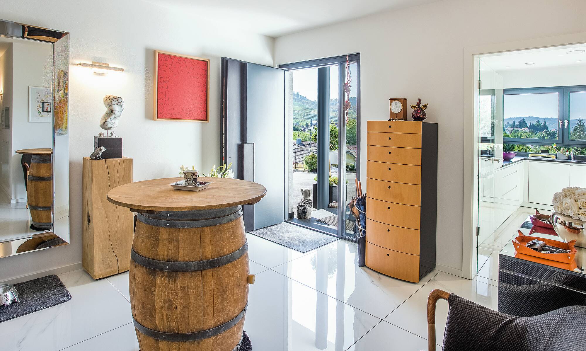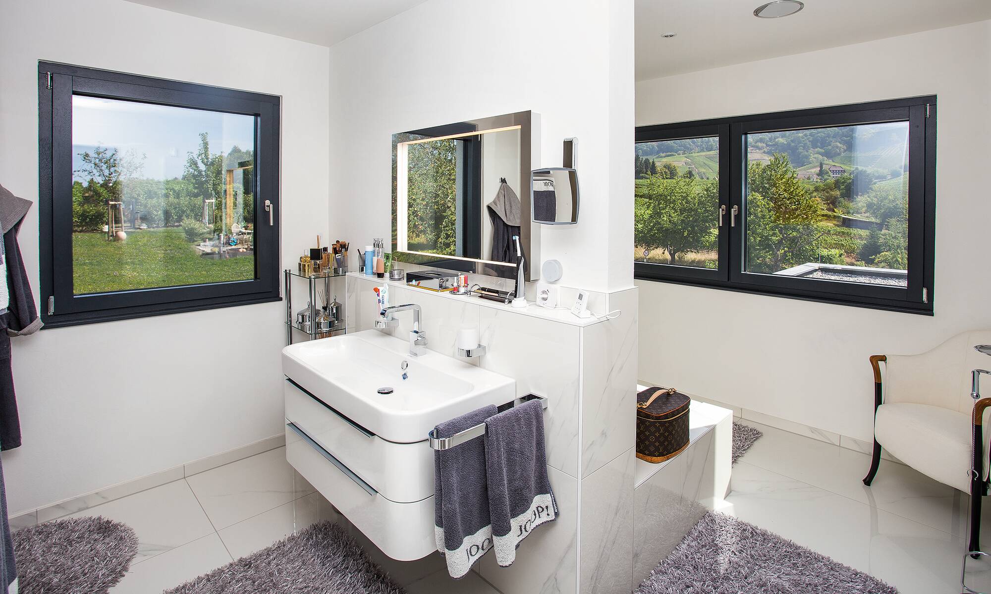 Dieses Fertighaus in ökologischer Holzbauweise steht am Ortseingang eines kleinen Dorfes im Schwarzwald. Die Hausplanung für das frei geplante Architektenhaus verlief zügig, da die Bauherren genaue Vorstellungen hatten, wie ihr zukünftiges Traumhaus aussehen sollte. Entstanden ist ein Luxushaus mit einer Wohnfläche von rund 490 Quadratmeter auf drei Etagen. Das Paar wünschte sich ein modernes Haus mit Flachdach und vielen Fensterfronten – ganz an den Bauhaus-Stil angelehnt. Zudem ist das Eigenheim mit Photovoltaik-Anlage, Batteriespeicher, Wärmepumpe und intelligenter Haussteuerung energetisch optimal aufgestellt.