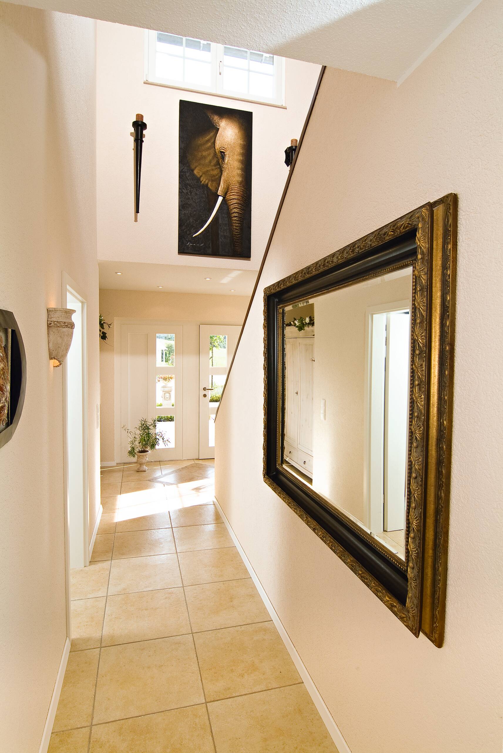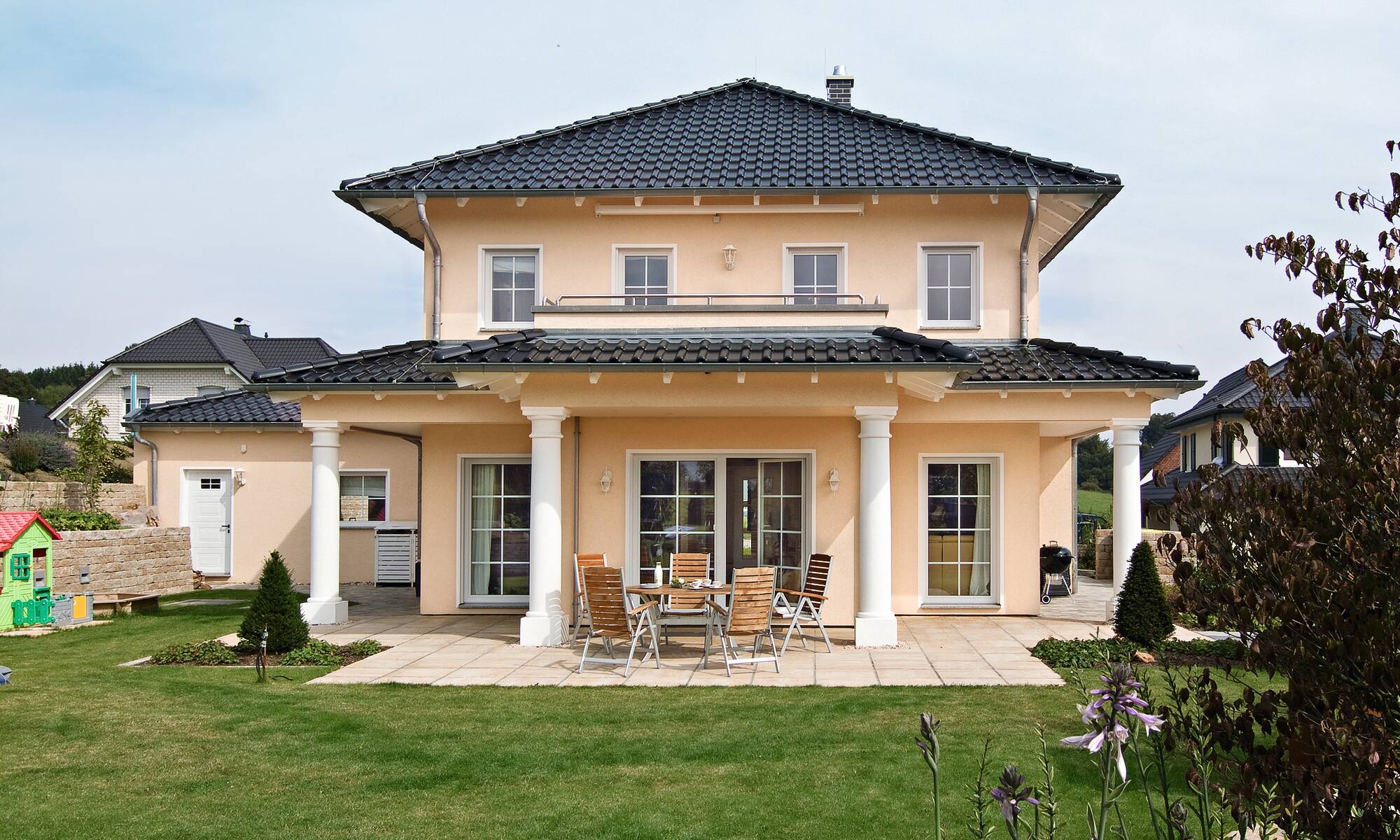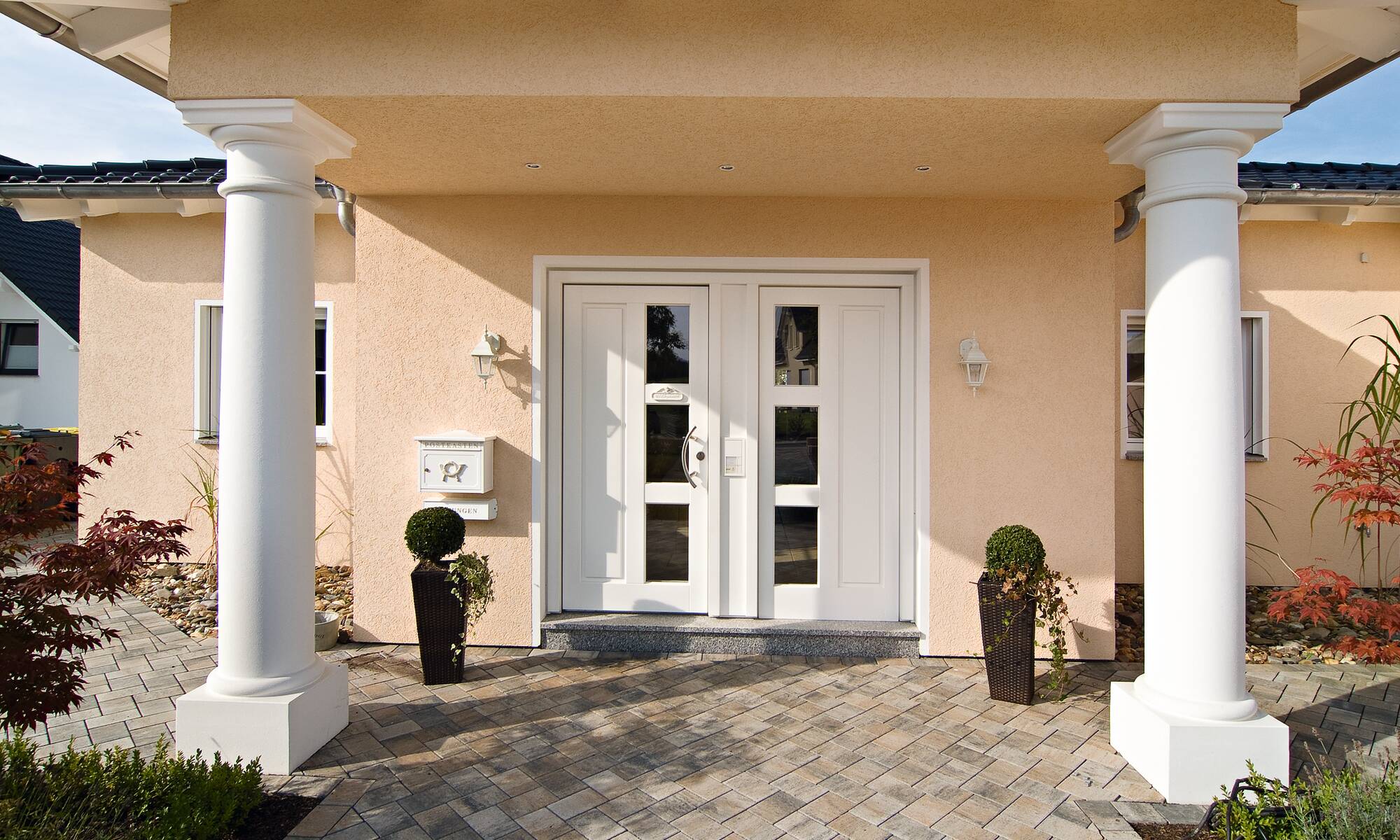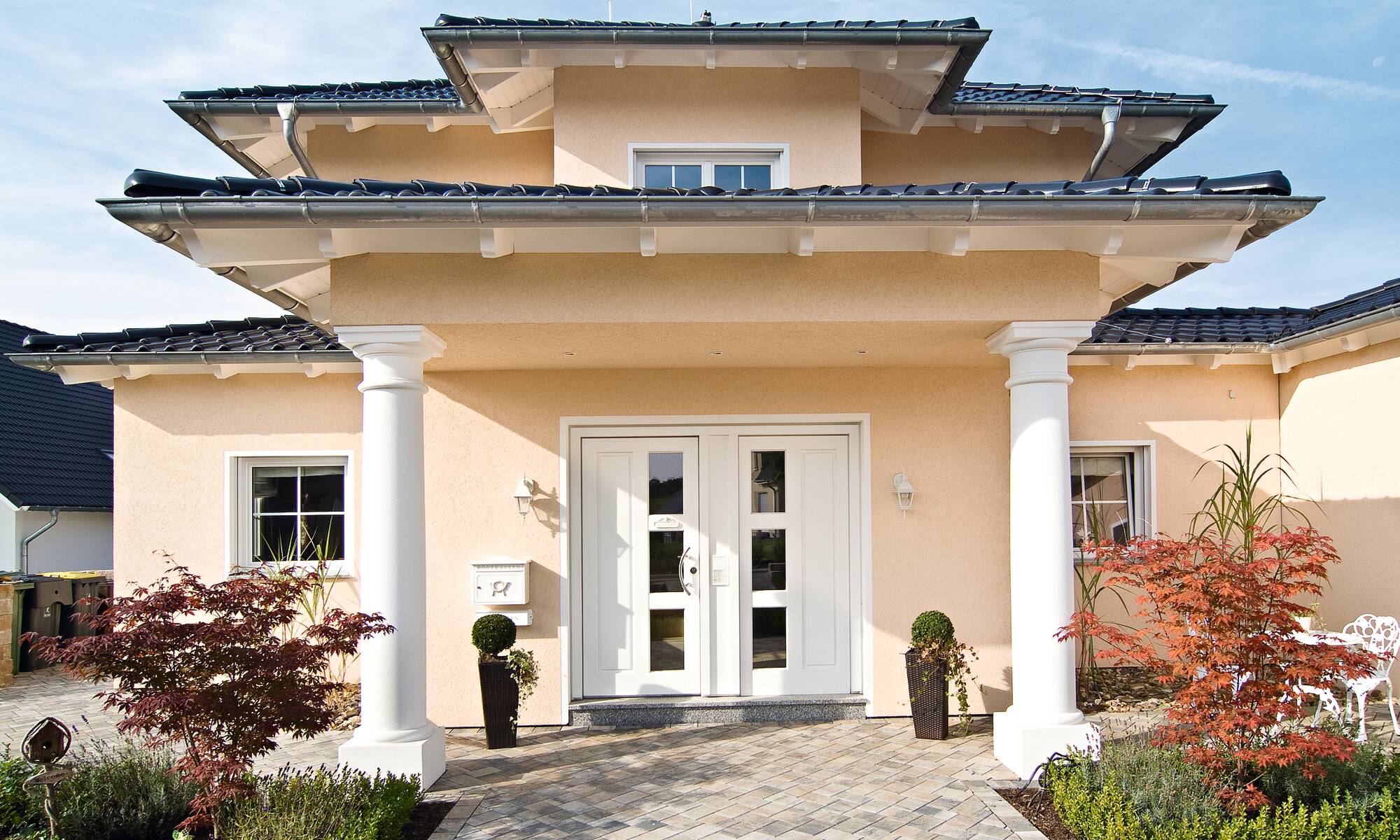 Die mediterrane Architektur stand bei diesem individuellen Entwurf Pate. Das Hauseingangsportal wirkt durch die Säulen und das ausladende Vordach besonders imposant. Das Obergeschoss ist ein kleines Stück nach innen versetzt, was dem Haus Leichtigkeit verleiht. Das Innere besticht durch eine offene Gestaltung. Die hochwertigen Materialien in erdigen Farbtönen machen die Wohnräume zu einer Quelle von Harmonie und Lebensfreude.