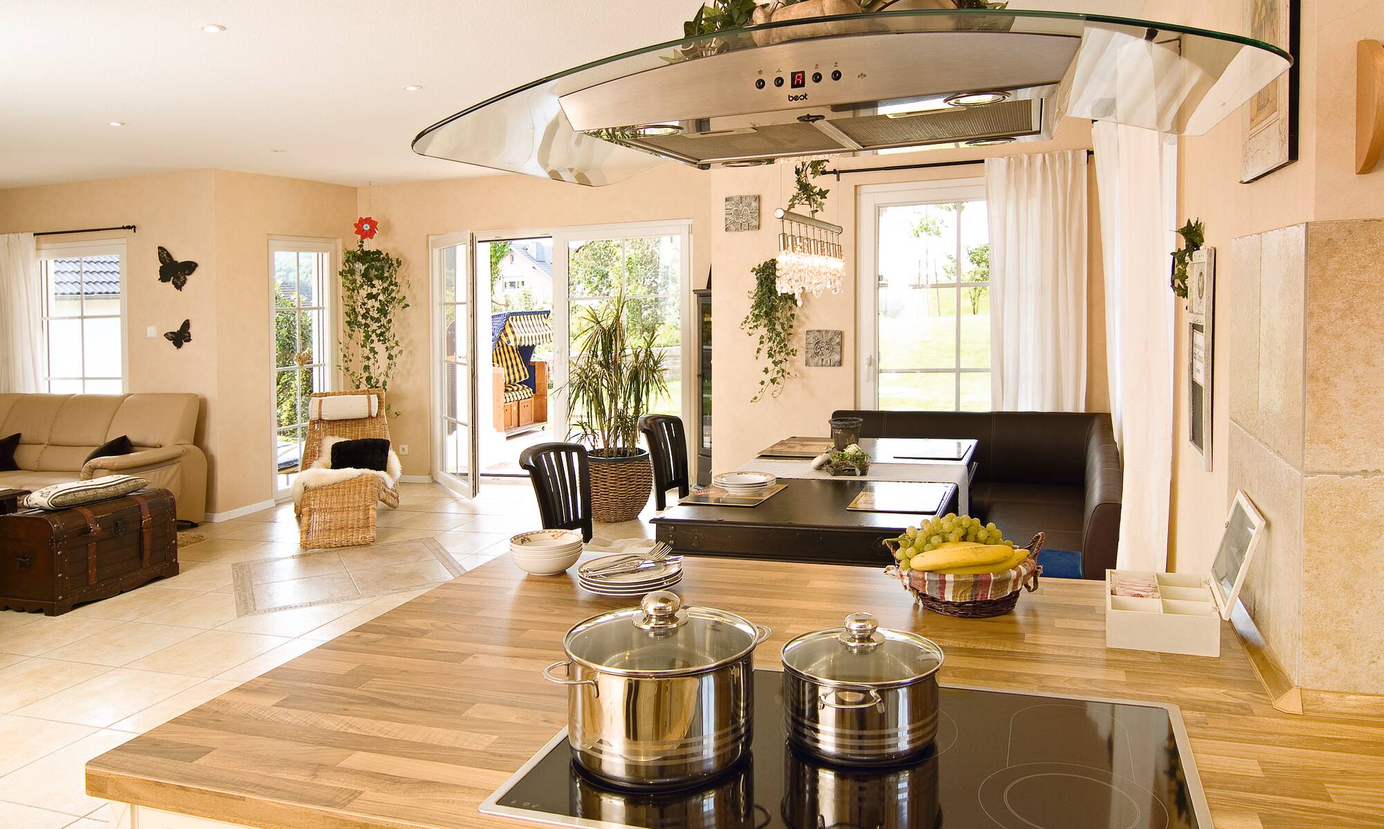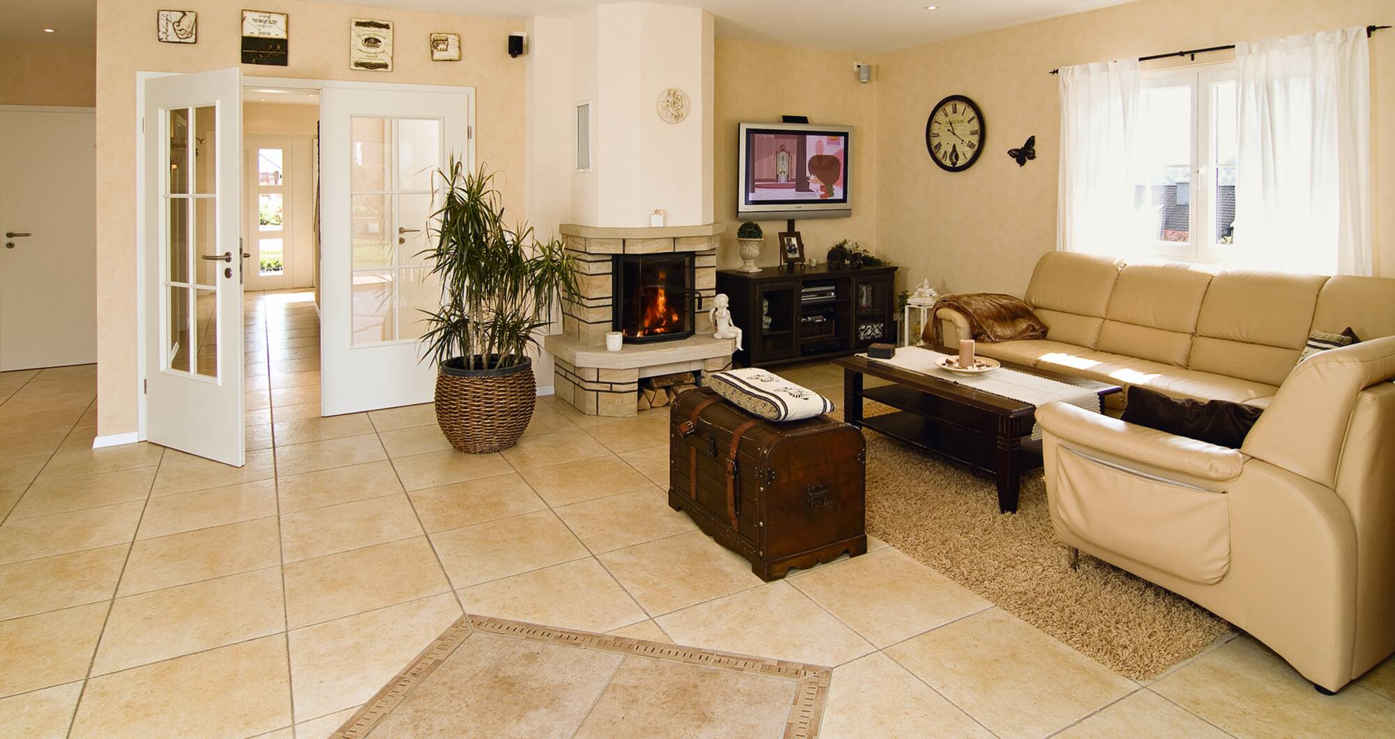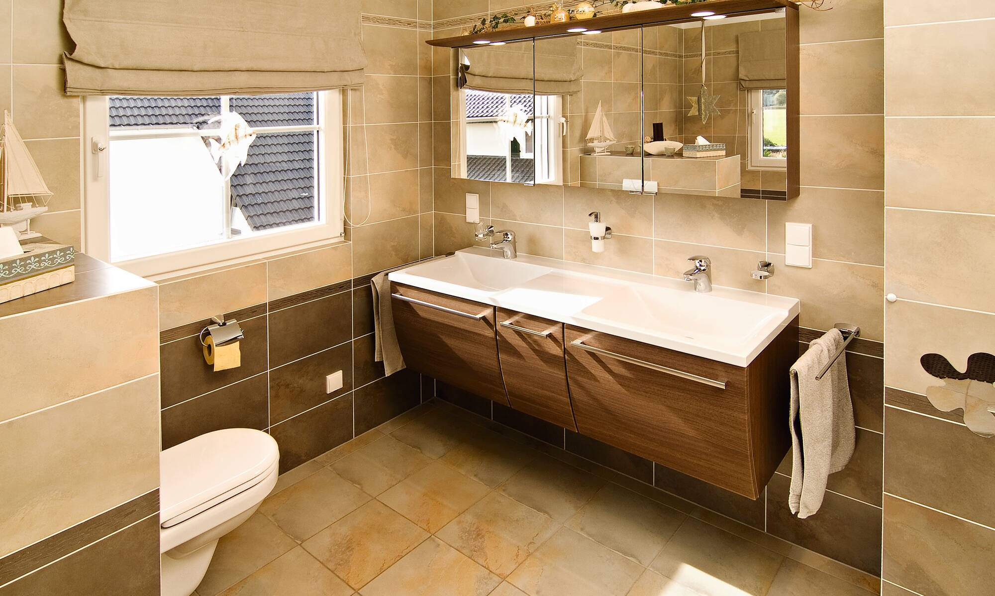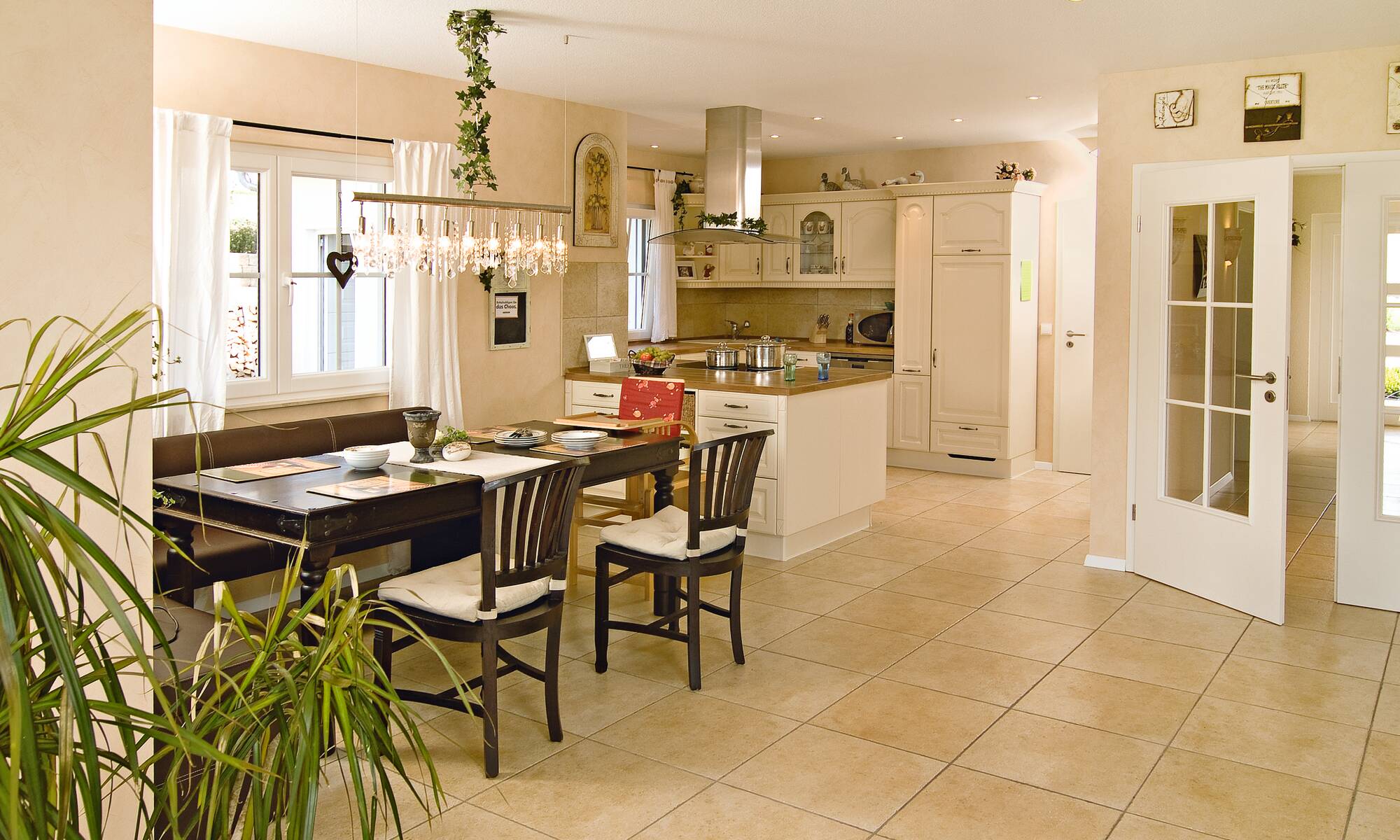 Die mediterrane Architektur stand bei diesem individuellen Entwurf Pate. Das Hauseingangsportal wirkt durch die Säulen und das ausladende Vordach besonders imposant. Das Obergeschoss ist ein kleines Stück nach innen versetzt, was dem Haus Leichtigkeit verleiht. Das Innere besticht durch eine offene Gestaltung. Die hochwertigen Materialien in erdigen Farbtönen machen die Wohnräume zu einer Quelle von Harmonie und Lebensfreude.
