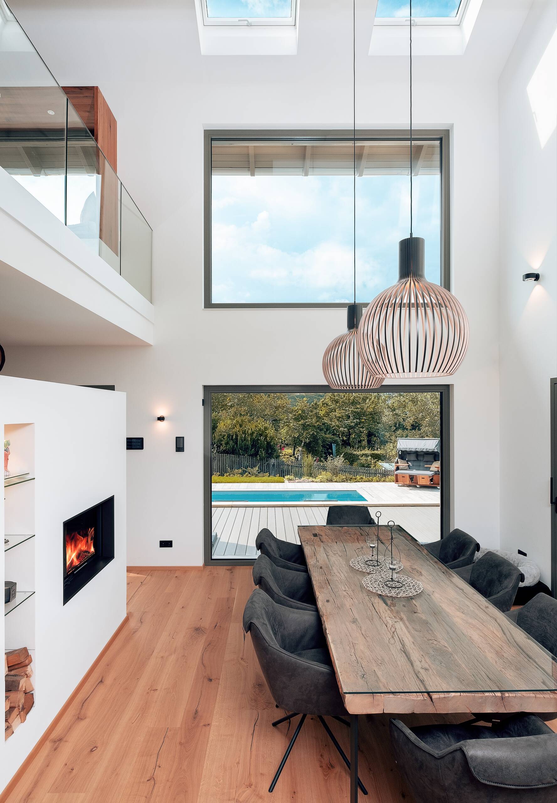 Bei diesem zweigeschossigem Satteldachhaus mit Querbau handelt es sich nicht um ein Wellnesshotel, auch wenn es auf den ersten Blick so scheinen mag. Den schicken Neubau mit Pool, regengeschützter Terrasse und Sauna teilen sich drei Generationen. Blickfang sind die zahlreichen Lichtöffnungen, die in den verschiedensten Formaten die schlichte Fassade und das Dach durchbrechen, sowie das auskragende Obergeschoss, das von zwei Säulen getragen wird. Auf dem Dach erstreckt sich eine Photovoltaikanlage, die den Bewohnern satte Energiegewinne beschert.