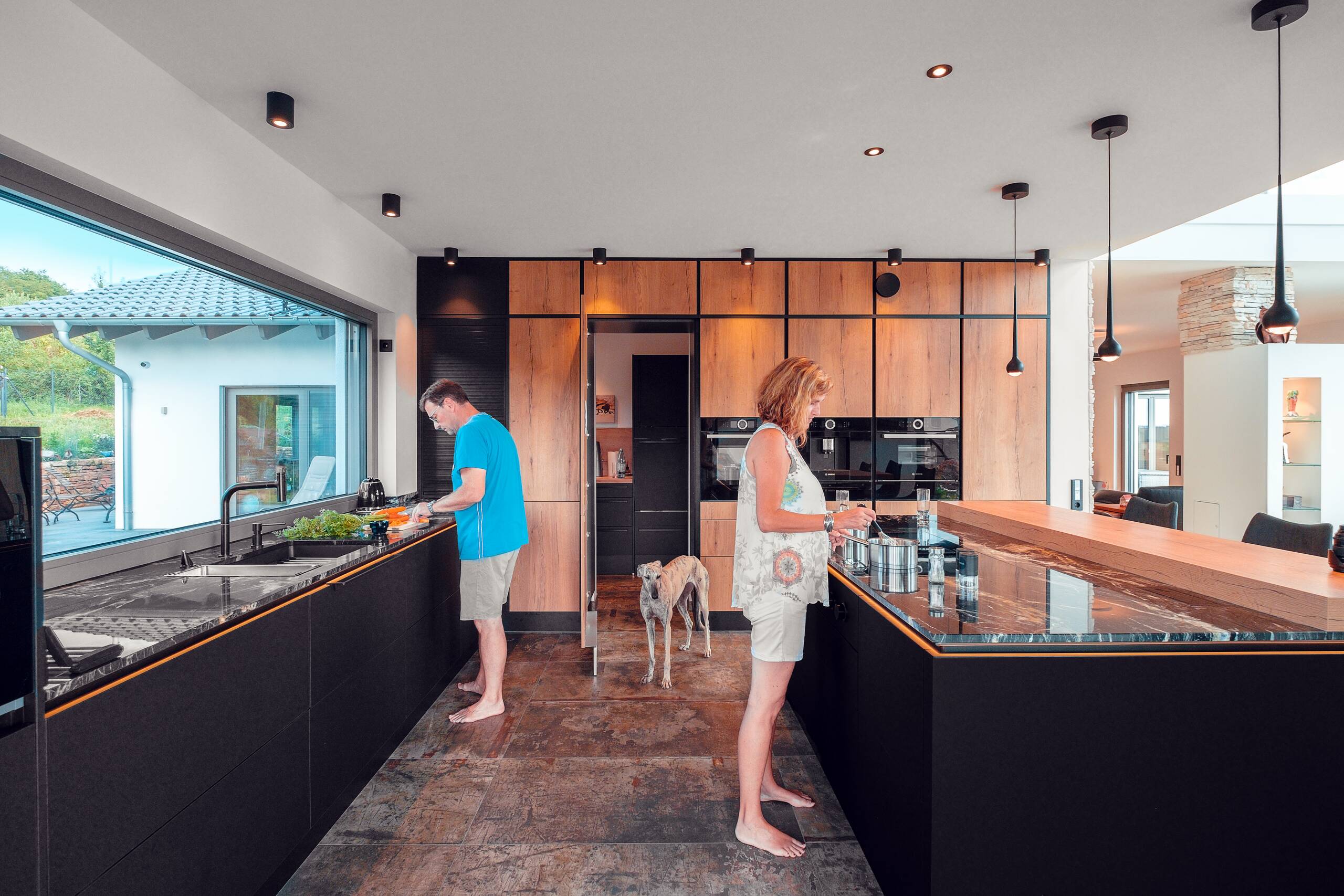 Das Haupthaus beherbergt den weitläufigen Wohn-, Ess- und Kochbereich, über den sich ein hoher Luftraum erstreckt. Weit reicht der Blick von hier nach oben, bis zur Galerie und zu den sichtbaren Dachbalken. Als schicker Raumteiler fungiert ein Kaminofen. Im eingeschossigen Anbau befindet sich eine rund 90 m² große, barrierearme Einliegerwohnung. Der Wellnessbereich mit Sauna ist von beiden Wohneinheiten aus zugänglich.