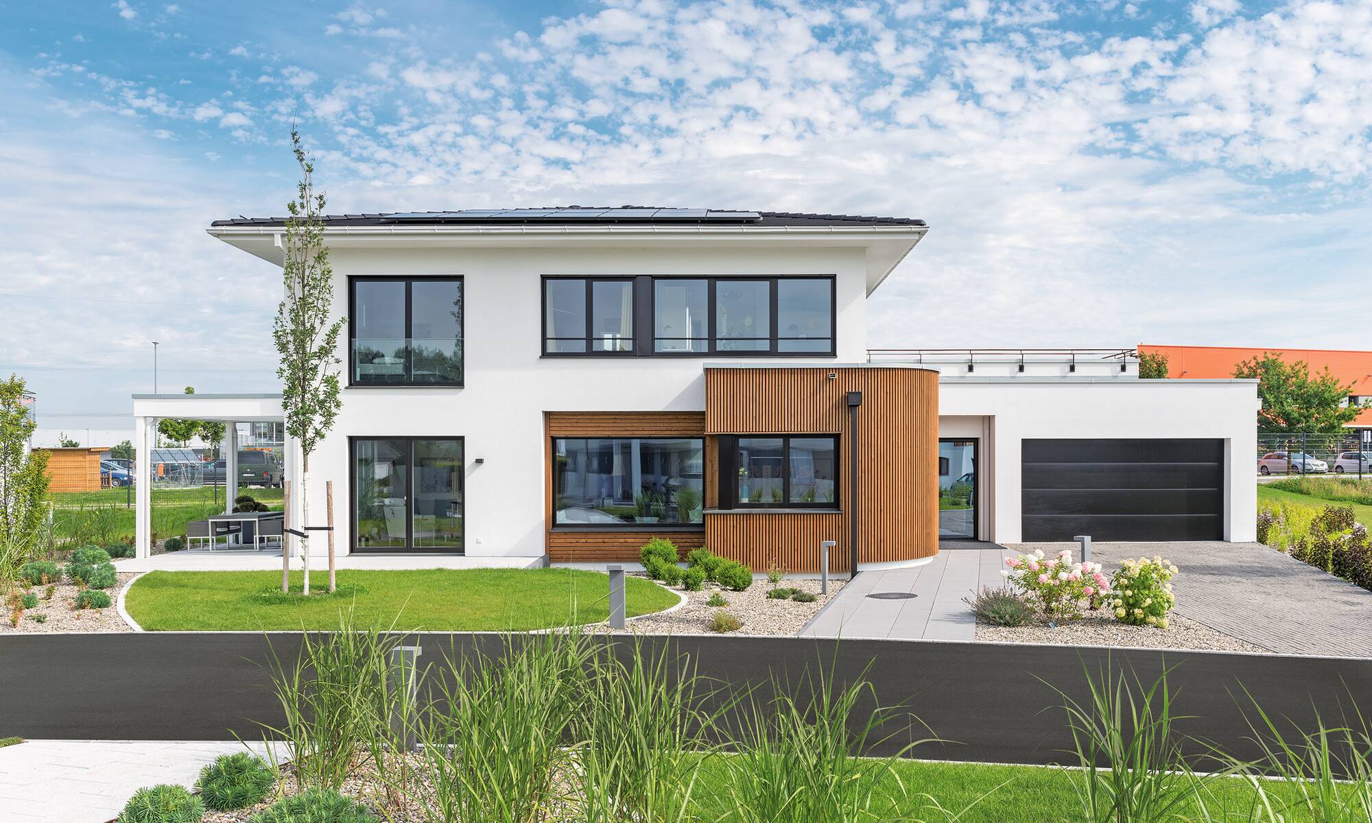 Urbaner Lifestyle für Stadt und Land auf zwei Vollgeschossen. Rund 165 Quadratmeter Wohnfläche gewähren viel Raum zur freien Entfaltung. Aufwändige Details wie der Runderker und das Panoramafenster mit integrierter Sitzbank setzen exklusive Akzente. Das Wellnessbad mit Sauna und großer Fliesendusche ist wie der Rest des Hauses barrierearm – für unbeschwerten Wohlfühlkomfort. Optisch besonders ansprechend: Die naturnahen Farbtöne der Fassade setzen sich im Innenbereich fort. Die Kombination aus ökologischen Materialien und innovativer Technik erfüllt alle Anforderungen eines KfW-Effizienzhaus 40 Plus. Das rechnet sich – für Mensch und Natur.