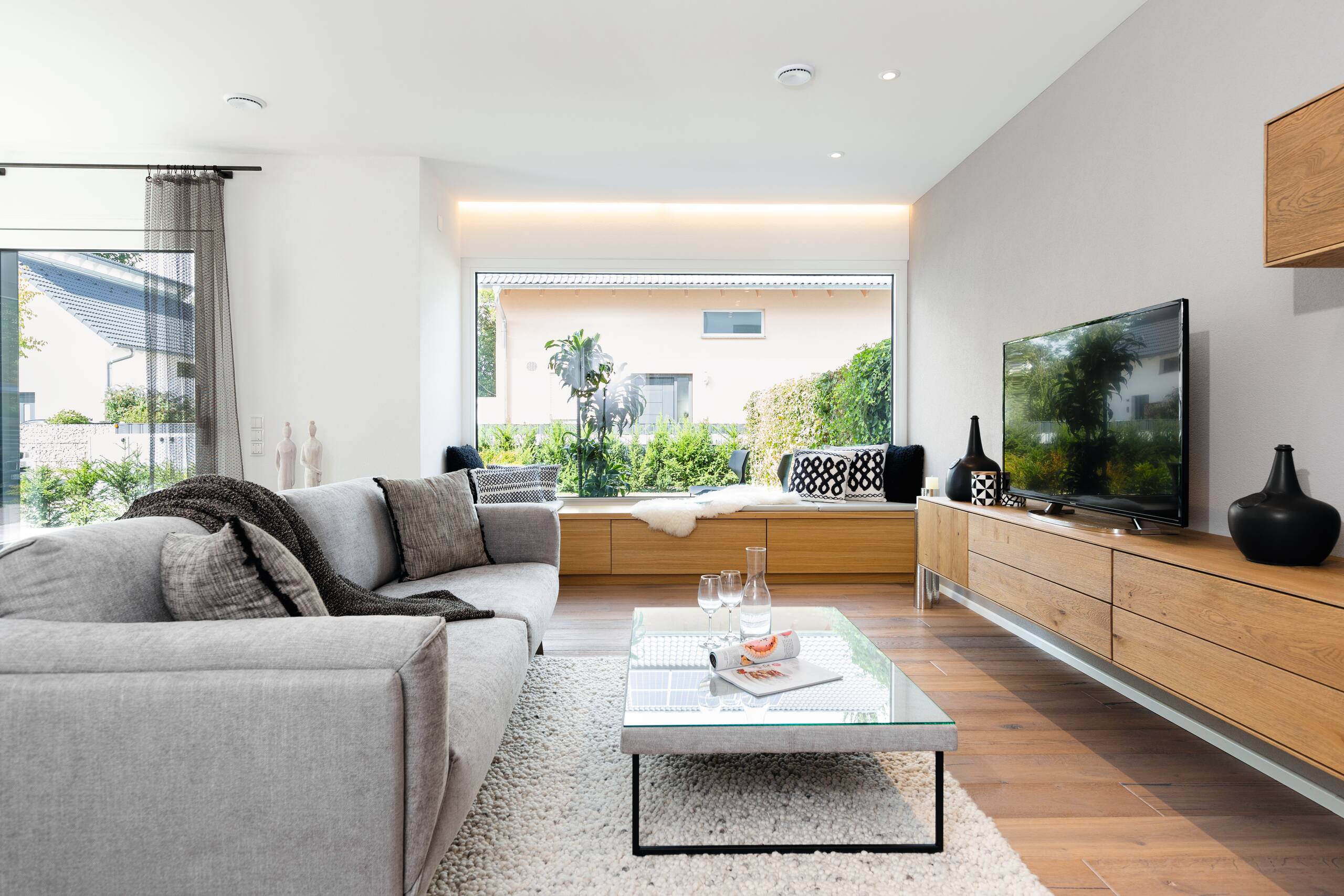 Modern, zeitlos und elegant präsentiert sich dieses Doppelhaus mit zwei Vollgeschossen. Das Satteldach verfügt über einen modernen Dachüberstand und bietet ausreichend Platz für eine Photovoltaik-Anlage. Die linke Doppelhaushälfte beherbergt Büroräume vom WeberHaus Bauforum in Schliengen und kann somit besichtigt werden. Die Haushälfte umfasst rund 150 Quadratmeter Wohnfläche. Der Erker links neben dem Hauseingang bietet in diesem Fall Platz für ein geräumiges Arbeitszimmer.