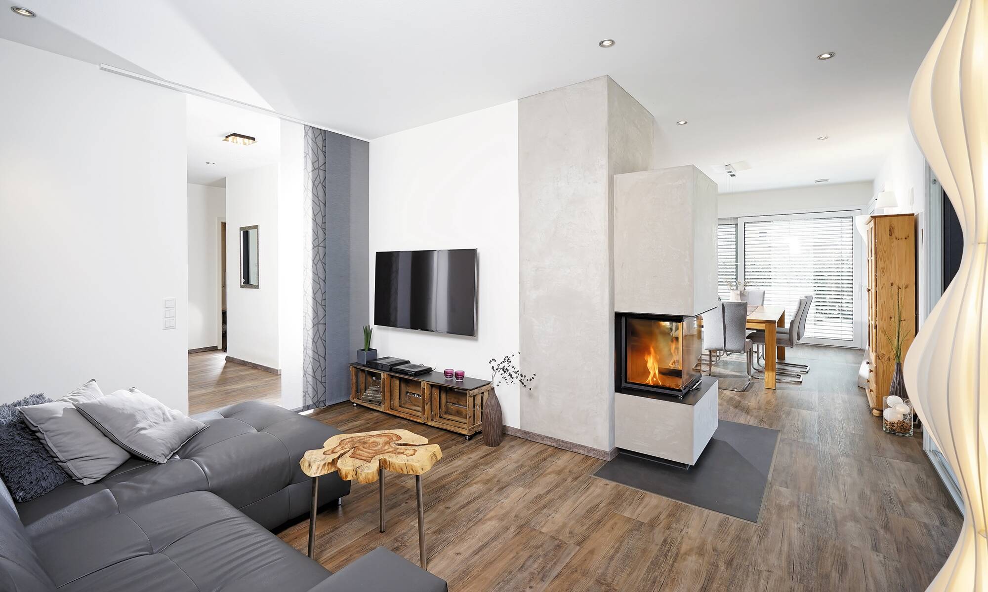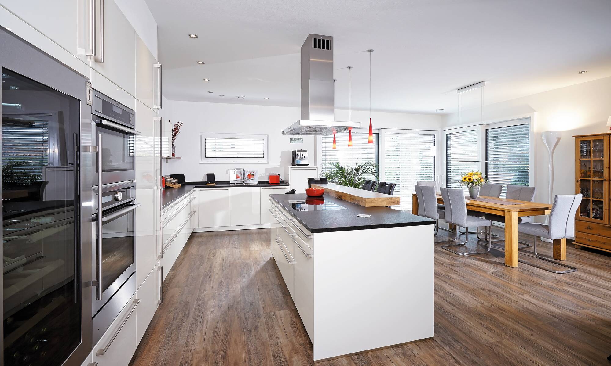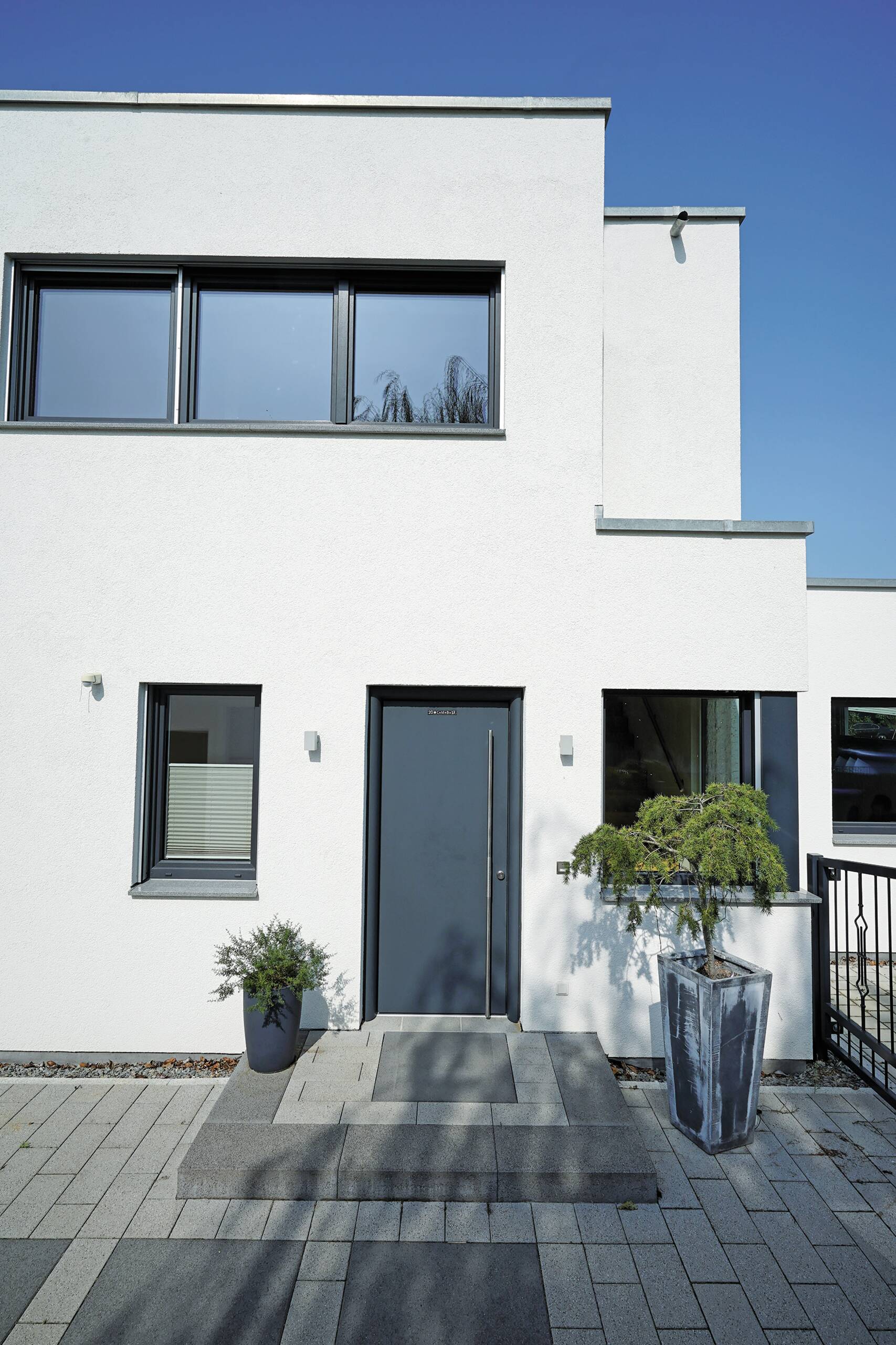 Klare Linien und Formen bestimmen dieses frei geplante Architektenhaus mit Flachdach. Abgesehen von den anthrazit gerahmten Fenstern überwiegt die Farbe Weiß. Während zur Straßenseite kleine Fenster eingefügt wurden, öffnet sich das Stadthaus zum Garten mit großen Fensterfronten. Die Wohnfläche von rund 230 Quadratmetern verteilt sich auf zwei Vollgeschosse.