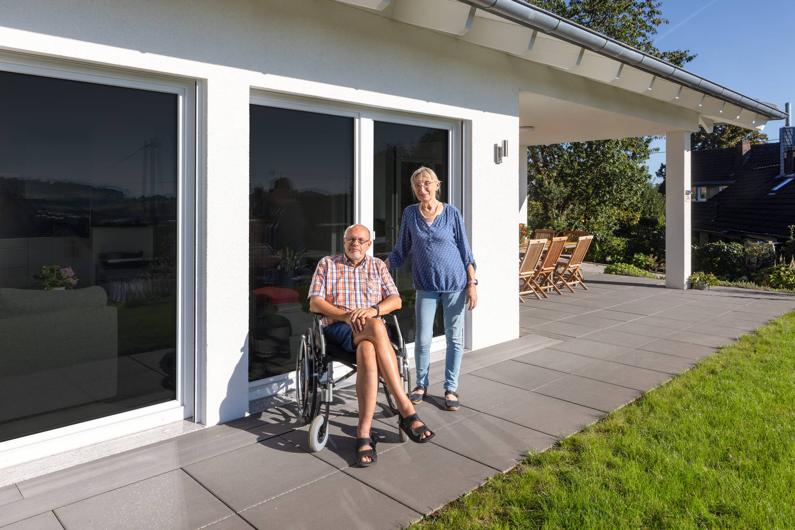 Möglichst lange selbstbestimmt in den eigenen vier Wänden leben – dieser barrierearmer Bungalow lässt den Wunschtraum zur Realität werden. Von außen zeigt sich der Neubau schlicht, aber dennoch sehr elegant. Mit seiner weiß verputzen Fassade und dem dunkel eingedeckten Walmdach fügt er sich harmonisch in die Bebauungssituation ein. Blickfang ist nicht nur die breite Fensterfront auf der Gartenseite, sondern vor allem der Rücksprung, der Raum für eine überdachte Terrasse schafft.