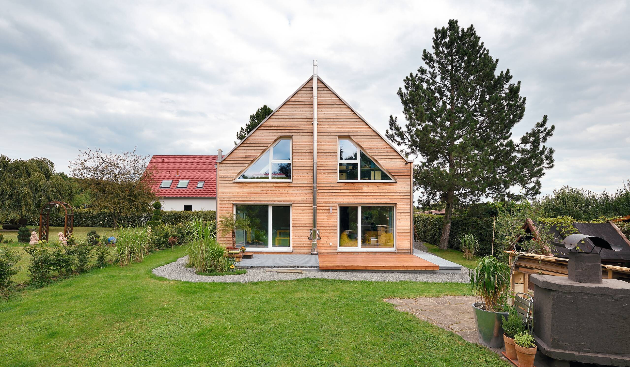 Das Ergebnis ist ein rechteckig geschnittenes Haus mit Satteldach, das mit seiner waagerechten Holzverschalung in jedem Wohngebiet zu einem echten Hingucker wird. Auch im Innenbereich ist Holz das dominierende Gestaltungselement und verleiht dem zweigeschossigen Haus sowohl einen gemütlichen als auch modernen Charakter. Einen separaten Zugang ins Dachgeschoss bietet eine Außentreppe.