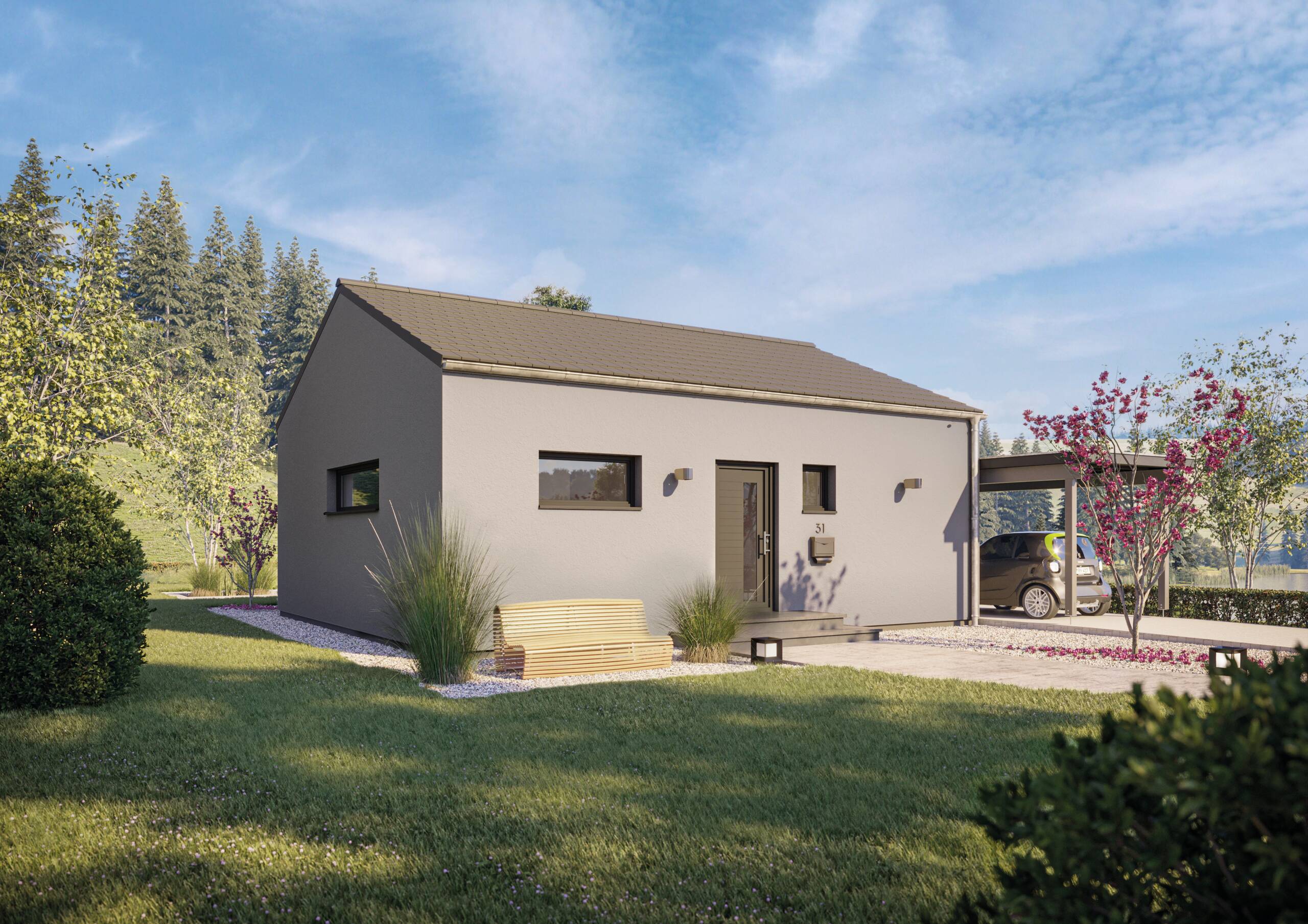 Das ebenerdige newLife erfüllt den Traum eines kompakten Eigenheims für ein bis zwei Personen auf etwa 65 Quadratmetern. Es eignet sich ideal für Singles, die ein eigenes Heim im elterlichen Garten errichten möchten, für den Bau eines Gästehauses neben einem bestehenden Haus oder als komfortable Wohnoption im Alter. Das Haus basiert auf hochwertiger und umweltfreundlicher Holzfertigbauweise, vereint dabei das Wesentliche und bietet gleichzeitig hohen Komfort. Die schlichte Eleganz des Hauses wird durch großflächige Glasfenster zur Terrassenseite betont und unterstreicht das Konzept von WeberHaus newLife: Weniger ist mehr!
