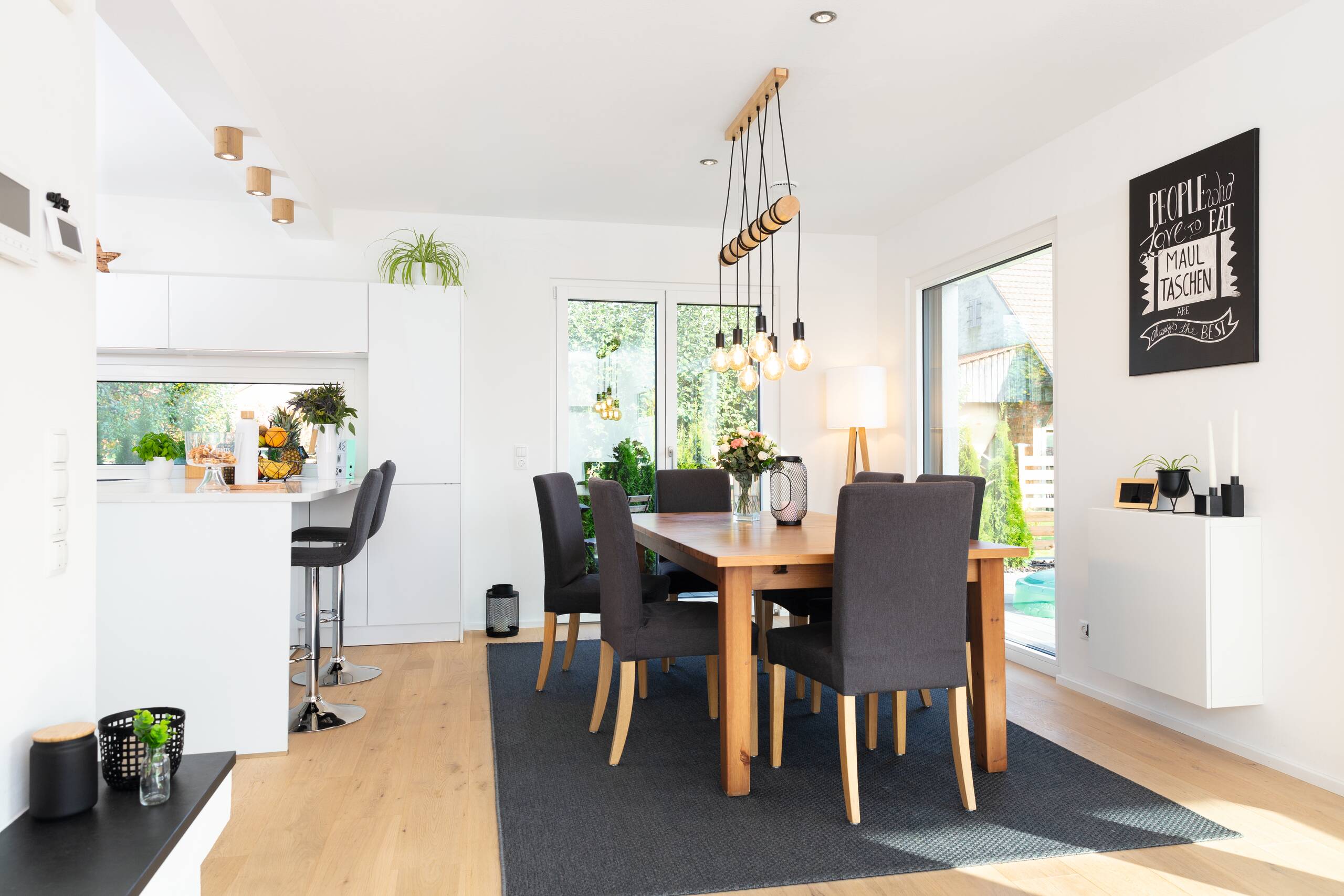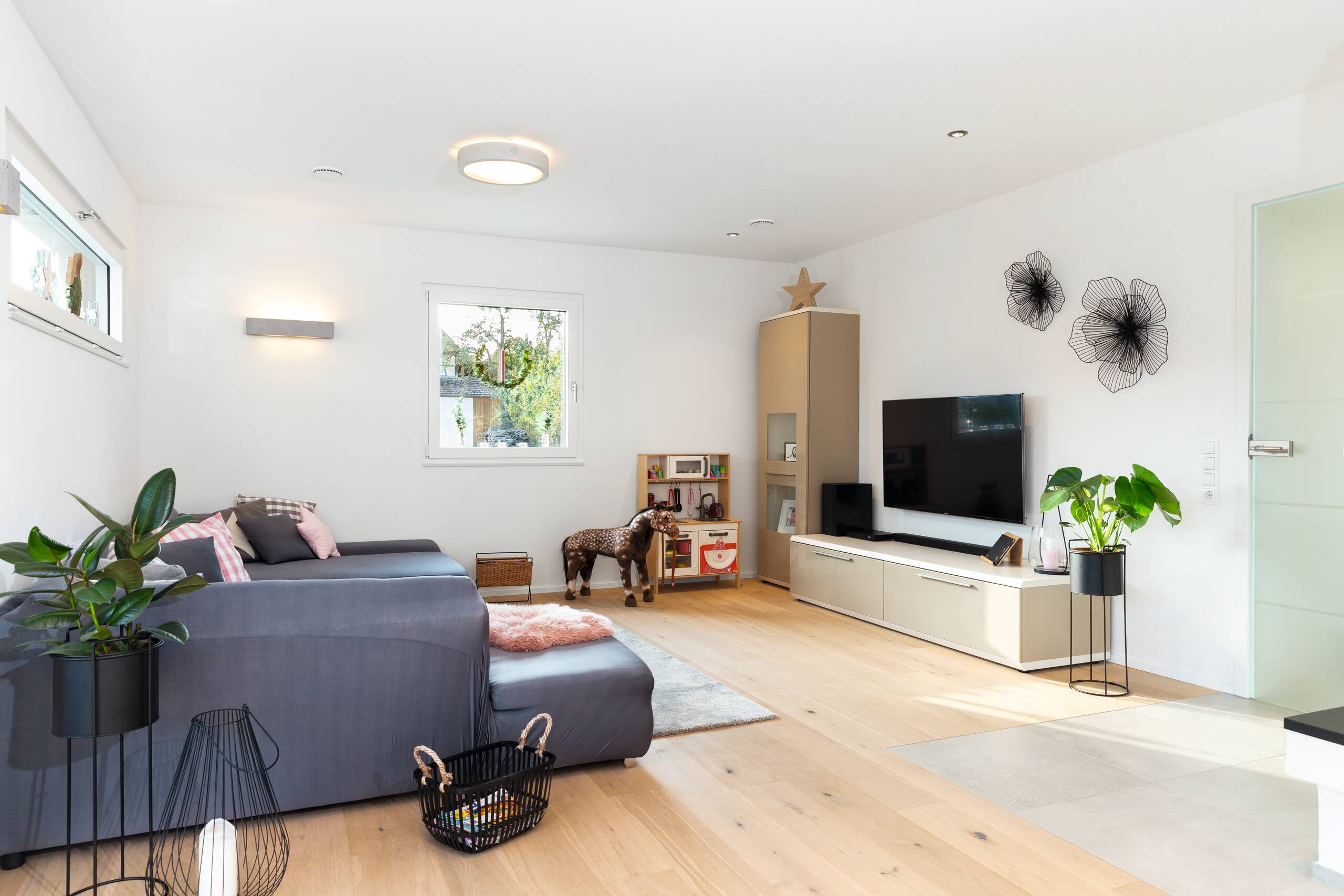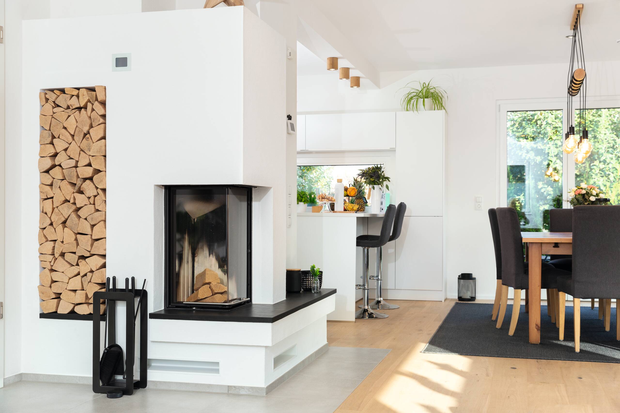 Die Besitzer von diesem WeberHaus haben schon immer von einer Stadtvilla geträumt. Am liebsten mit zwei Etagen und einem Grundriss, der eine freie Raumaufteilung möglich macht. Das beinahe quadratische Einfamilienhaus mit rund 170 Quadratmetern wird von einem Satteldach gekrönt. Holz-Applikationen an der Fassade und dem Garagentor lockern das ansonsten weiß verputze Eigenheim auf und verbinden die beiden Gebäude optisch miteinander. Ausgestattet mit der Frischluft-Wärmetechnik, einer Photovoltaik-Anlage und einem Batteriespeicher erfüllt das Einfamilienhaus die hohen Voraussetzungen für ein KfW-Effizienzhaus 40 Plus.