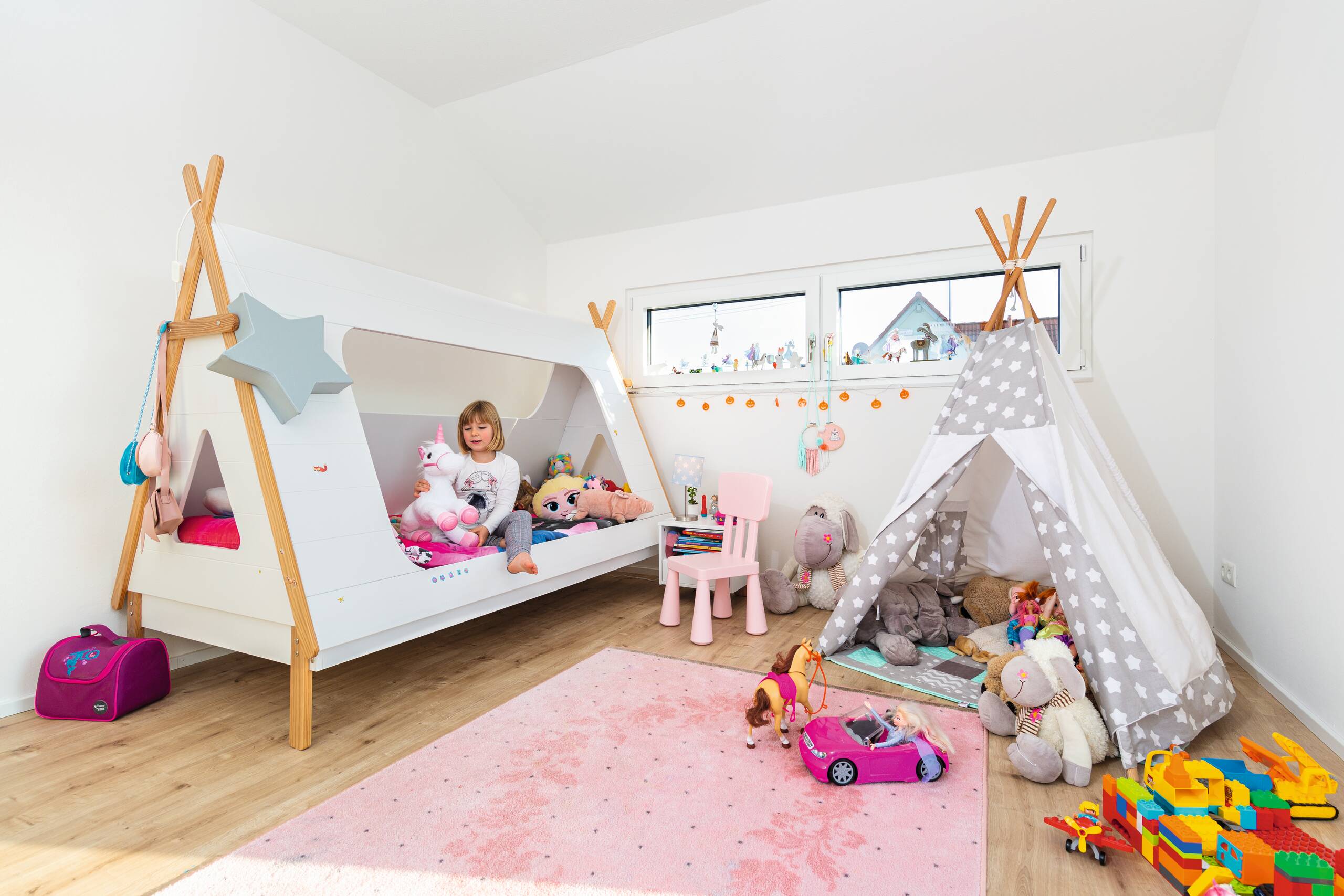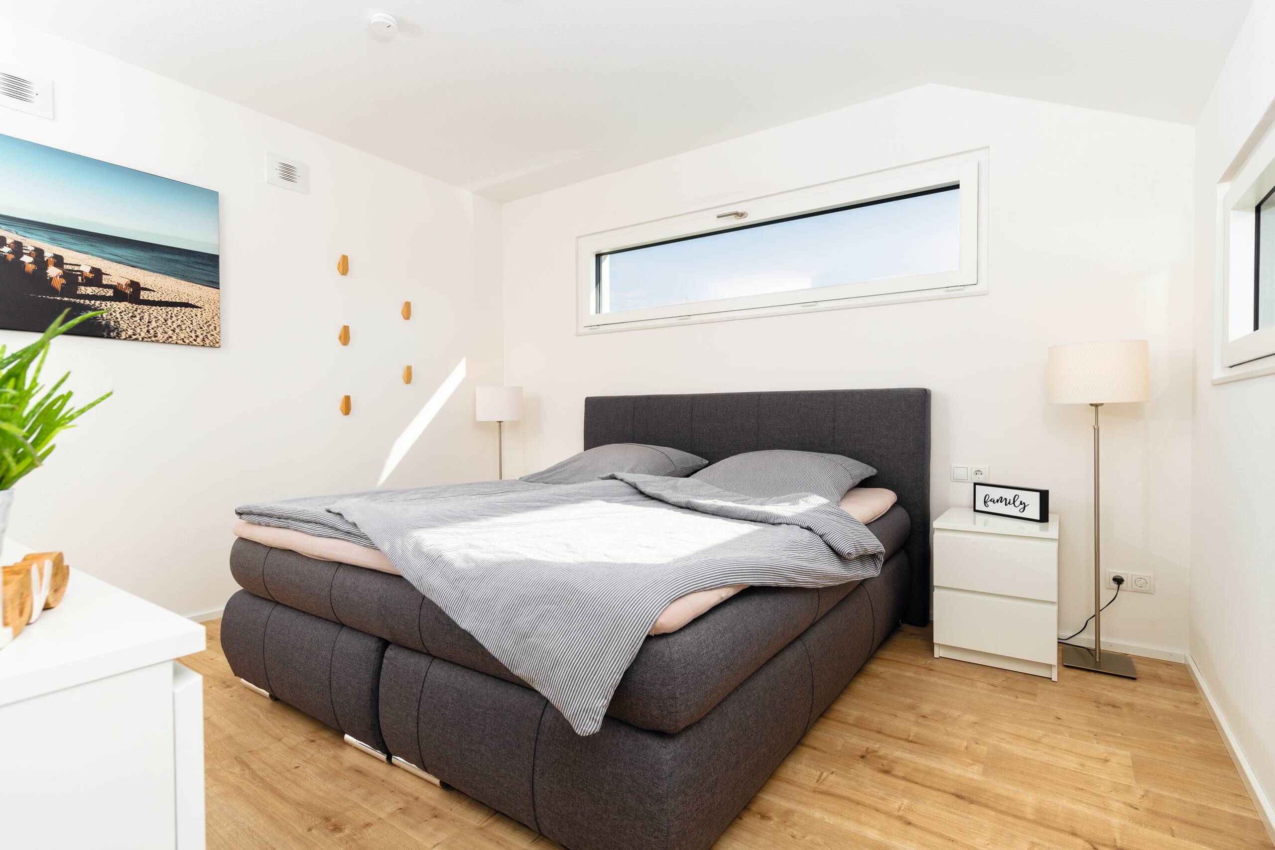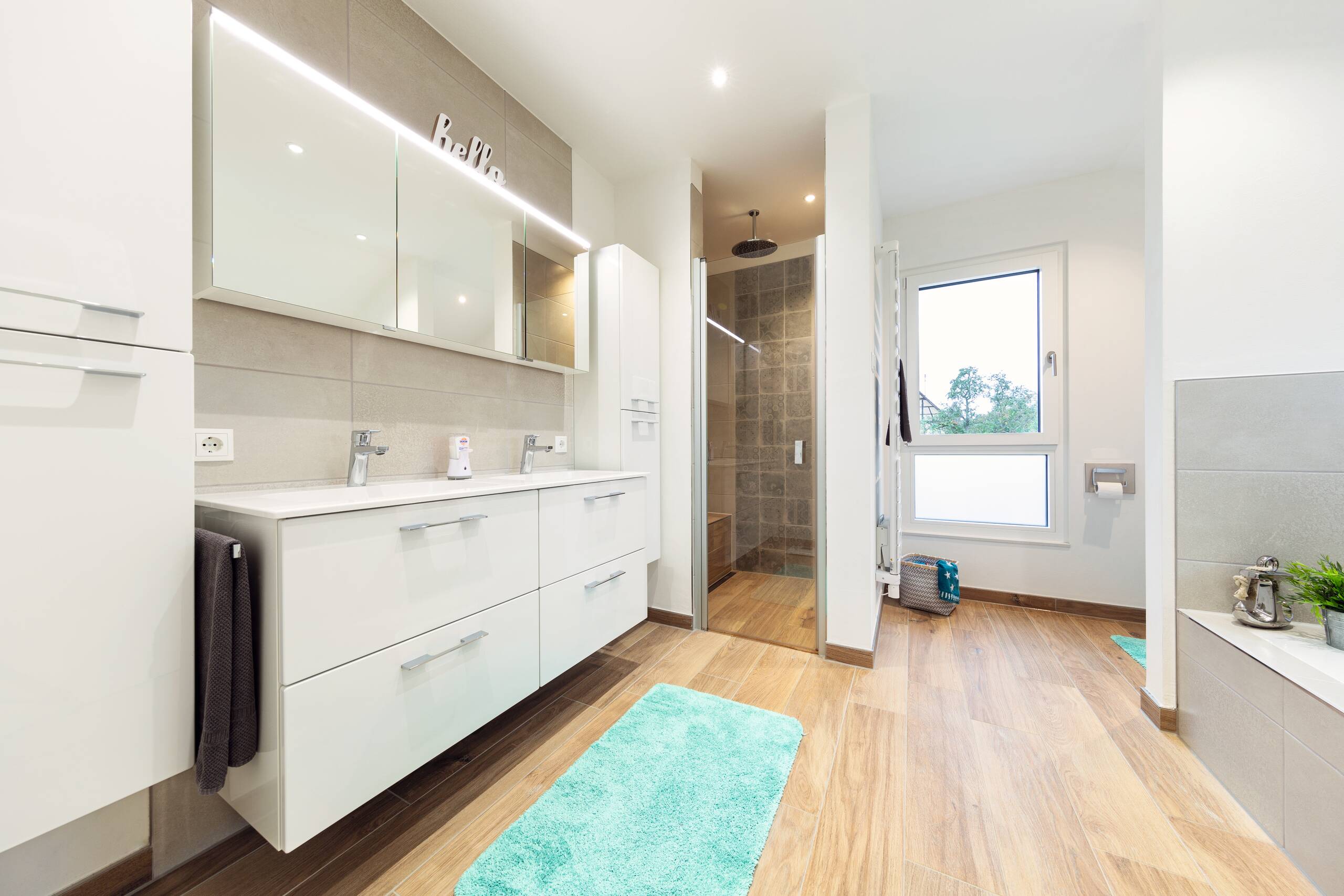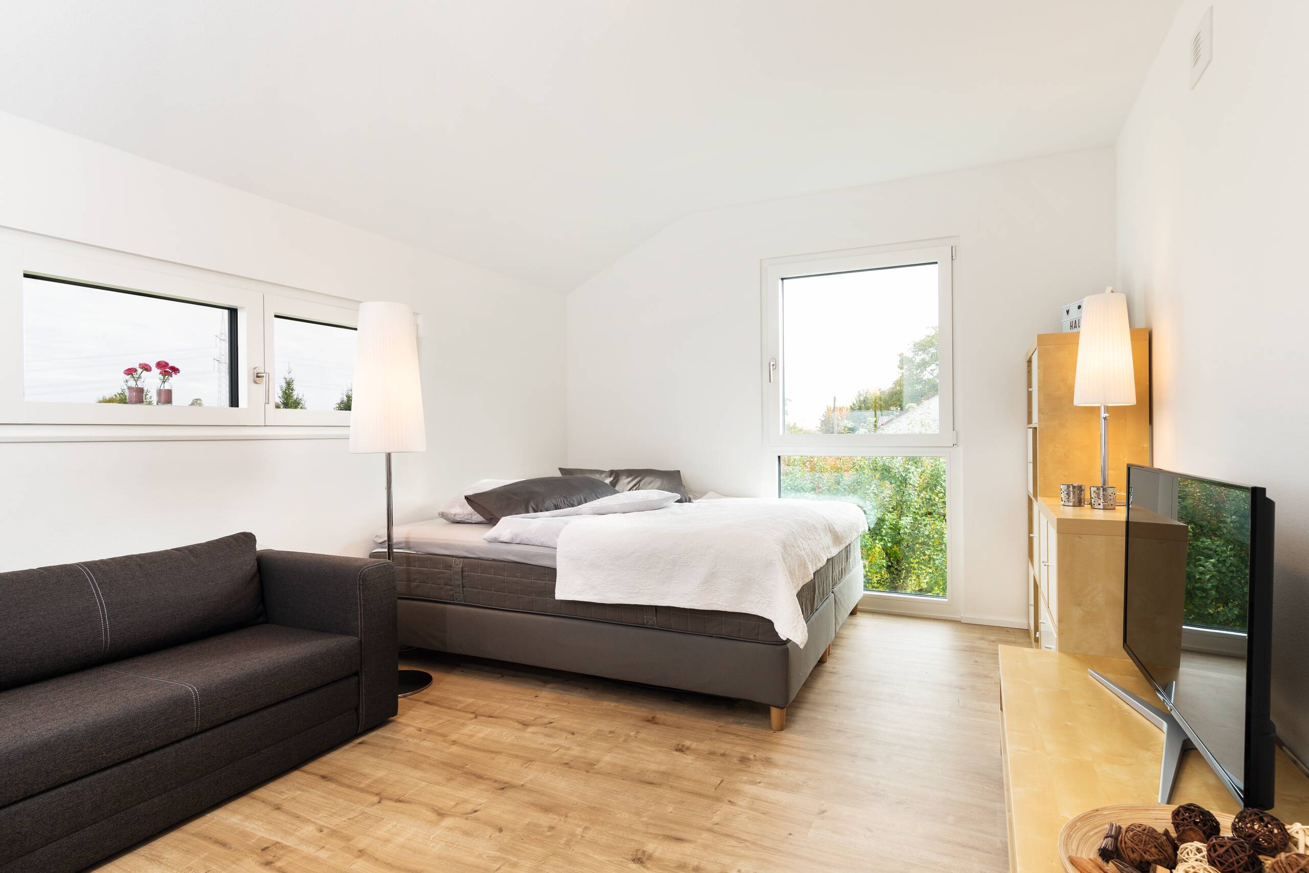Die Besitzer von diesem WeberHaus haben schon immer von einer Stadtvilla geträumt. Am liebsten mit zwei Etagen und einem Grundriss, der eine freie Raumaufteilung möglich macht. Das beinahe quadratische Einfamilienhaus mit rund 170 Quadratmetern wird von einem Satteldach gekrönt. Holz-Applikationen an der Fassade und dem Garagentor lockern das ansonsten weiß verputze Eigenheim auf und verbinden die beiden Gebäude optisch miteinander. Ausgestattet mit der Frischluft-Wärmetechnik, einer Photovoltaik-Anlage und einem Batteriespeicher erfüllt das Einfamilienhaus die hohen Voraussetzungen für ein KfW-Effizienzhaus 40 Plus.