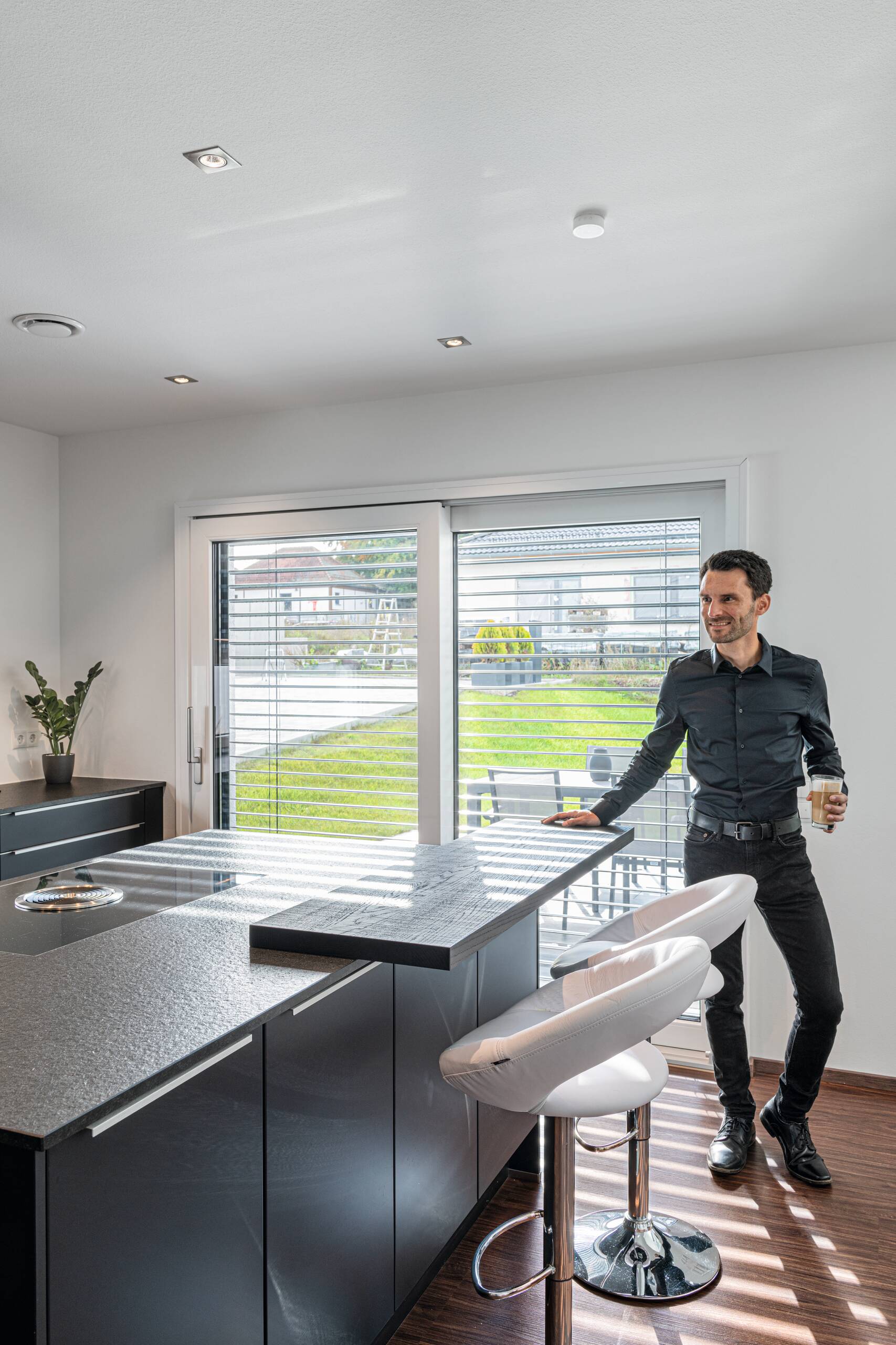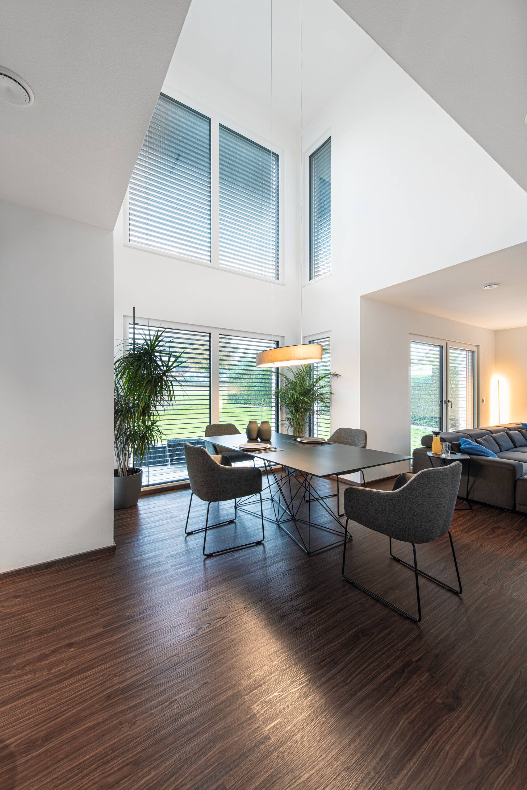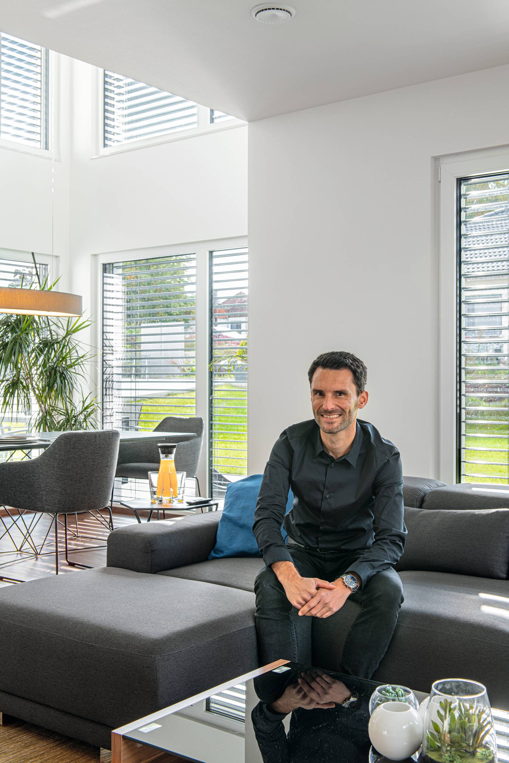 Bei dieser Stadtvilla handelt es sich um ein frei geplantes Architektenhaus mit Walmdach. Das elegante Einfamilienhaus strahlt eine gewisse Symmetrie und Geradlinigkeit aus. Durch die gleich großen Fenster wirkt das Haus einheitlich, wie aus einem Guss. Die Farbgestaltung wird bestimmt von einem schicken Hell-Dunkel-Kontrast. Stilvoll setzen sich die anthrazitfarbenen Fensterrahmen von der strahlend weißen Putzfassade ab. Der dritte Giebel mit Satteldach erweitert die Wohnfläche und ermöglicht eine Empore.