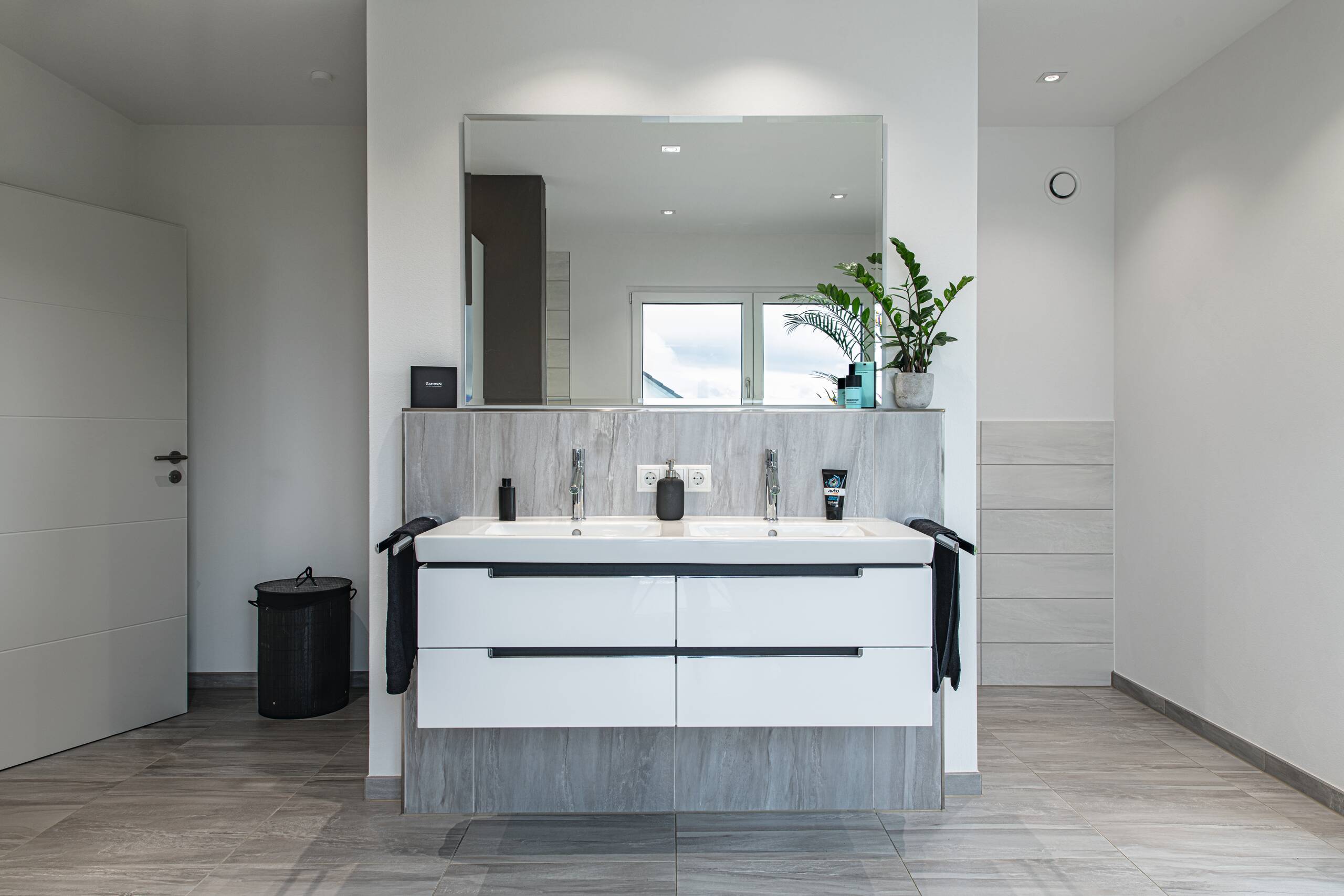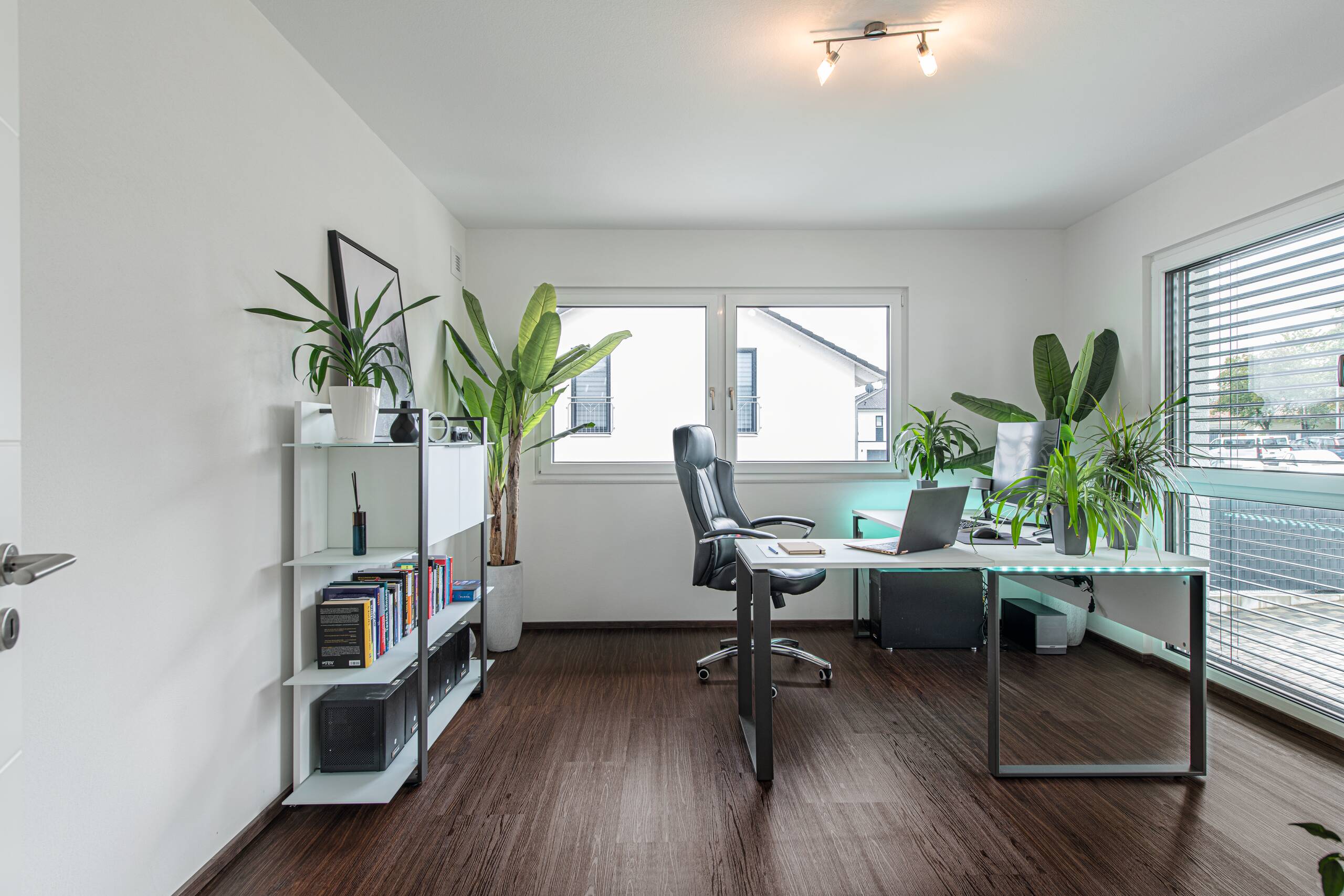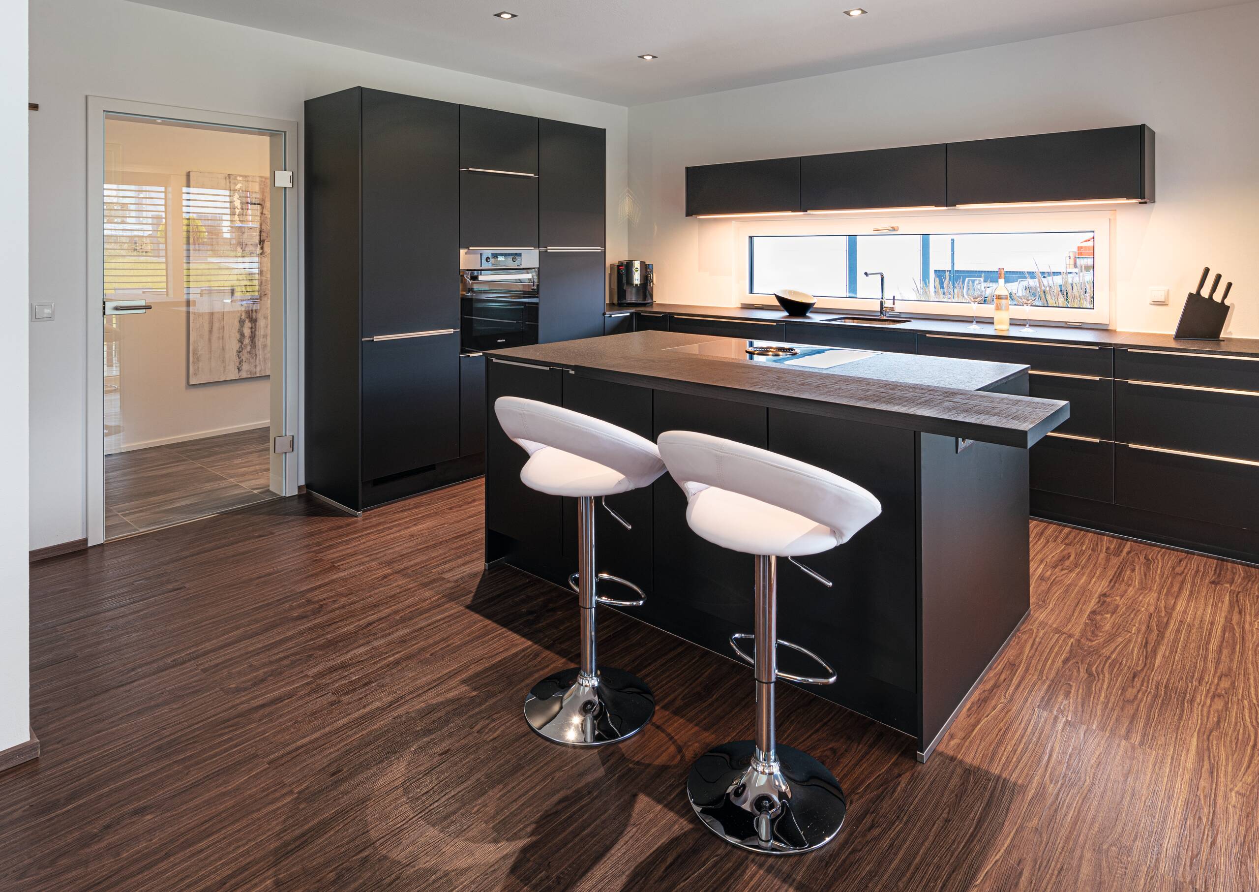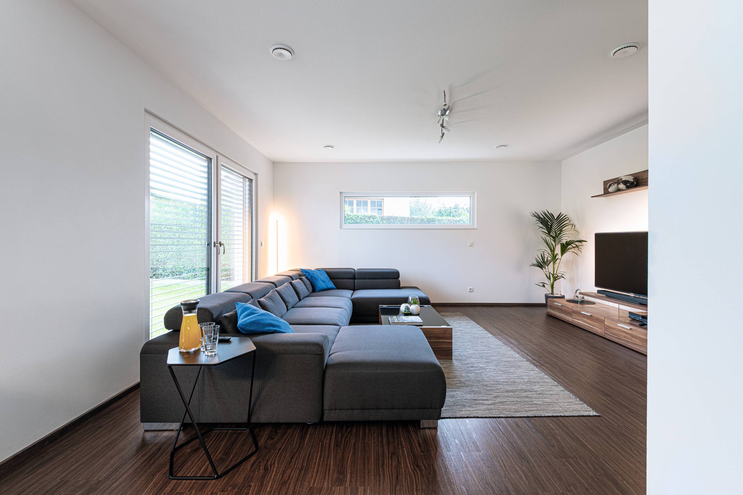 Bei dieser Stadtvilla handelt es sich um ein frei geplantes Architektenhaus mit Walmdach. Das elegante Einfamilienhaus strahlt eine gewisse Symmetrie und Geradlinigkeit aus. Durch die gleich großen Fenster wirkt das Haus einheitlich, wie aus einem Guss. Die Farbgestaltung wird bestimmt von einem schicken Hell-Dunkel-Kontrast. Stilvoll setzen sich die anthrazitfarbenen Fensterrahmen von der strahlend weißen Putzfassade ab. Der dritte Giebel mit Satteldach erweitert die Wohnfläche und ermöglicht eine Empore.