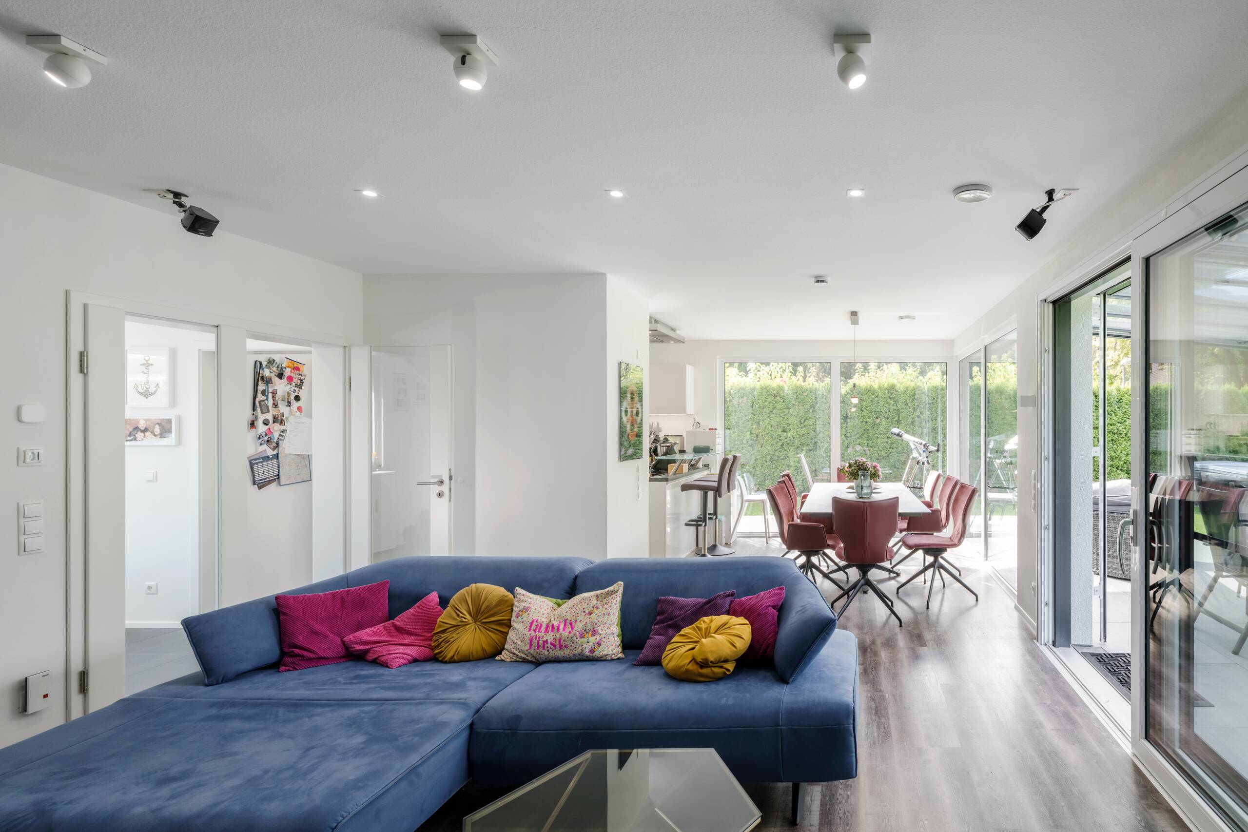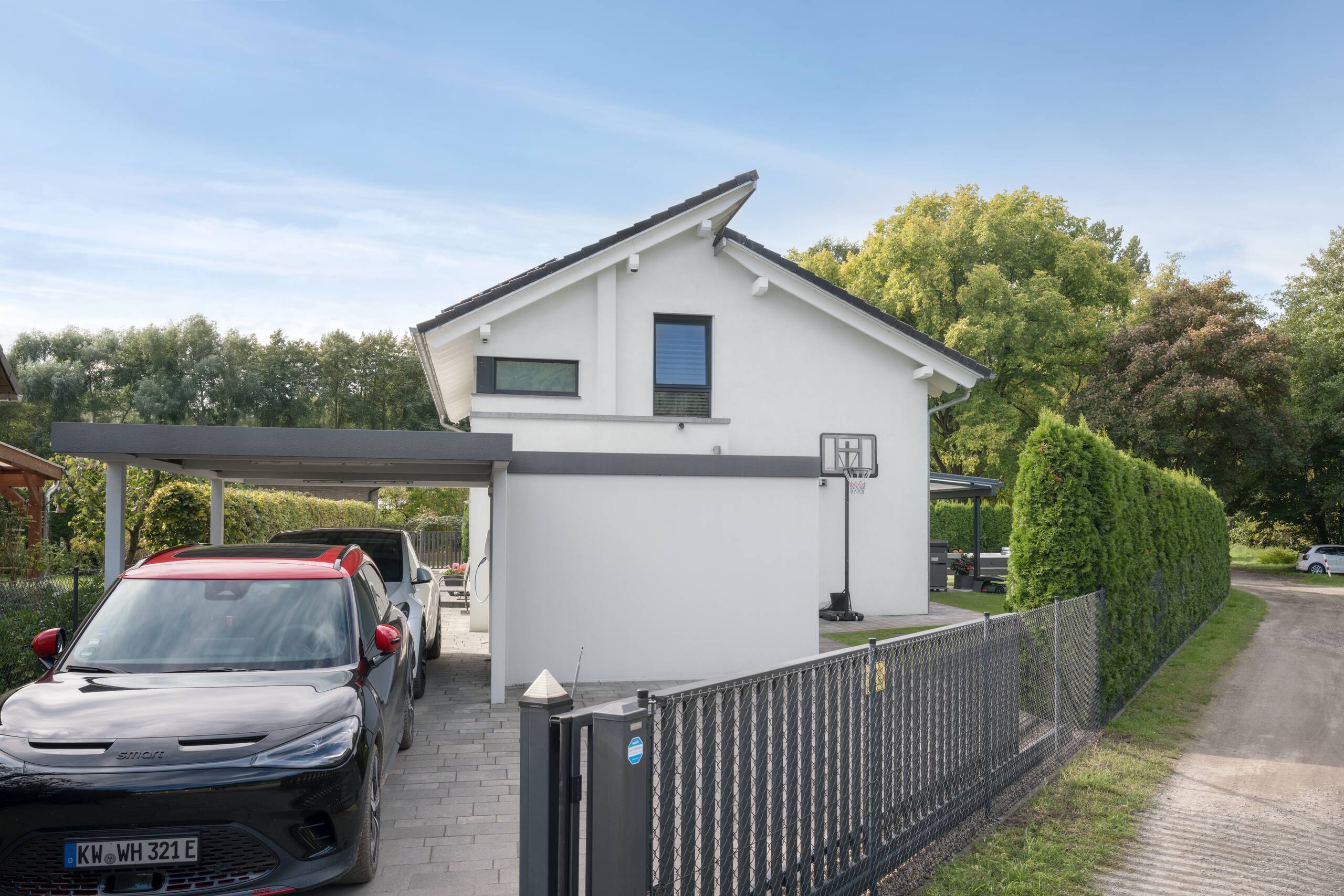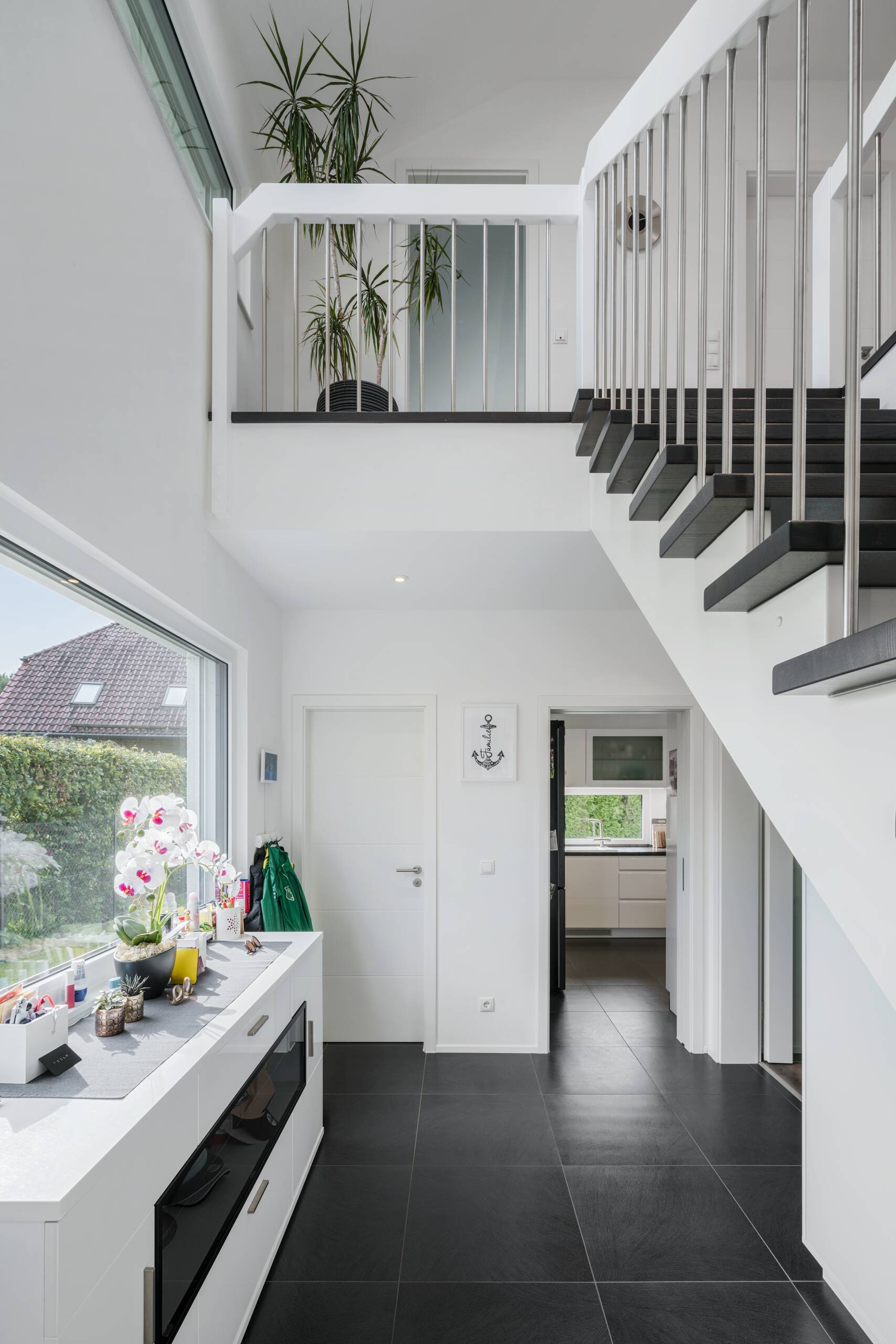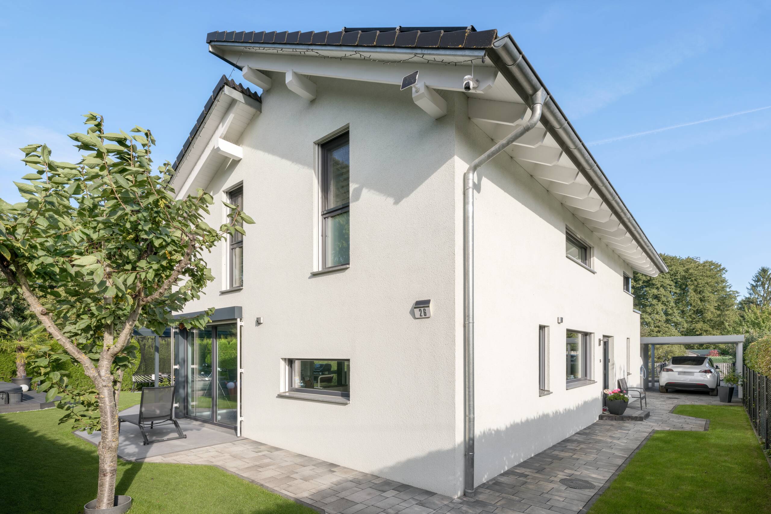 Dieses moderne Familienhaus zieht mit seiner ungewöhnlichen Dachform alle Blicke auf sich. Das versetzte Pultdach verleiht dem Gebäude nicht nur eine dynamische Silhouette, sondern bietet auch optimale Voraussetzungen für die Installation einer leistungsstarken Photovoltaikanlage. Der schlichte, weiß verputzte Baukörper wird erweitert von einer eingeschossigen Auslucht, die Platzgewinne im Innern schafft. Trotz seiner großzügigen Abmessungen von 13,66 x 8,10 m wirkt er leicht und offen. Das ist vor allem den Fenstern und Verglasungen in unterschiedlichsten Formaten zu verdanken.