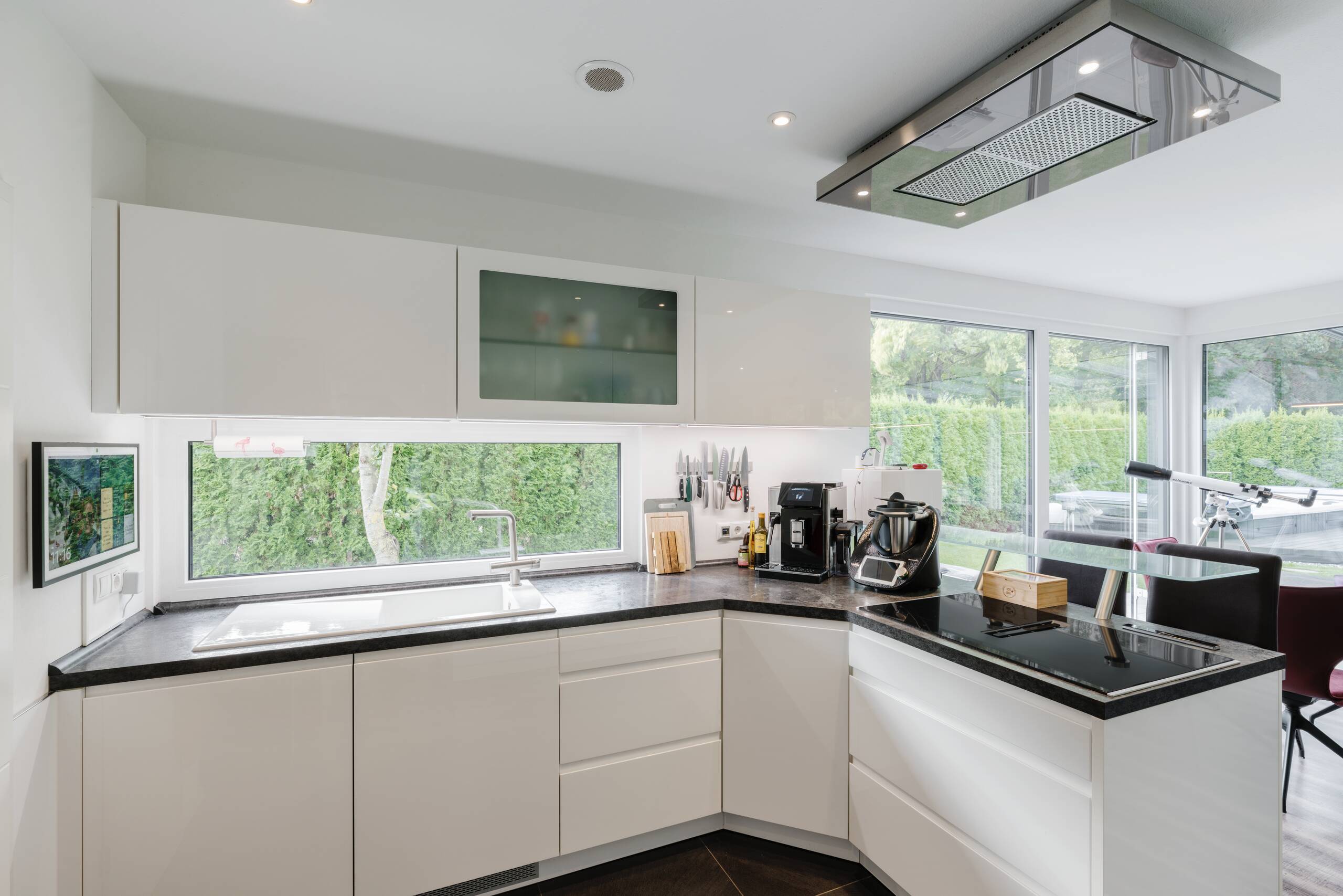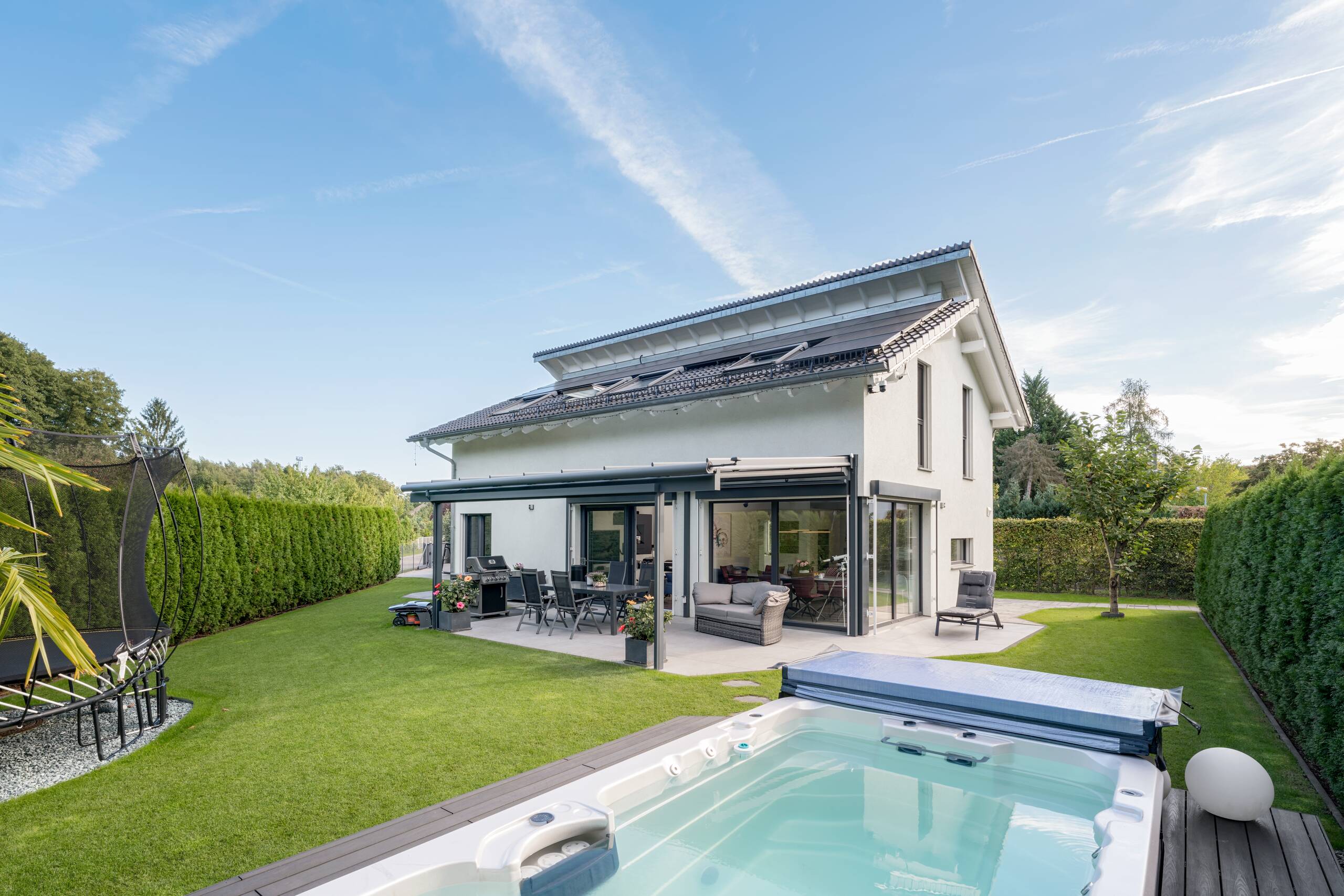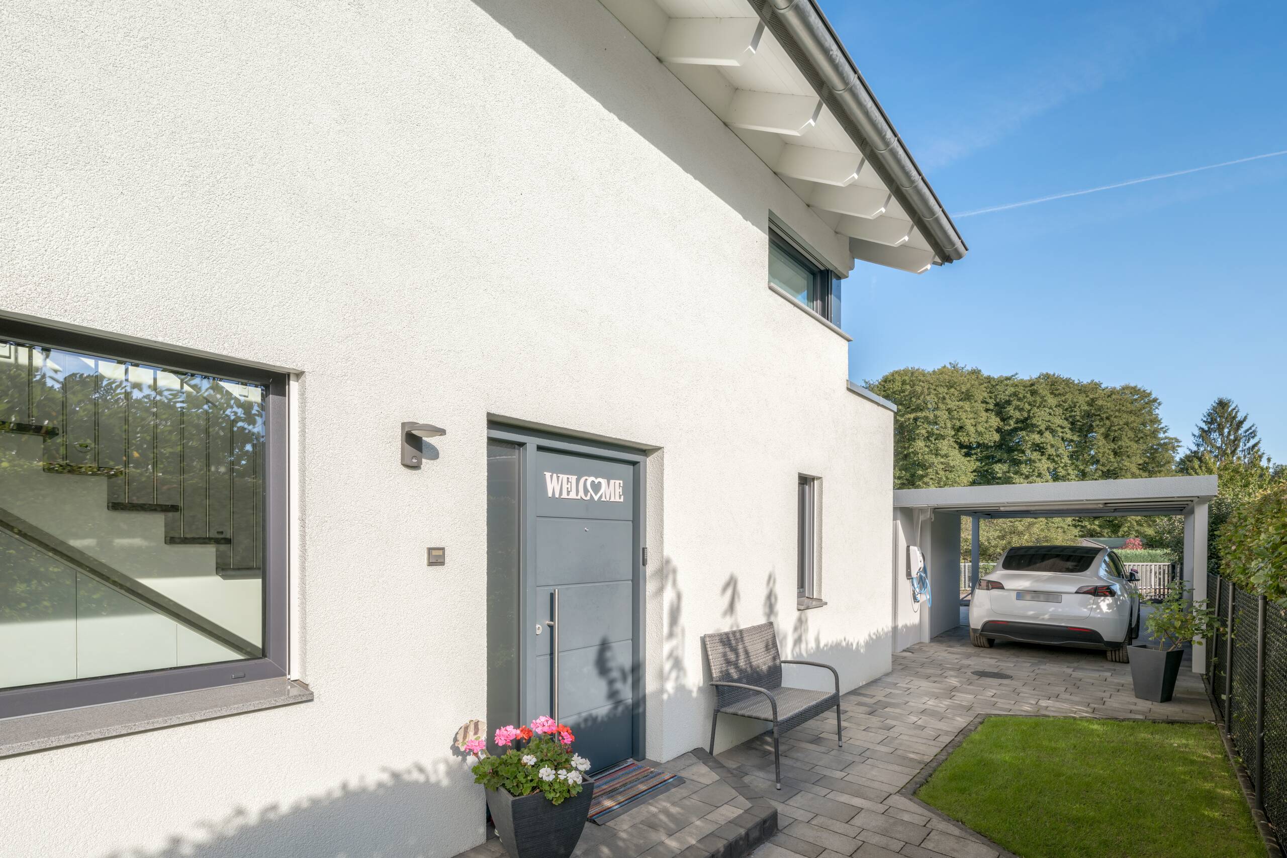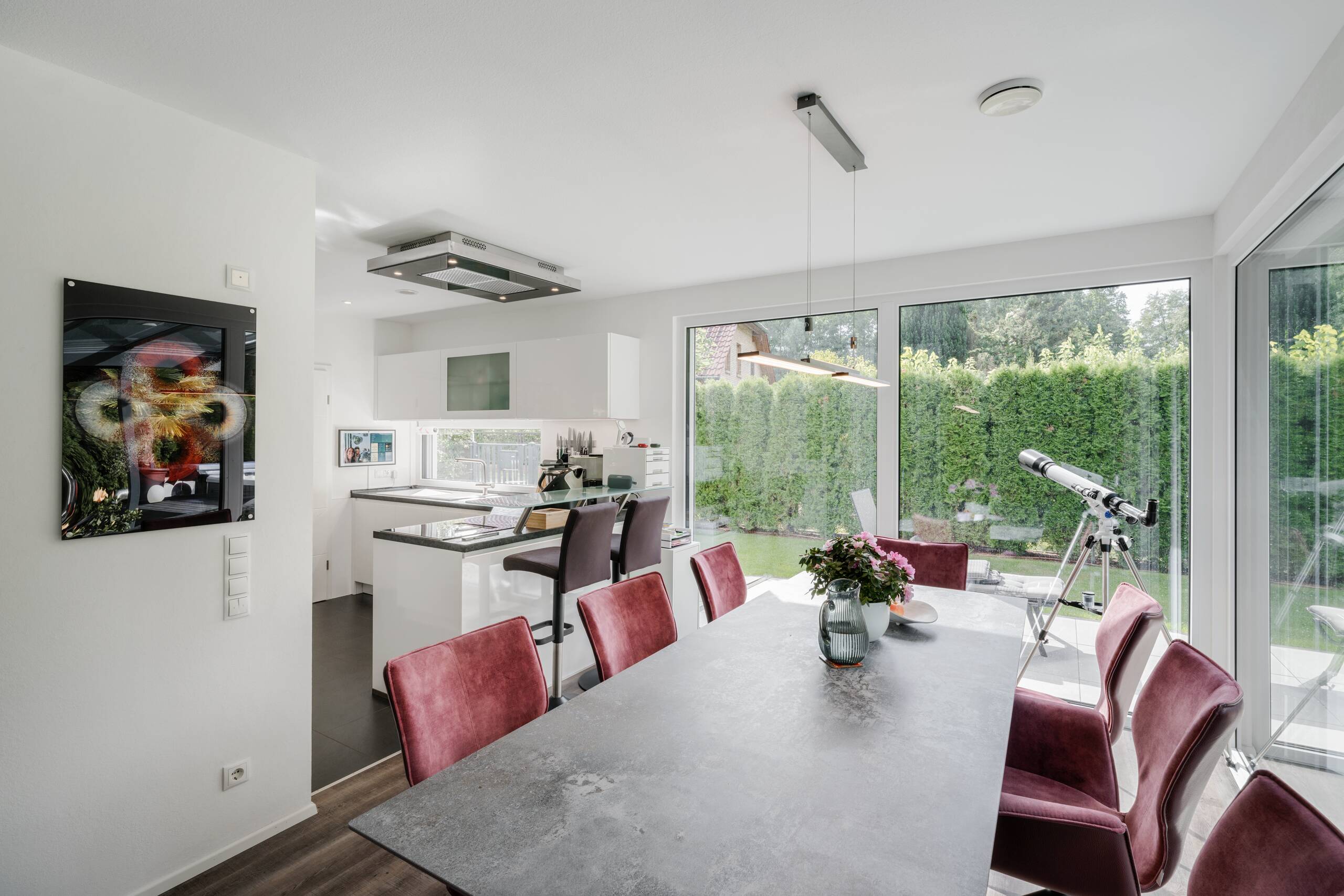 Dieses moderne Familienhaus zieht mit seiner ungewöhnlichen Dachform alle Blicke auf sich. Das versetzte Pultdach verleiht dem Gebäude nicht nur eine dynamische Silhouette, sondern bietet auch optimale Voraussetzungen für die Installation einer leistungsstarken Photovoltaikanlage. Der schlichte, weiß verputzte Baukörper wird erweitert von einer eingeschossigen Auslucht, die Platzgewinne im Innern schafft. Trotz seiner großzügigen Abmessungen von 13,66 x 8,10 m wirkt er leicht und offen. Das ist vor allem den Fenstern und Verglasungen in unterschiedlichsten Formaten zu verdanken.
