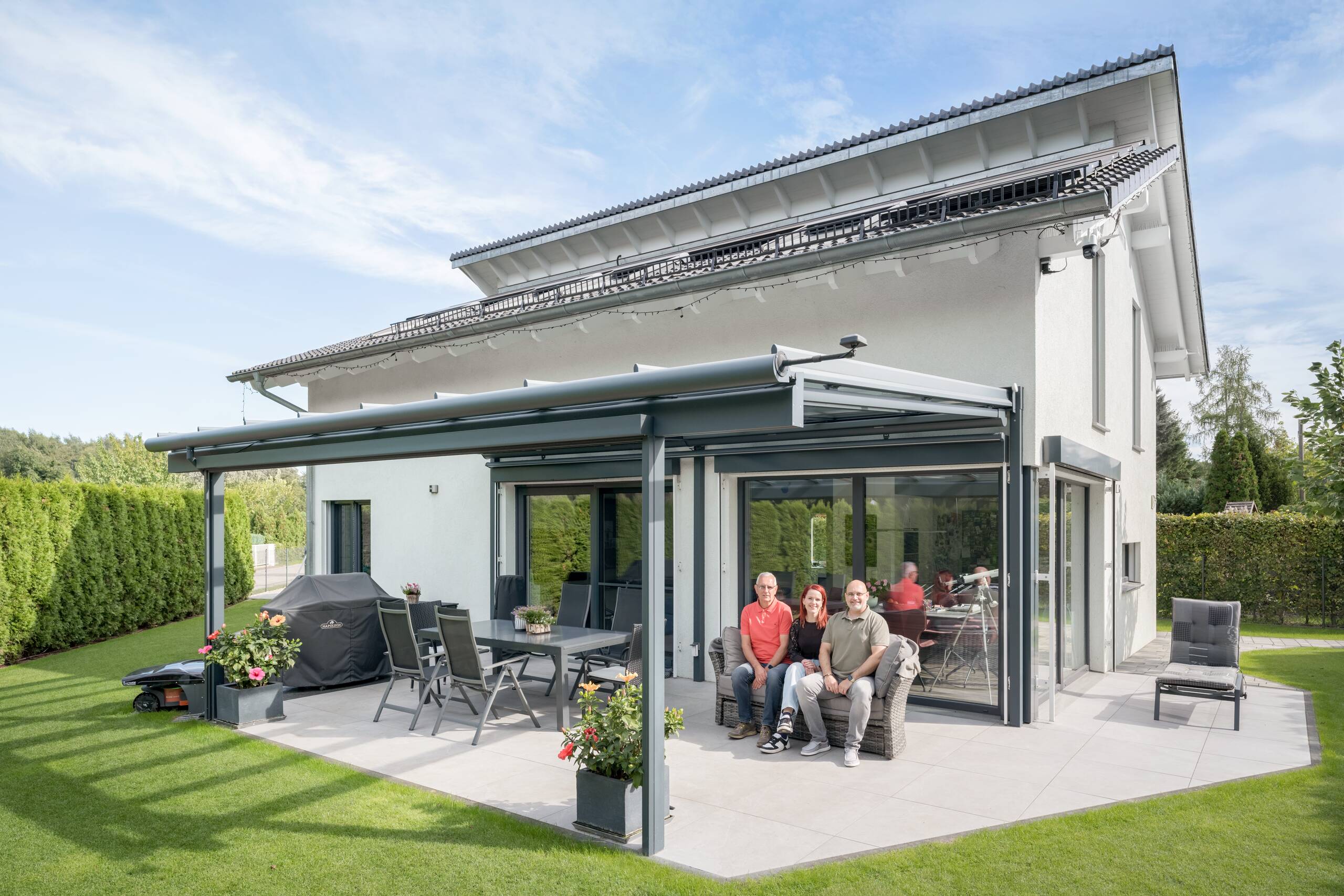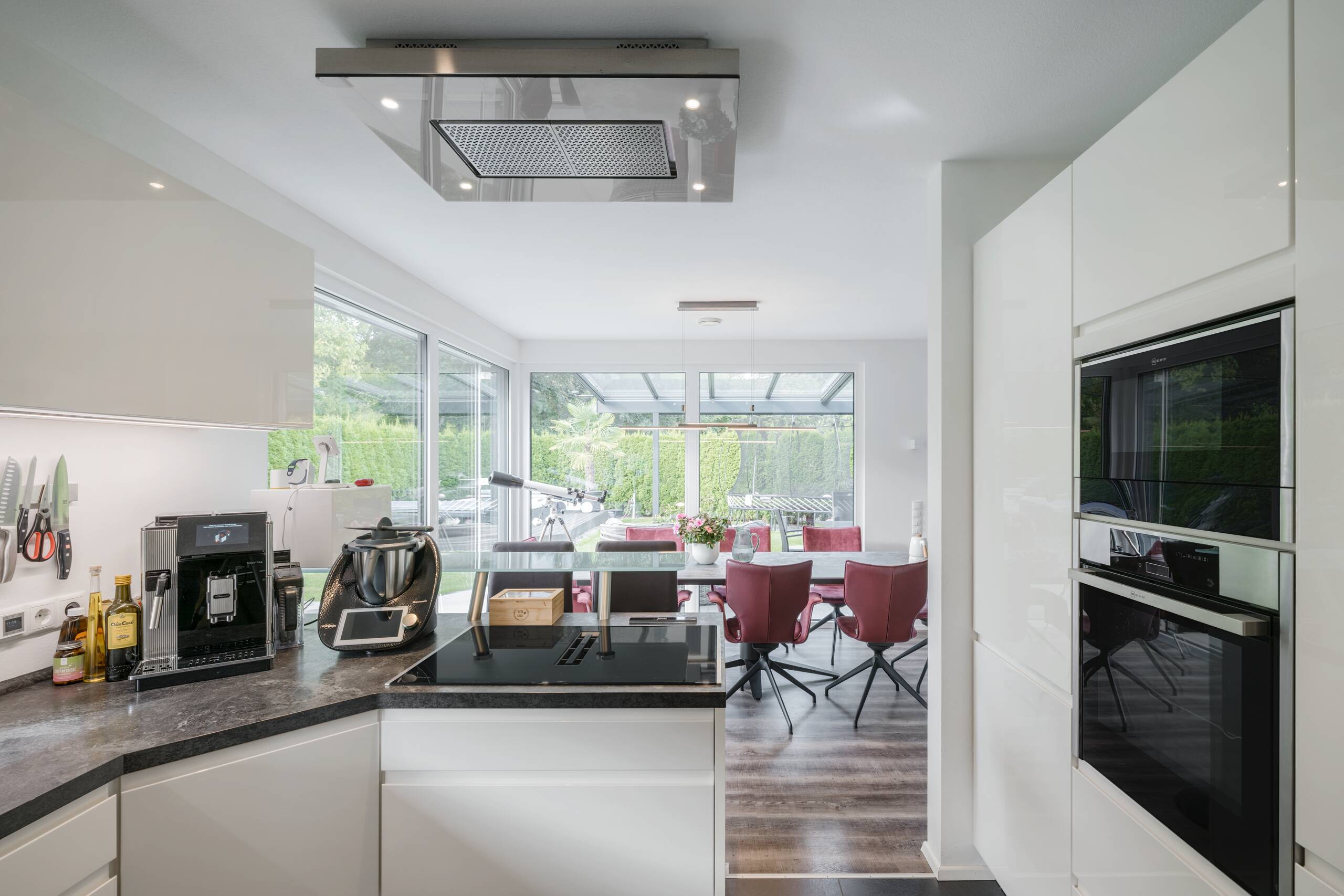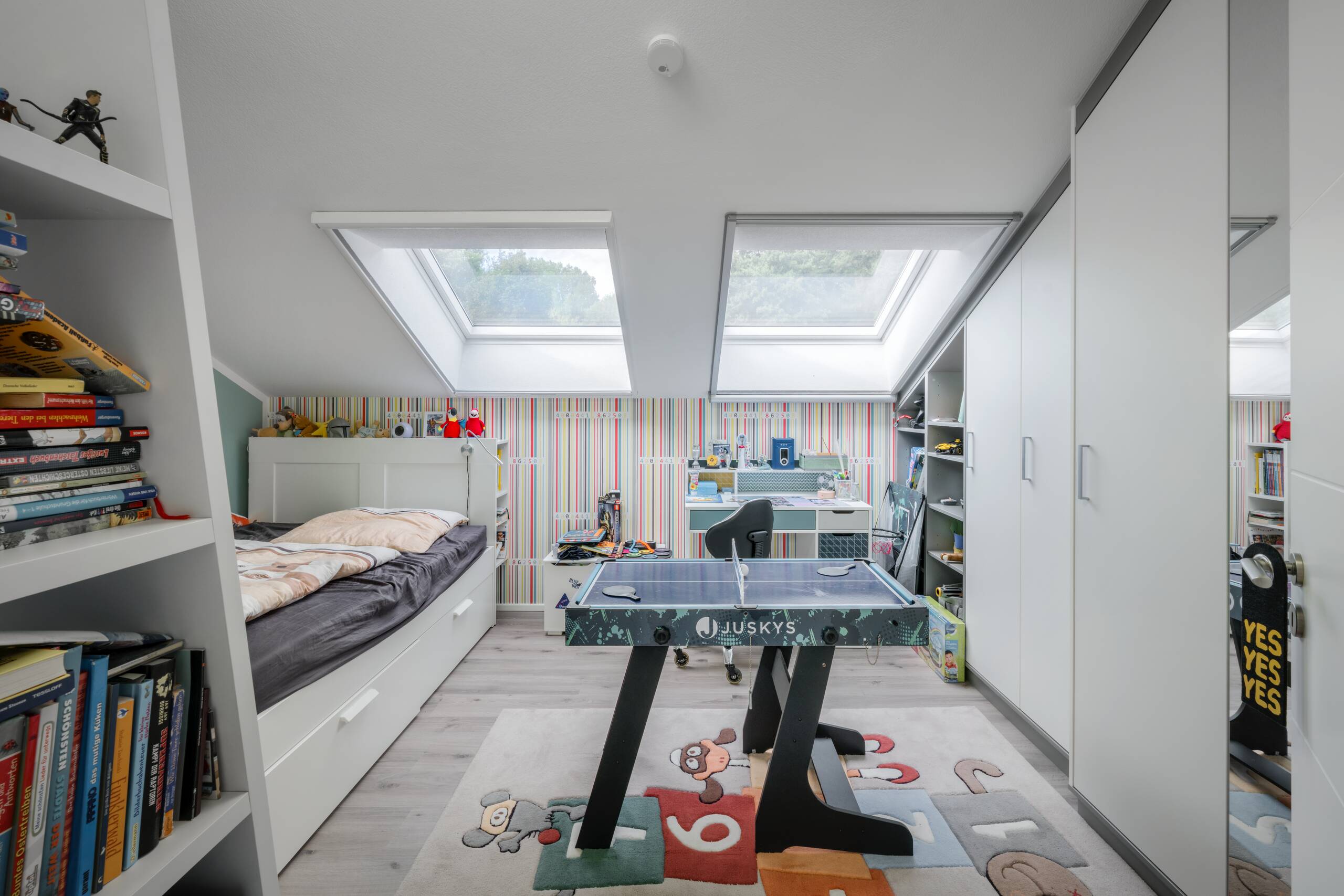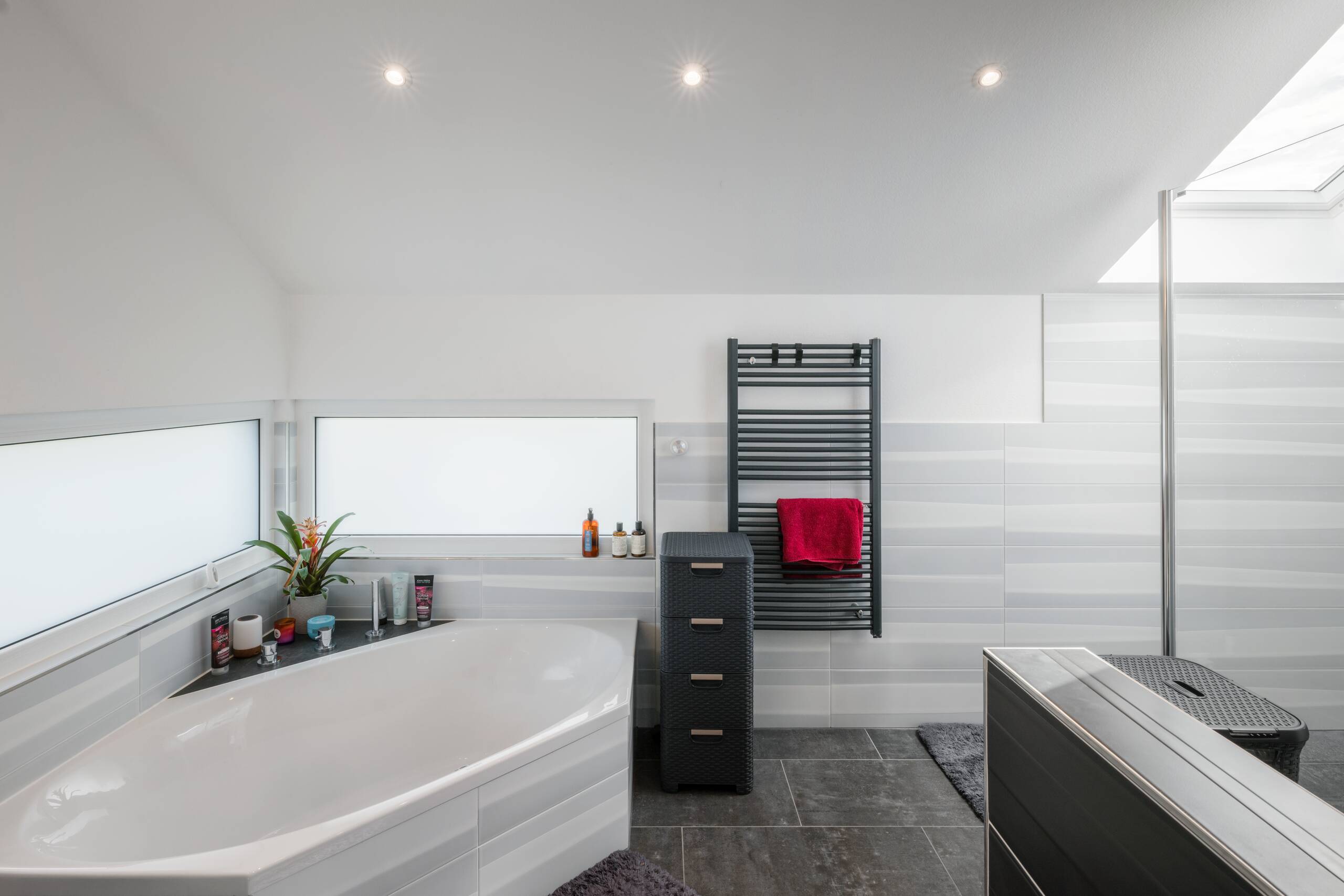 Dieses moderne Familienhaus zieht mit seiner ungewöhnlichen Dachform alle Blicke auf sich. Das versetzte Pultdach verleiht dem Gebäude nicht nur eine dynamische Silhouette, sondern bietet auch optimale Voraussetzungen für die Installation einer leistungsstarken Photovoltaikanlage. Der schlichte, weiß verputzte Baukörper wird erweitert von einer eingeschossigen Auslucht, die Platzgewinne im Innern schafft. Trotz seiner großzügigen Abmessungen von 13,66 x 8,10 m wirkt er leicht und offen. Das ist vor allem den Fenstern und Verglasungen in unterschiedlichsten Formaten zu verdanken.