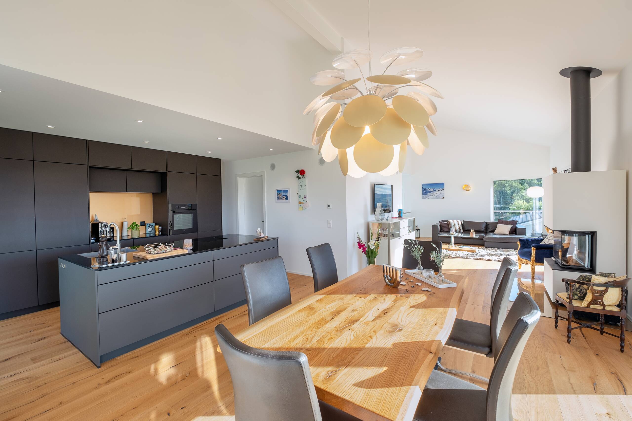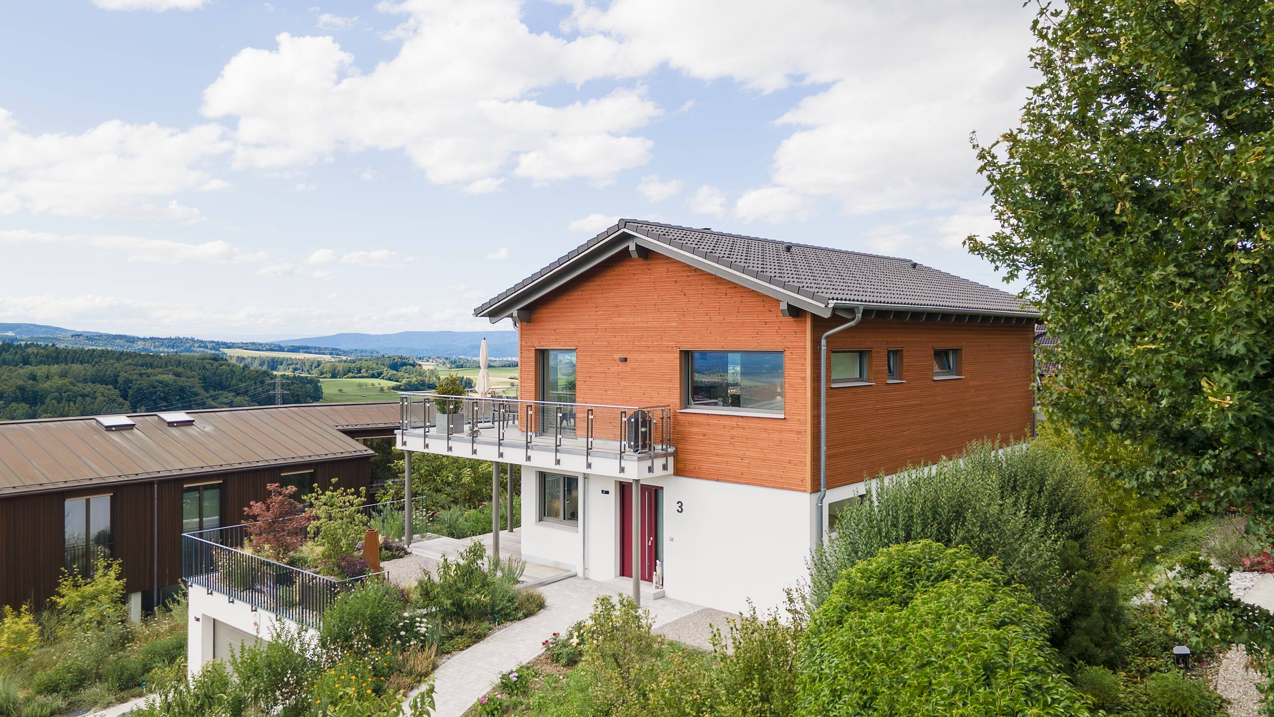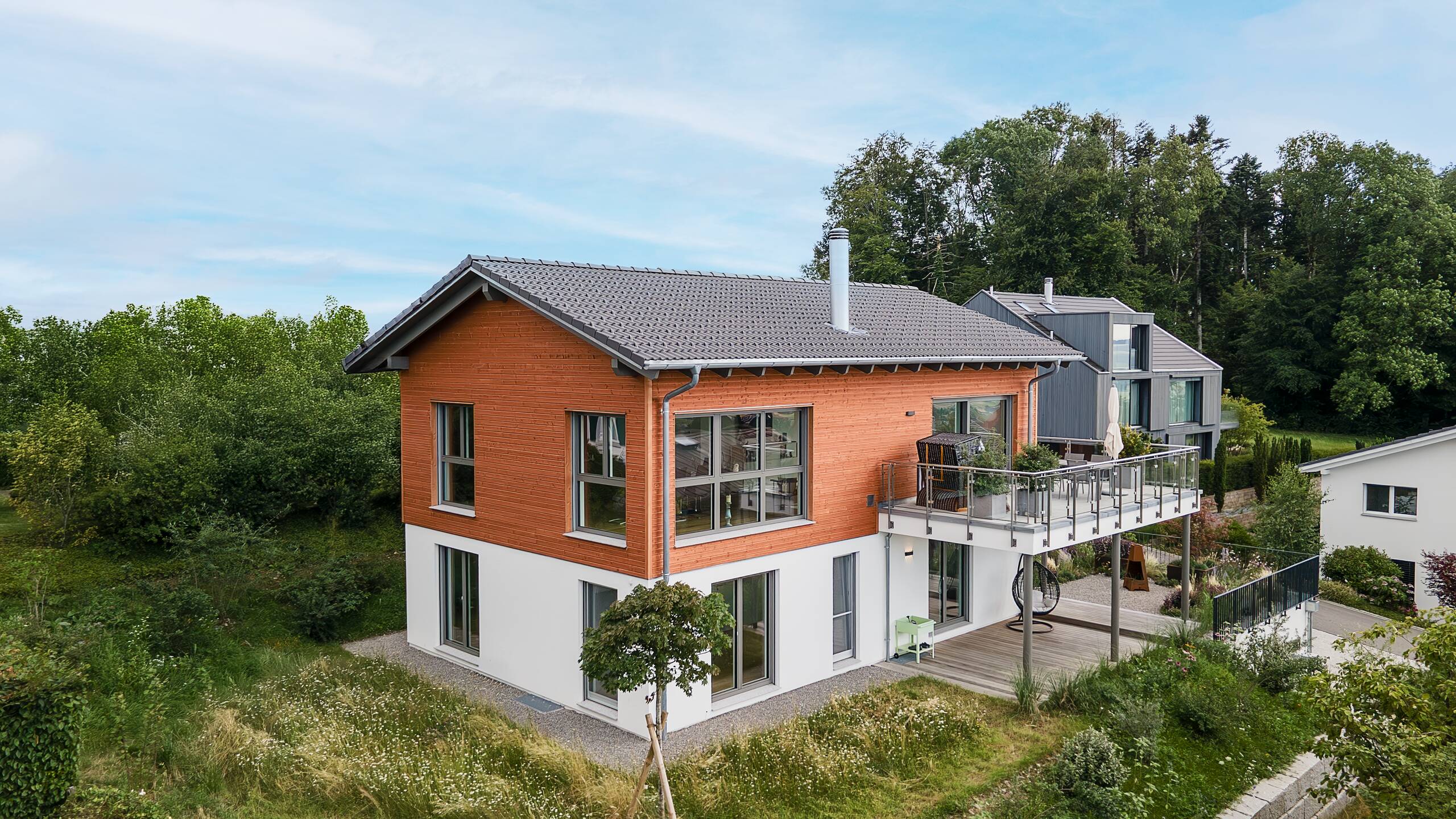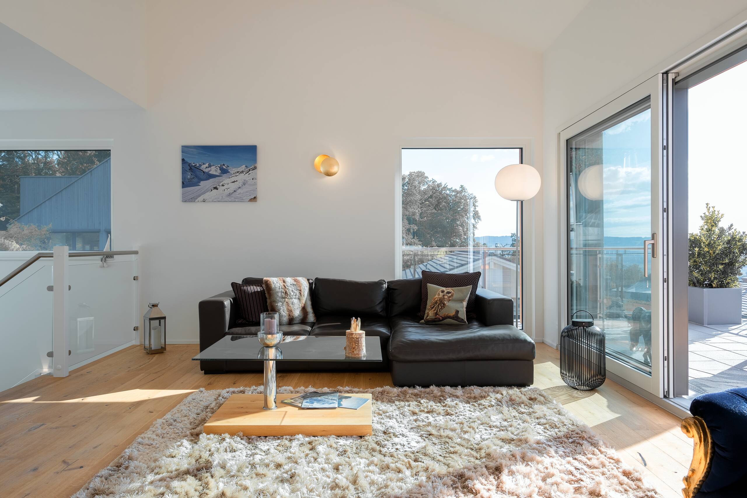 Das Haus nutzt die erhöhte Lage perfekt aus: Ein klarer Baukörper mit weißem Sockel und Holzfassade ruht im Gelände, darüber spannt sich ein klassisches Satteldach. Großzügige Verglasungen öffnen die Räume zur Landschaft, während der vorgelagerte Balkon wie ein Aussichtsplateau wirkt und den Blick weit über Hügel und Felder lenkt. Die Architektur wirkt ruhig und selbstverständlich, fast so, als wäre sie immer schon Teil dieser Landschaft.