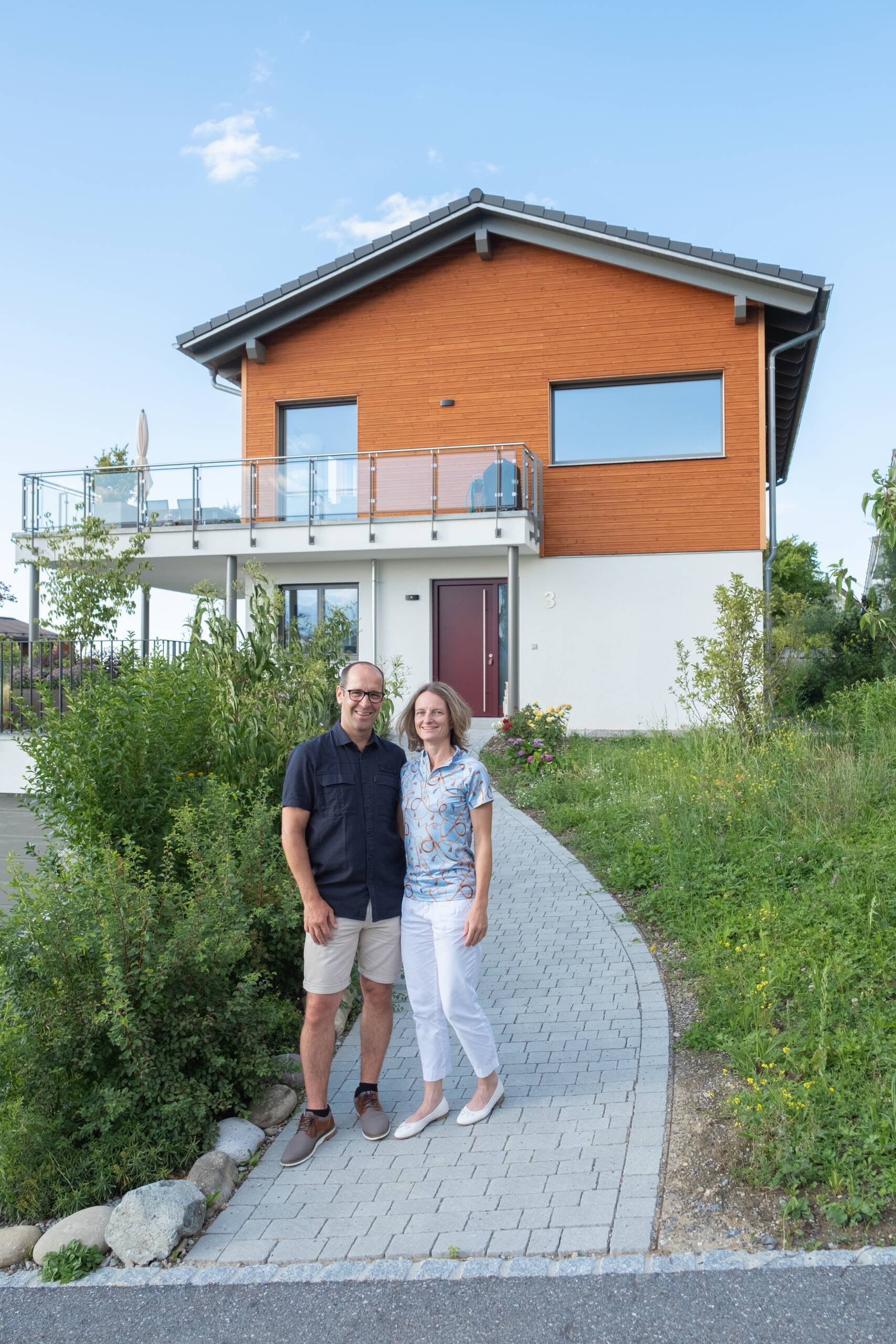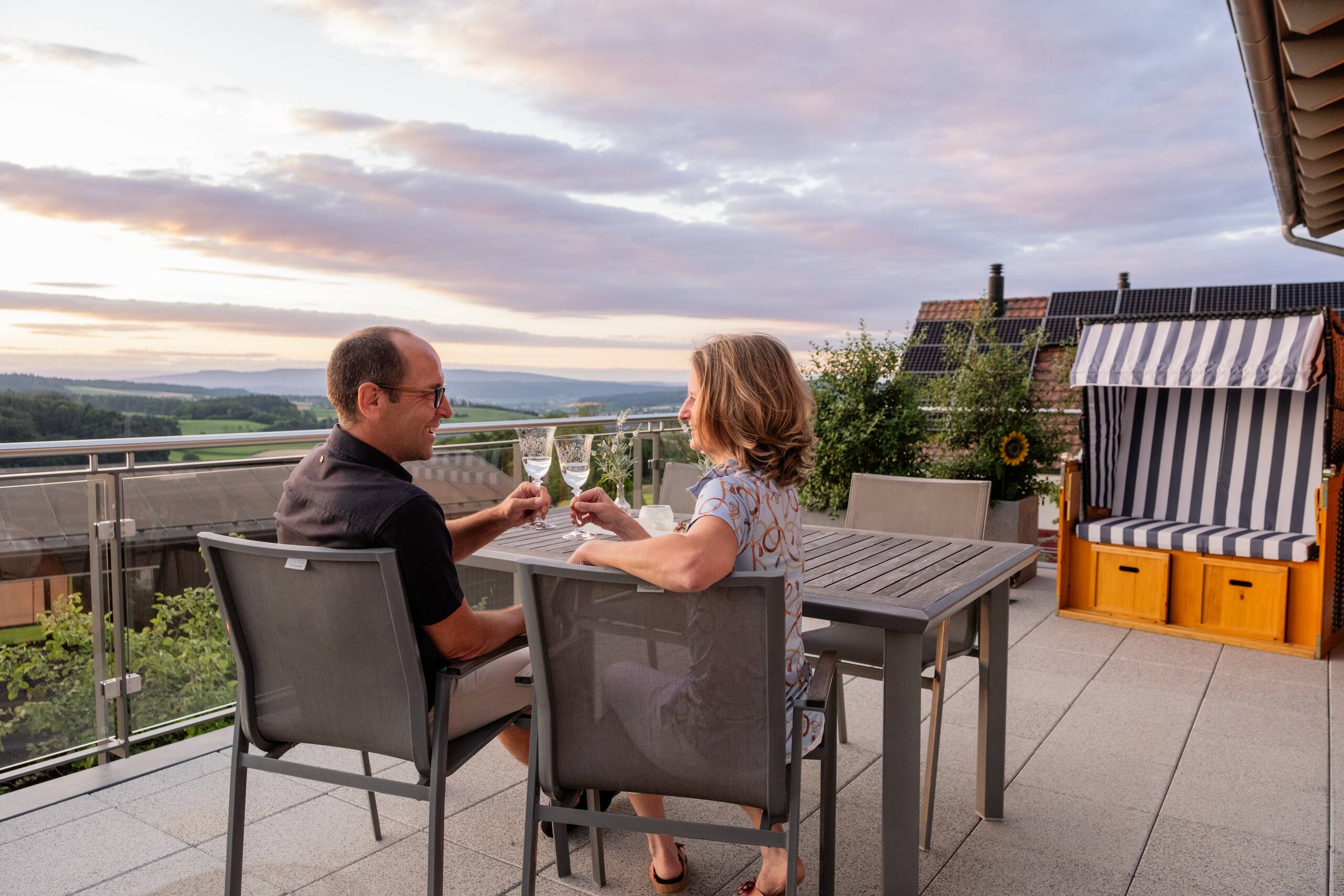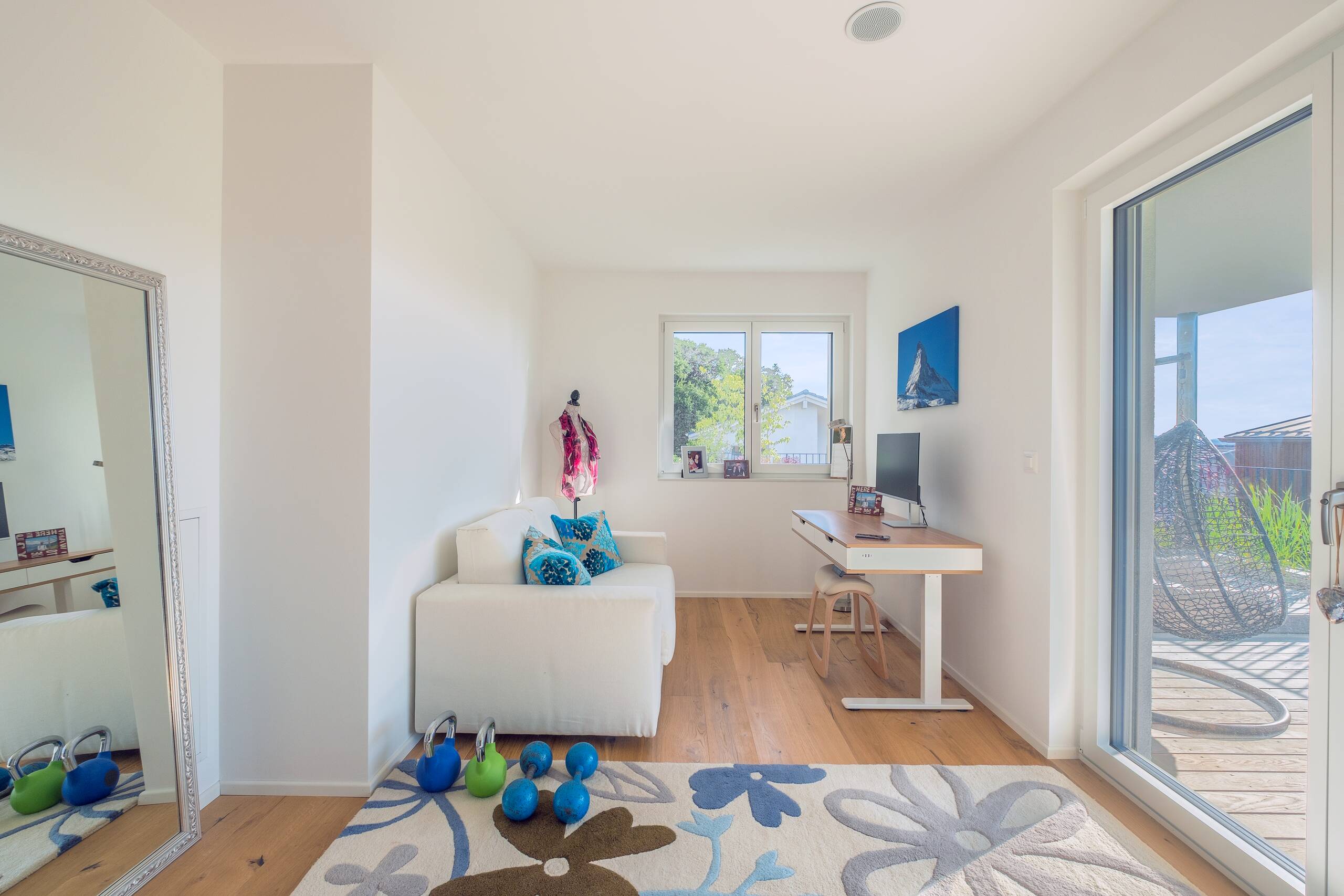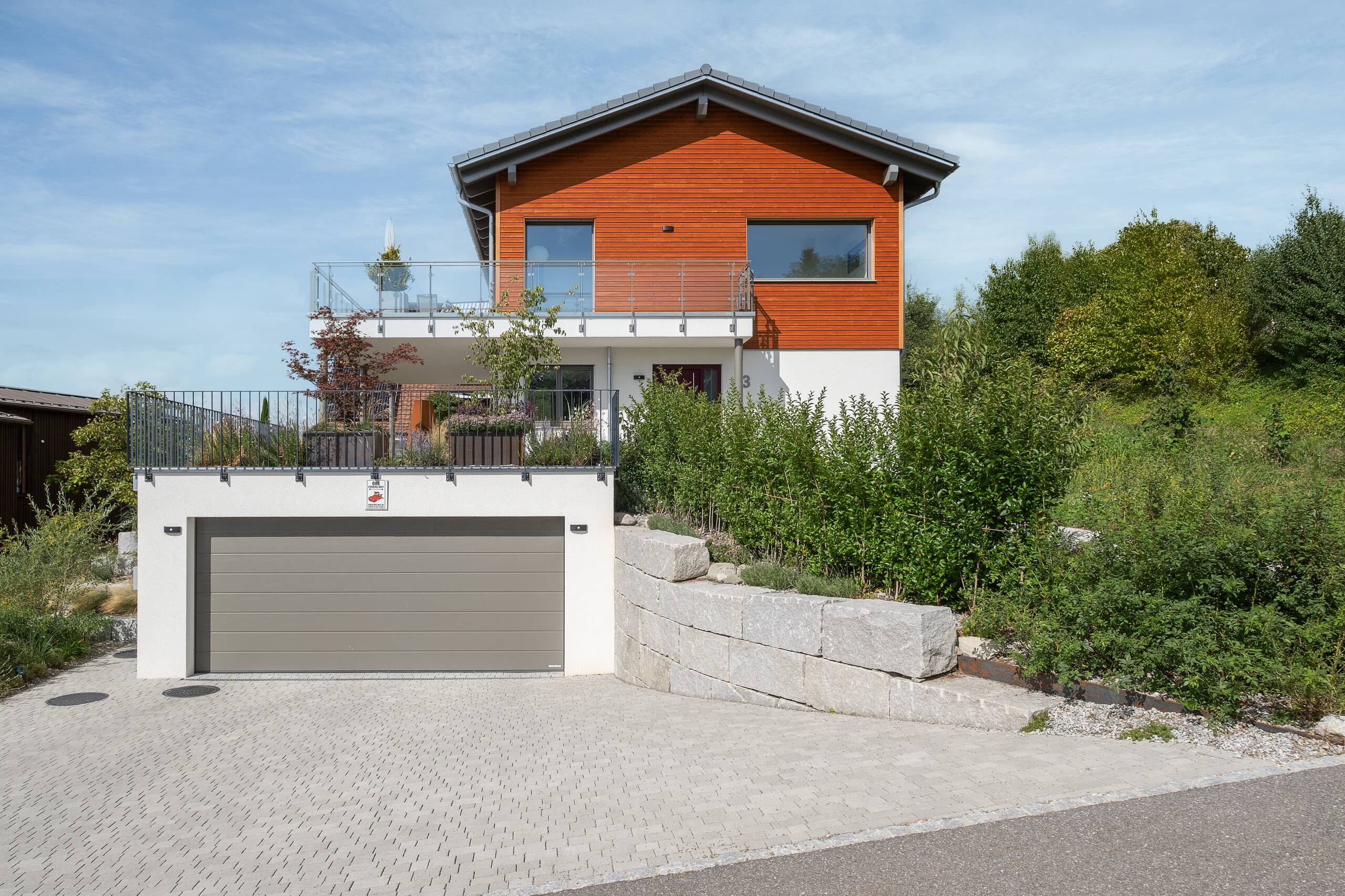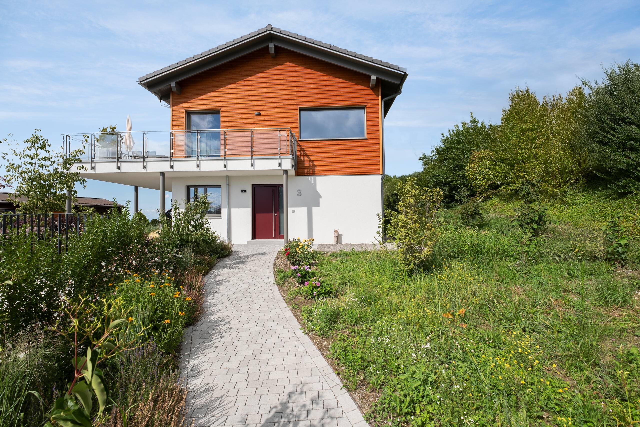 Das Haus nutzt die erhöhte Lage perfekt aus: Ein klarer Baukörper mit weißem Sockel und Holzfassade ruht im Gelände, darüber spannt sich ein klassisches Satteldach. Großzügige Verglasungen öffnen die Räume zur Landschaft, während der vorgelagerte Balkon wie ein Aussichtsplateau wirkt und den Blick weit über Hügel und Felder lenkt. Die Architektur wirkt ruhig und selbstverständlich, fast so, als wäre sie immer schon Teil dieser Landschaft.
