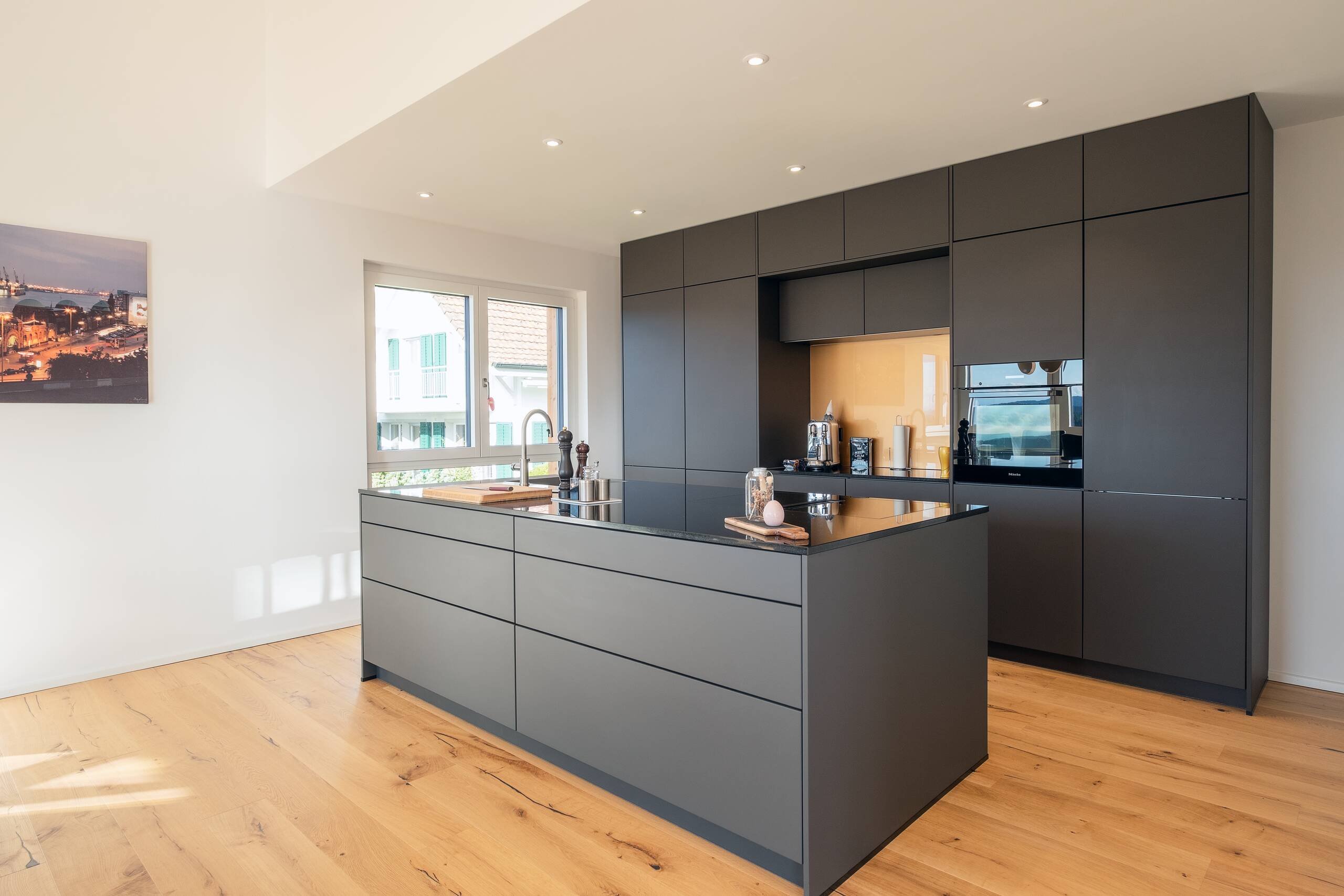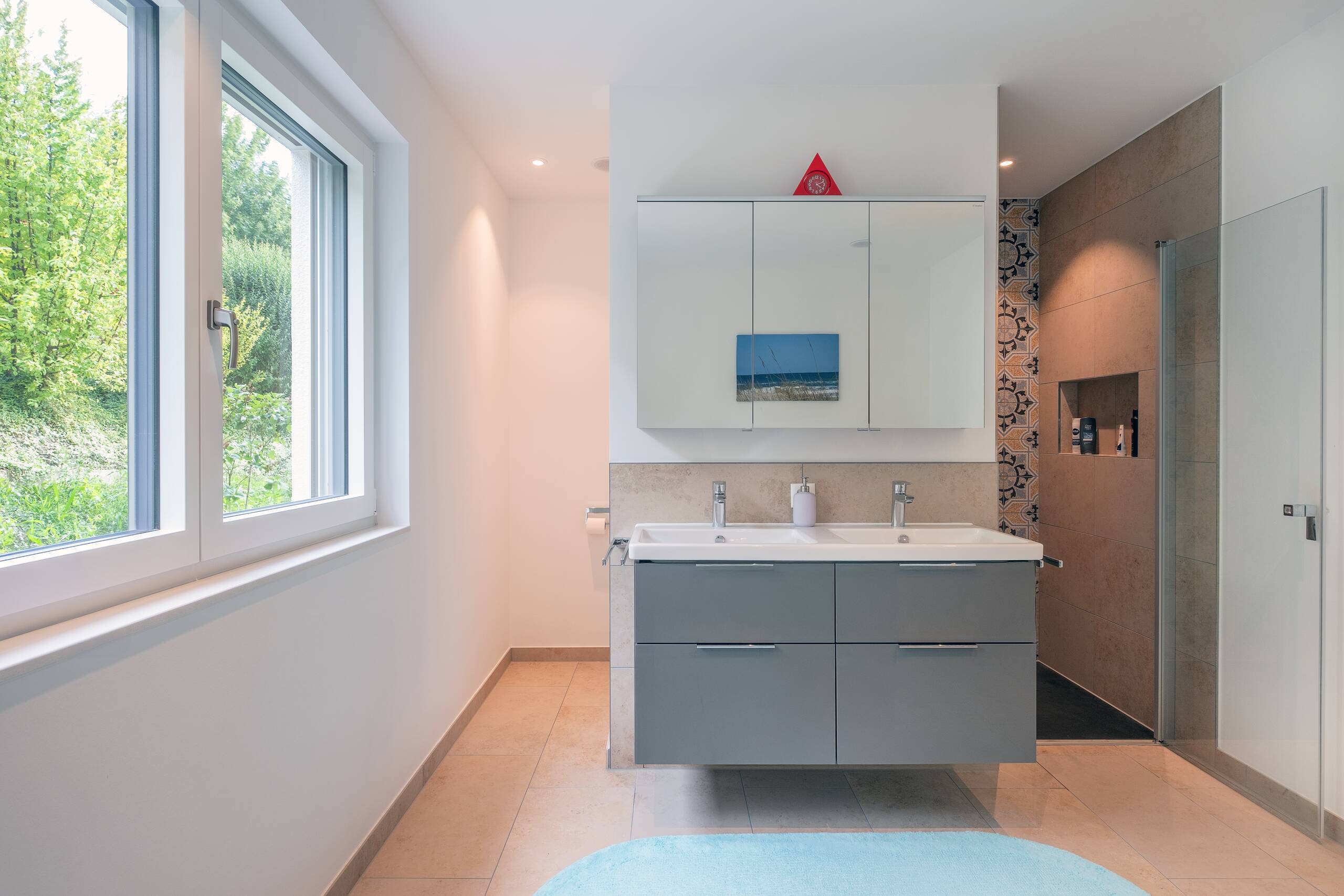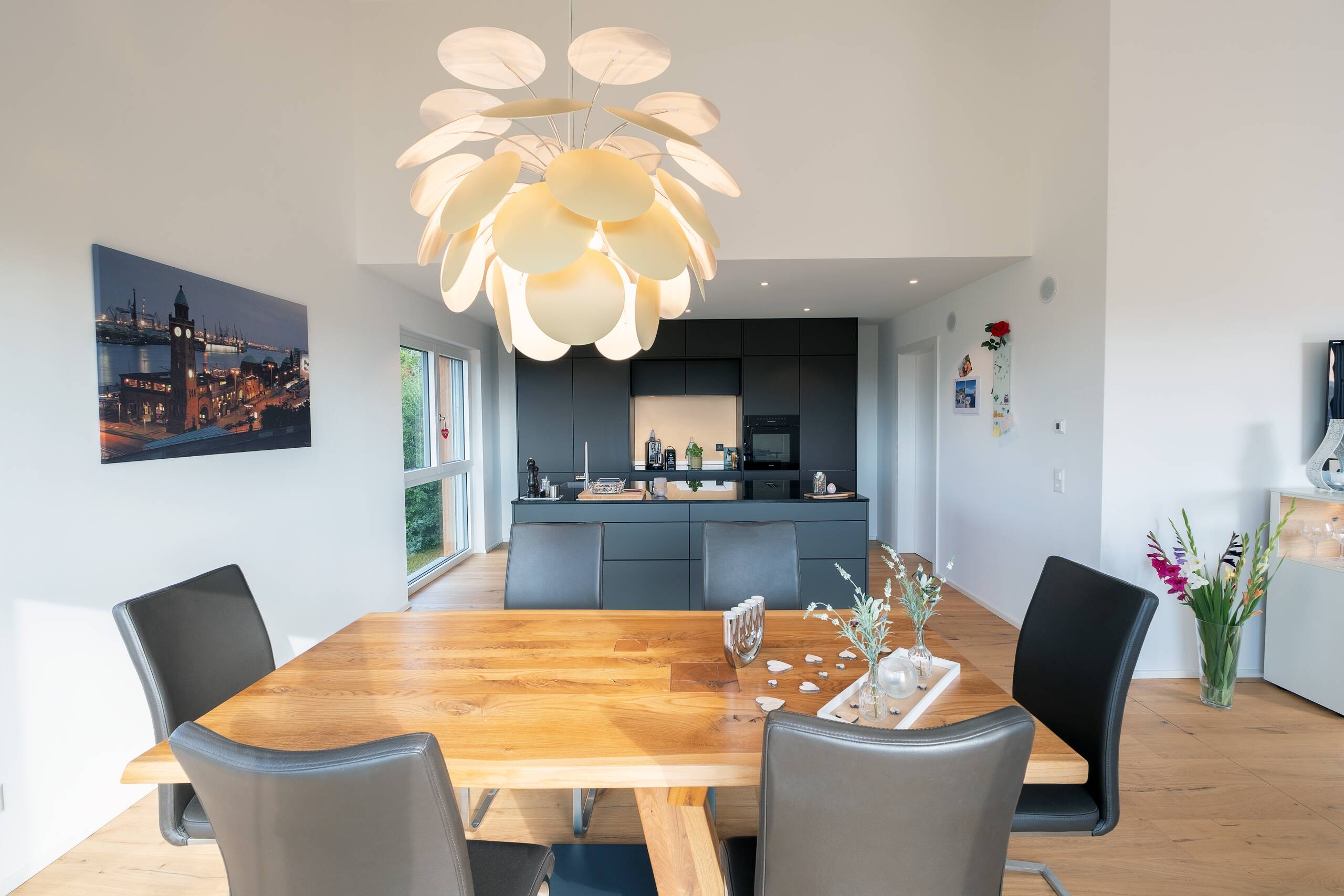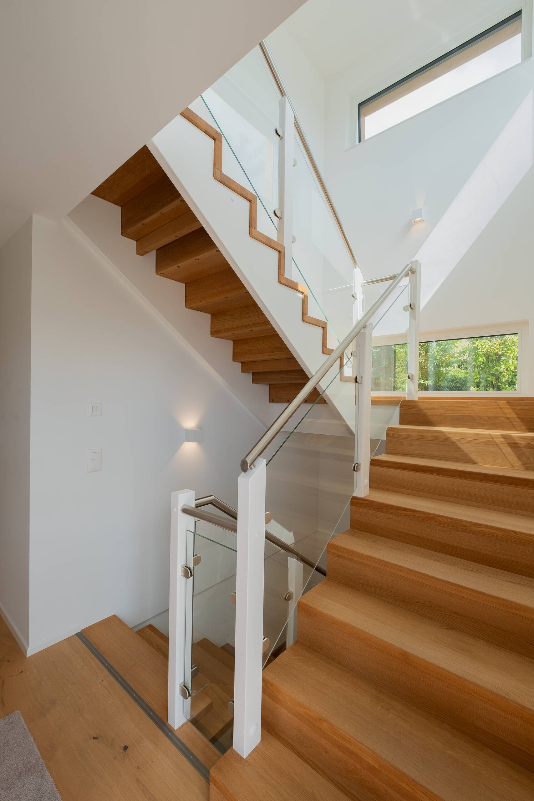 Das Haus nutzt die erhöhte Lage perfekt aus: Ein klarer Baukörper mit weißem Sockel und Holzfassade ruht im Gelände, darüber spannt sich ein klassisches Satteldach. Großzügige Verglasungen öffnen die Räume zur Landschaft, während der vorgelagerte Balkon wie ein Aussichtsplateau wirkt und den Blick weit über Hügel und Felder lenkt. Die Architektur wirkt ruhig und selbstverständlich, fast so, als wäre sie immer schon Teil dieser Landschaft.