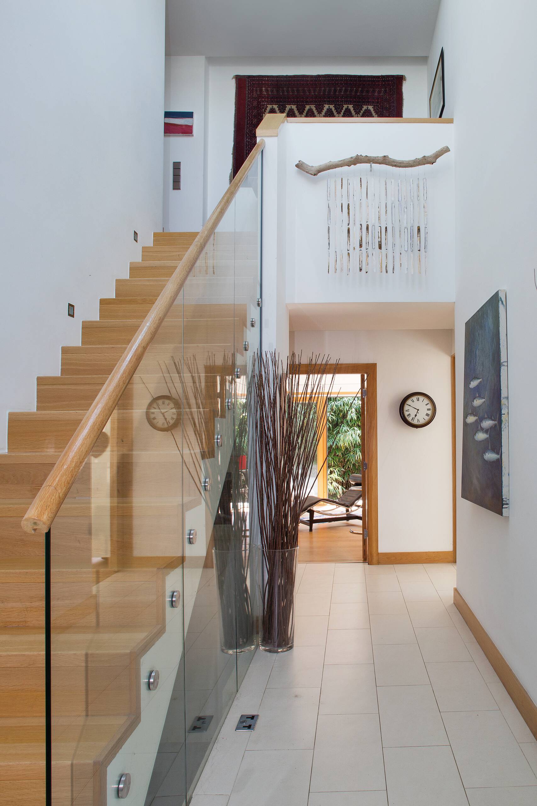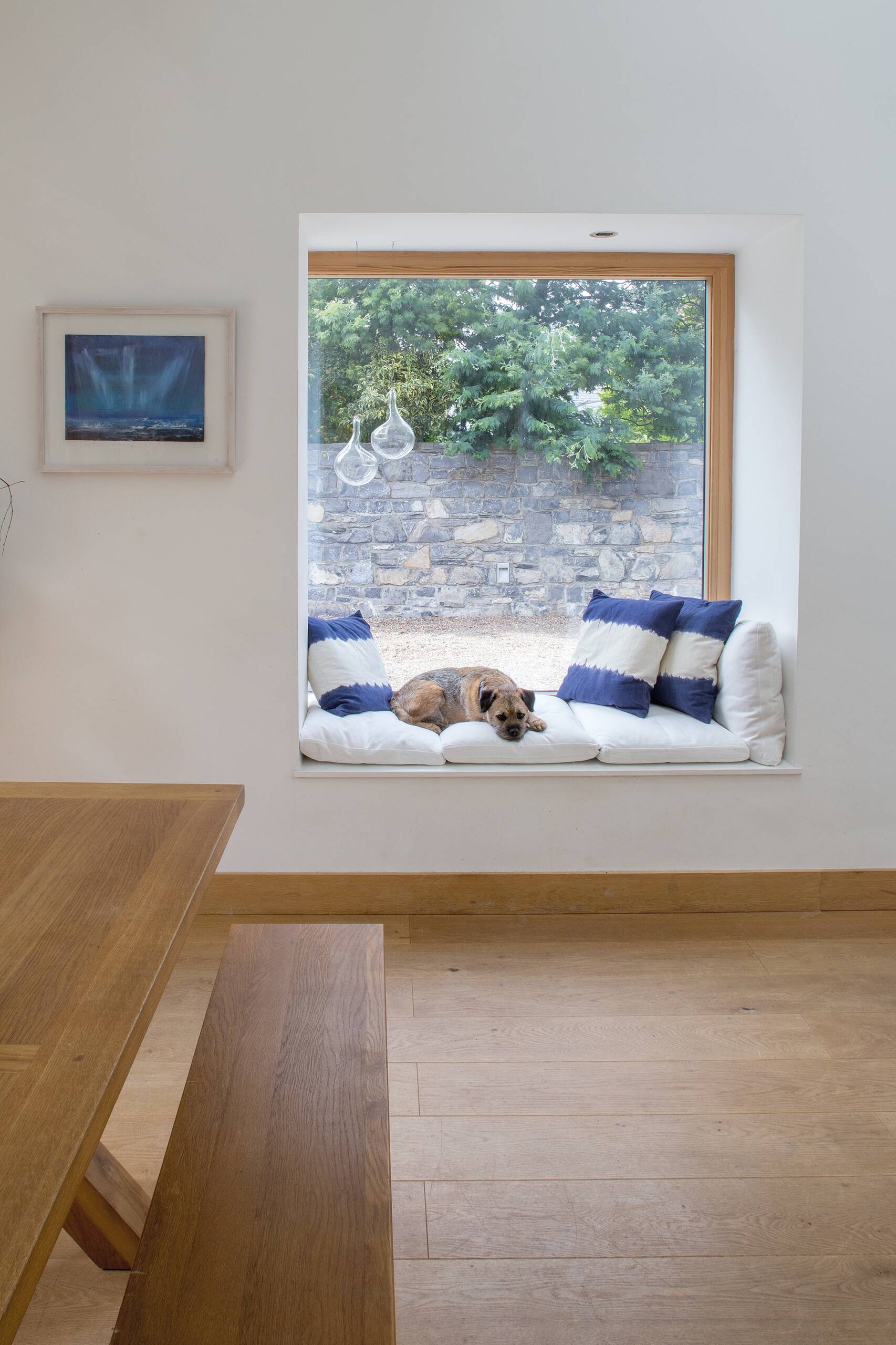 Der Blick nach draußen gibt wundervolle Momente des Gartens frei, während die Wahl des Fensterformates vergessen lässt, dass man sich hier inmitten von Dublin befindet. Große Glasschiebetüren führen nach draußen, wodurch Haus und Grünfläche zu einem Lebensraum miteinander verschmelzen. Das einladende Innere des Hauses wird von Tageslicht geflutet. “Wir wollten etwas Dramatisches, also haben wir Licht aus drei verschiedenen Richtungen”, verkünden die Besitzer stolz.