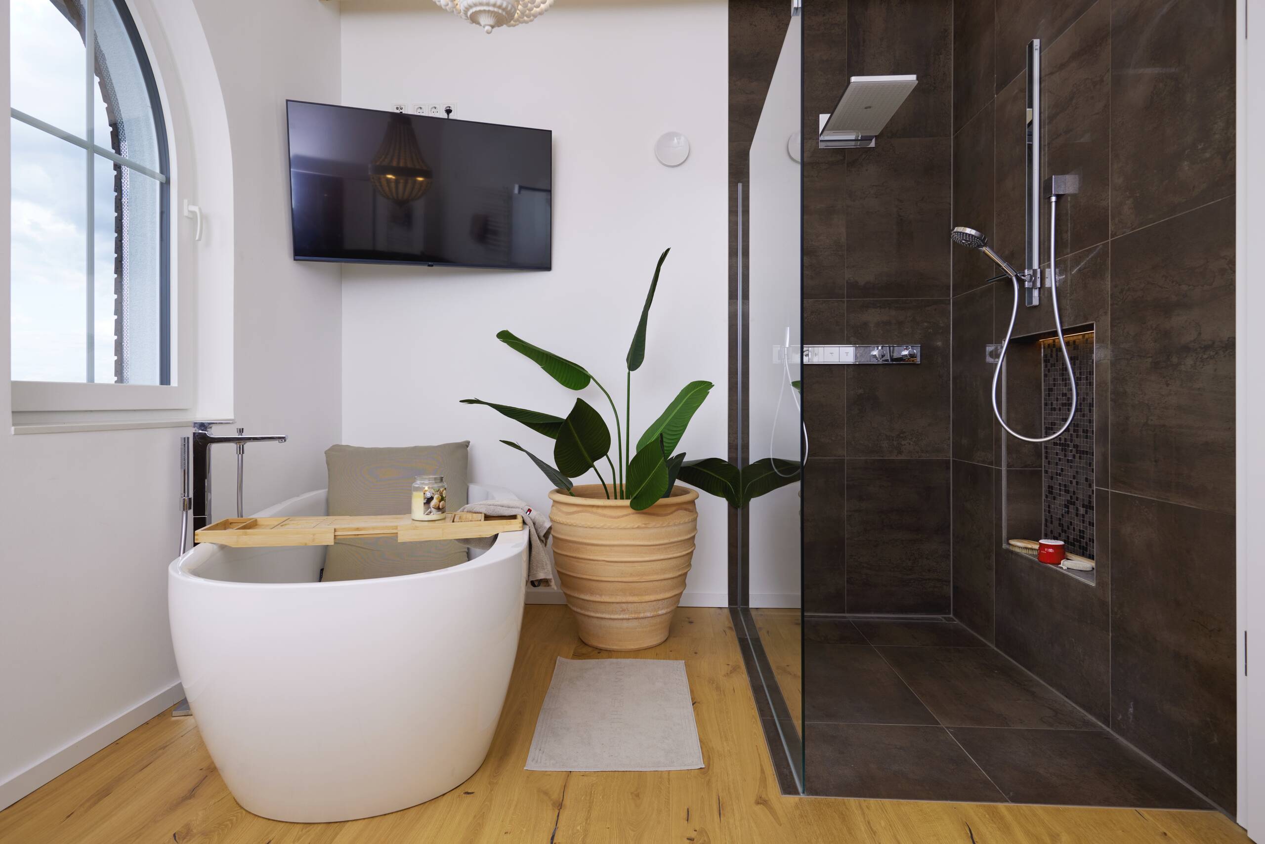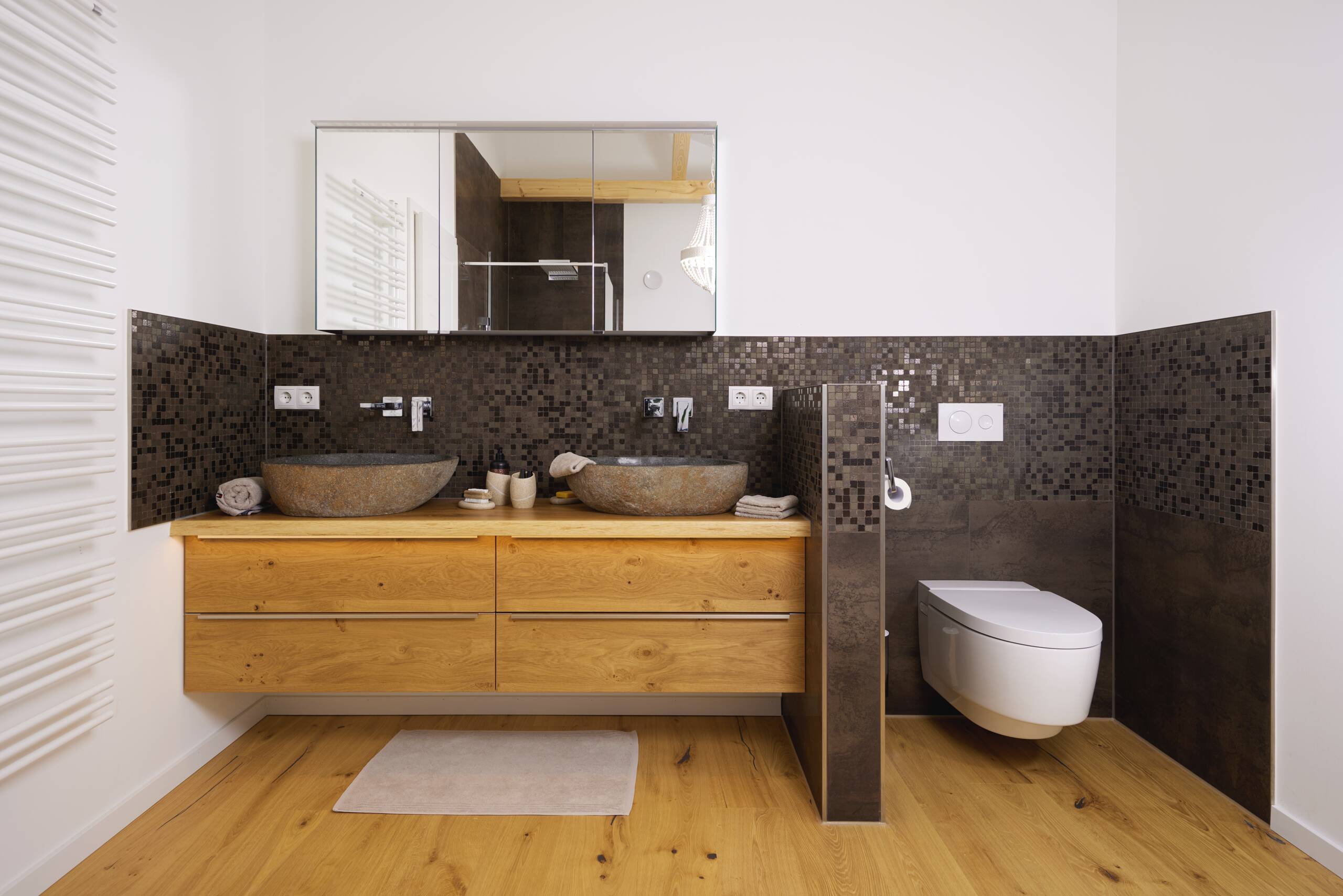 Als Teil eines großen Trainings- und Zuchtbetriebs für Westernpferde war klar, dass sich das neue Wohnhaus im modernen Western-Look präsentieren sollte. Für Cowboy-Romantik sorgen unter anderem das von Stützen getragene Vordach, die halbrunden Fenster, die beiden Loggias auf der Gartenseite sowie rotbraune Holzverschalung am Obergeschoss. Das Untergeschoss hüllt sich in rustikale Steinverblender, die dem Gebäude einen mediterranen Touch verleihen.