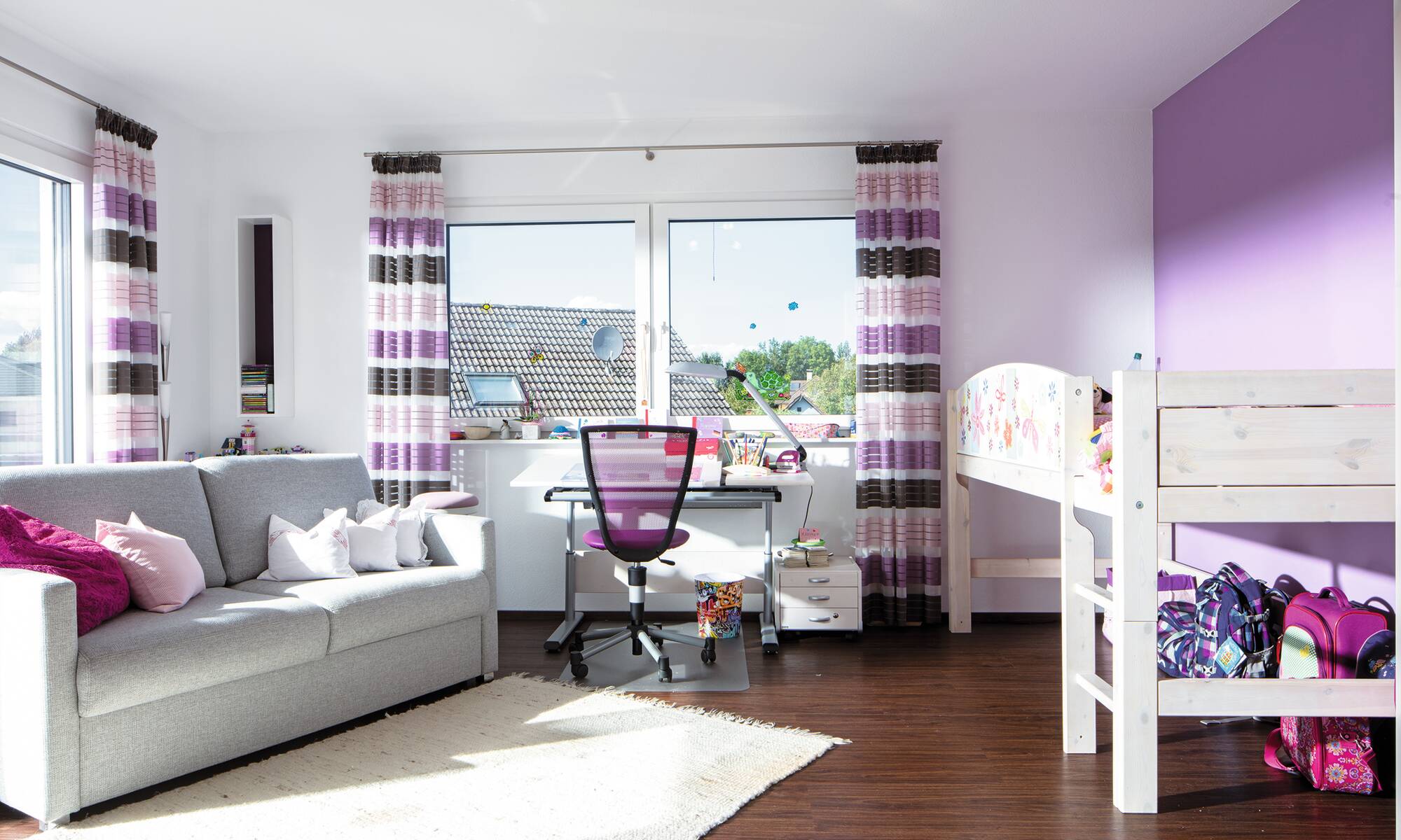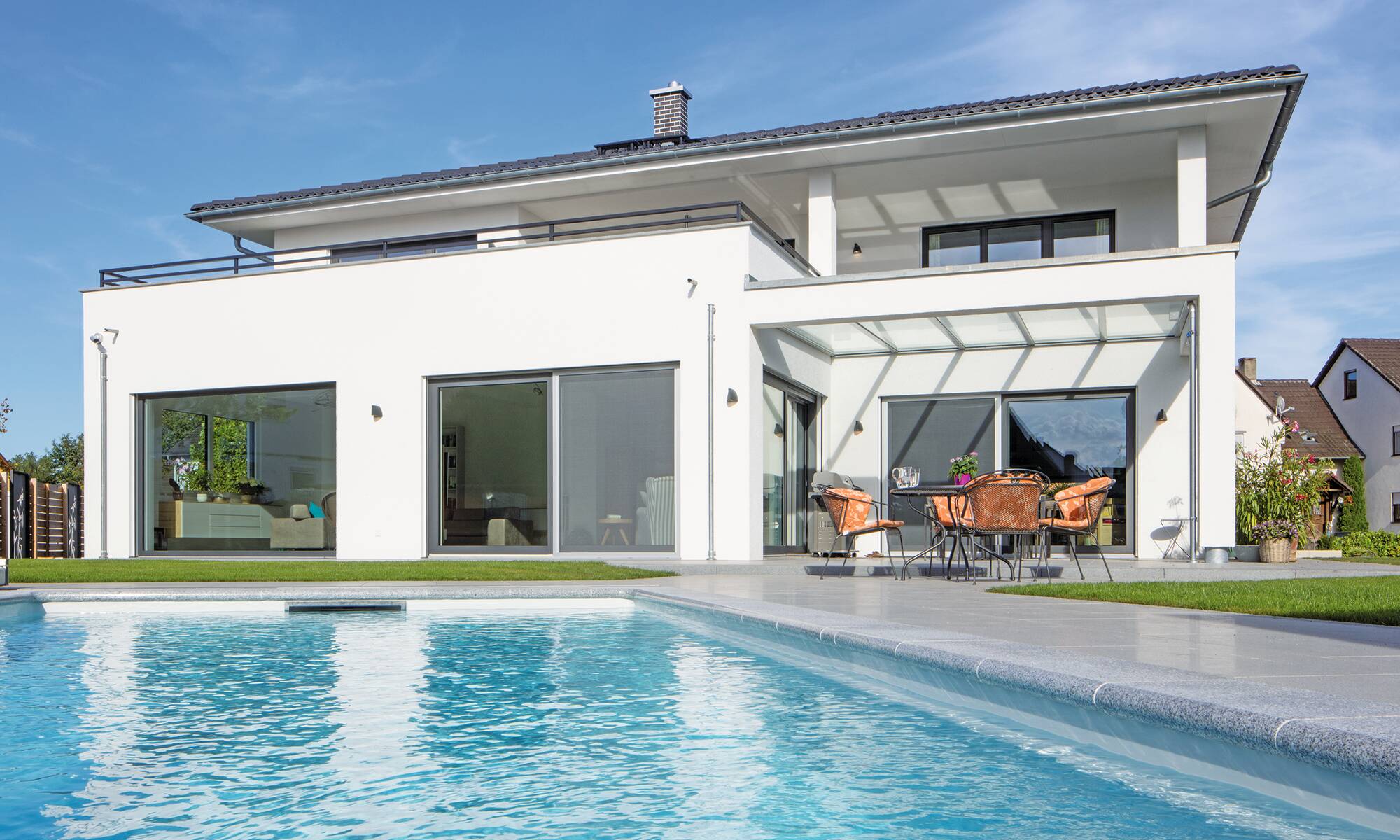 Keine Wünsche offen lässt dieses Traumhaus mit Pool und Sauna. Das moderne Stadthaus mit überdachter Terrasse wurde von einem Architekten für eine sechsköpfige Familie aus Baden geplant. Durch die großen Glasflächen kommt viel Tageslicht ins Innere. Die offene Küche geht fließend in den Wohn- und Essbereich über. Glastüren verstärken den Eindruck von Weitläufigkeit. Eine moderne Holztreppe in schwarz-weiß fungiert als Blickfang und verbindet die drei Stockwerke. Auf jeder Etage eröffnet sich eine neue Wohnwelt. Während unten neben dem Wohn- und Essbereich auch das Elternschlafzimmer mit Ankleide untergebracht ist, befinden sich oben die vier Kinderzimmer. Insgesamt stehen über 300 Quadratmeter Wohnraum zur Verfügung. Auf der großzügigen Dachterrasse kann die Familie abends die Sonnenuntergänge genießen.