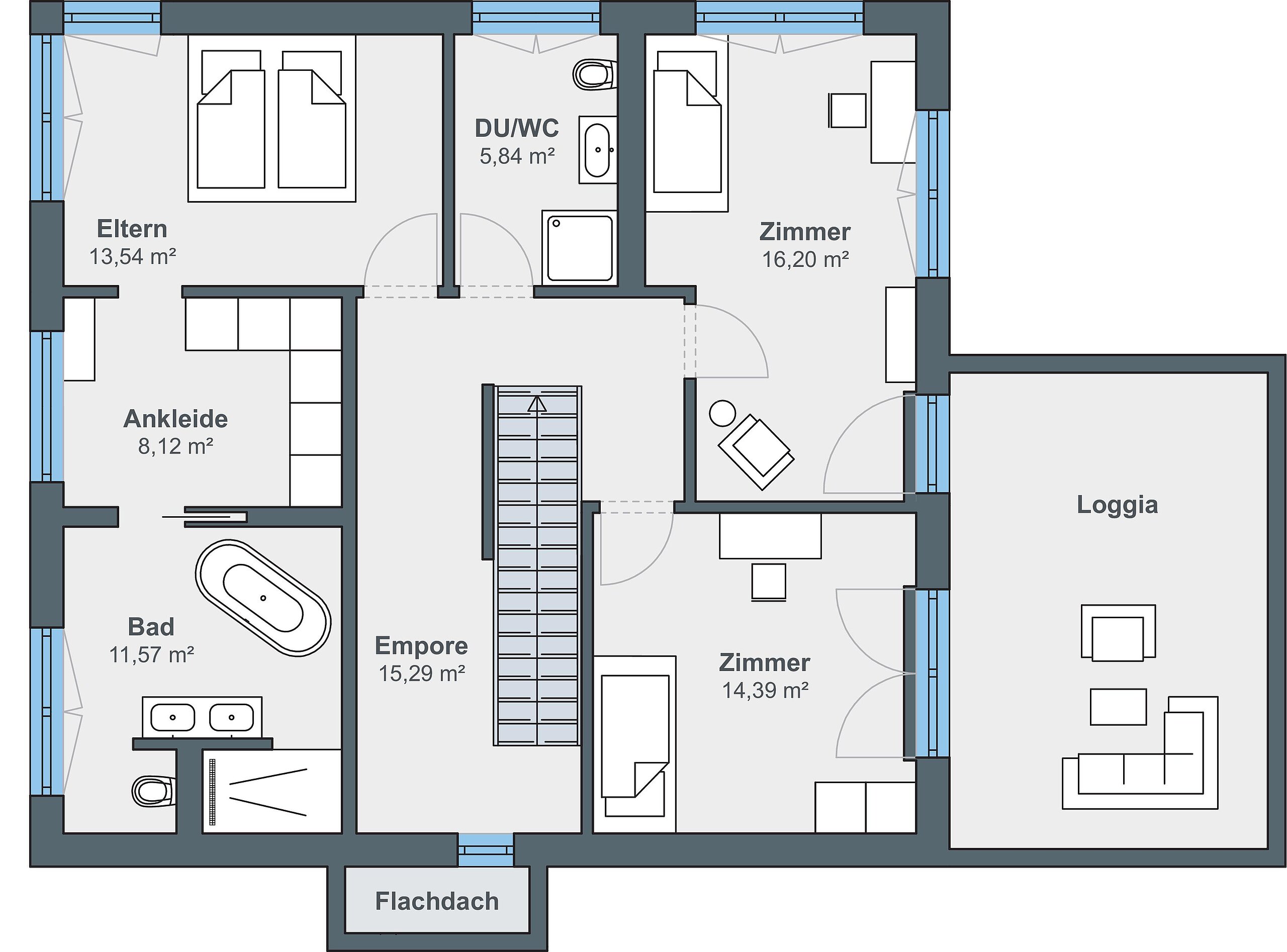Unter dem Dach befinden sich die Ruhe- und Privaträume der Familie. Lieblingsplatz der Kinder sind natürlich die beiden hellen Kinderzimmer mit Zugang zur Loggia. „Die Große hat am Obergeschoss aktiv mitgestaltet. So waren zum Beispiel ein eigenes Bad mit Dusche und der Balkon ein Muss“, lacht Nicole Meyer. Den Eltern steht ein großes Schlafzimmer mit angrenzender Ankleide und Bad zur Verfügung.