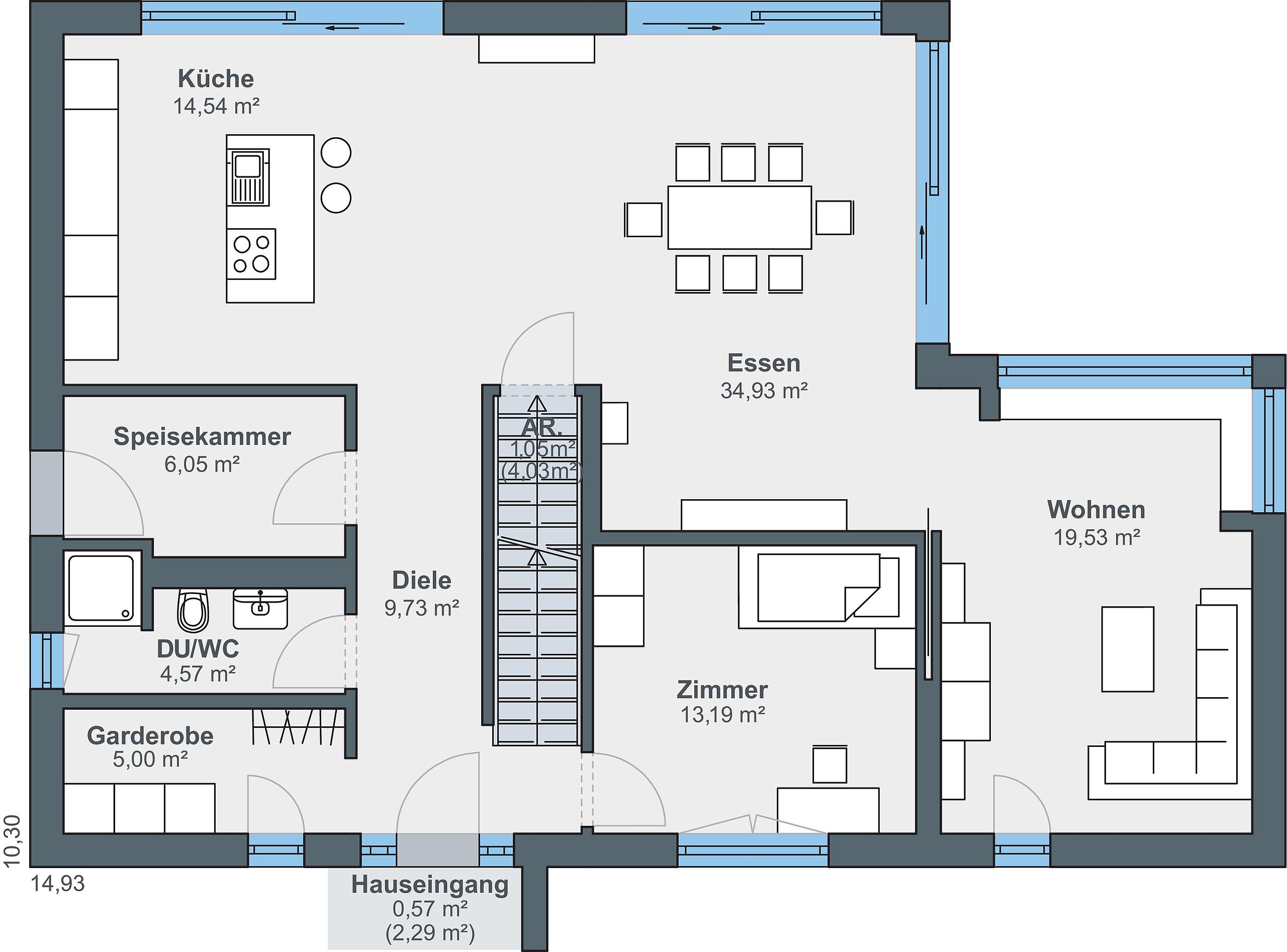 Bei der Innenausstattung legte das Paar Wert auf natürliche und nachhaltige Materialien. „Wir haben viel mit Holz und Stein gearbeitet“, berichtet Nicole Meyer. Kombiniert mit Glas entsteht ein luftiges, modernes Ambiente, das trotzdem Gemütlichkeit ausstrahlt. Empfangen werden die Bewohner und Besucher von einer hellen Diele, an die sich links eine Garderobe anschließt. „Wenn man hereinkommt, kann man hier gleich Jacken, Schuhe, Taschen und all das, was man täglich braucht, verstauen“, sagt Daniel Meyer. Vorbei an einem Gästezimmer, einem Gästebad mit Dusche und einer Speisekammer geht es in den weitläufigen Wohn-, Ess- und Kochbereich, der sich über eine gläserne Lofttür vom Eingangsbereich abtrennen lässt. „Die Tür soll den Raum nicht komplett verschließen, sondern einfach ein bisschen hervorheben“, so der Bauherr. „Zudem dient sie natürlich auch als Wind- und Schallschutz.“ Schon beim Betreten der Gemeinschaftsräume stellt sich dank der großzügigen Verglasungen ein beeindruckendes Raumgefühl ein, das durch die Geschosserhöhung noch verstärkt wird. Ein Highlight ist das Eck-Sitzfenster: Mit vielen kuscheligen Kissen bestückt, verspricht es gemütliche Stunden bei guter Musik oder einem spannenden Buch.