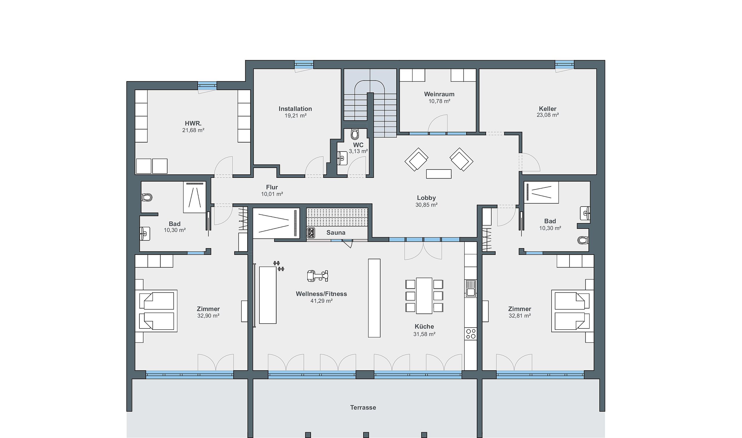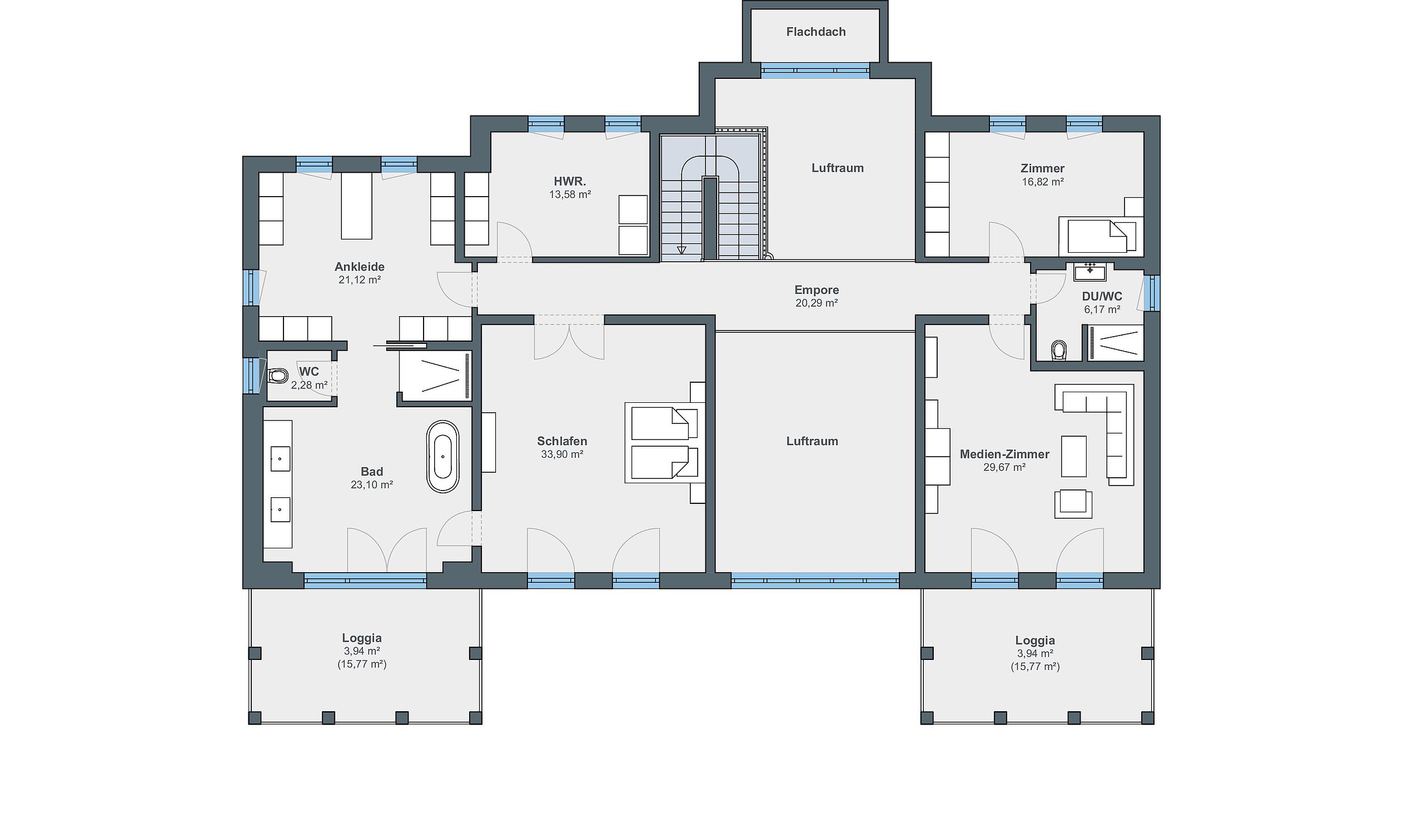 Das Obergeschoss teilt sich in zwei Trakte: Auf der rechten Seite befindet sich der Bereich der Eheleute, bestehend aus Schlafzimmer, Ankleide und luxuriös ausgestattetem Badezimmer. Auf der linken Seite liegen der Medienraum sowie ein weiteres Schlafzimmer mit Duschbad. An beide Trakte ist jeweils eine überdachte Loggia angeschlossen. Weit reicht von hier der Blick über die malerische Landschaft bis hin zur Skyline von Frankfurt. Das Untergeschoss ist für die erwachsenen Kinder reserviert. Hinter ihren Rückzugsbereichen befinden sich Abstell- und Technikräume.